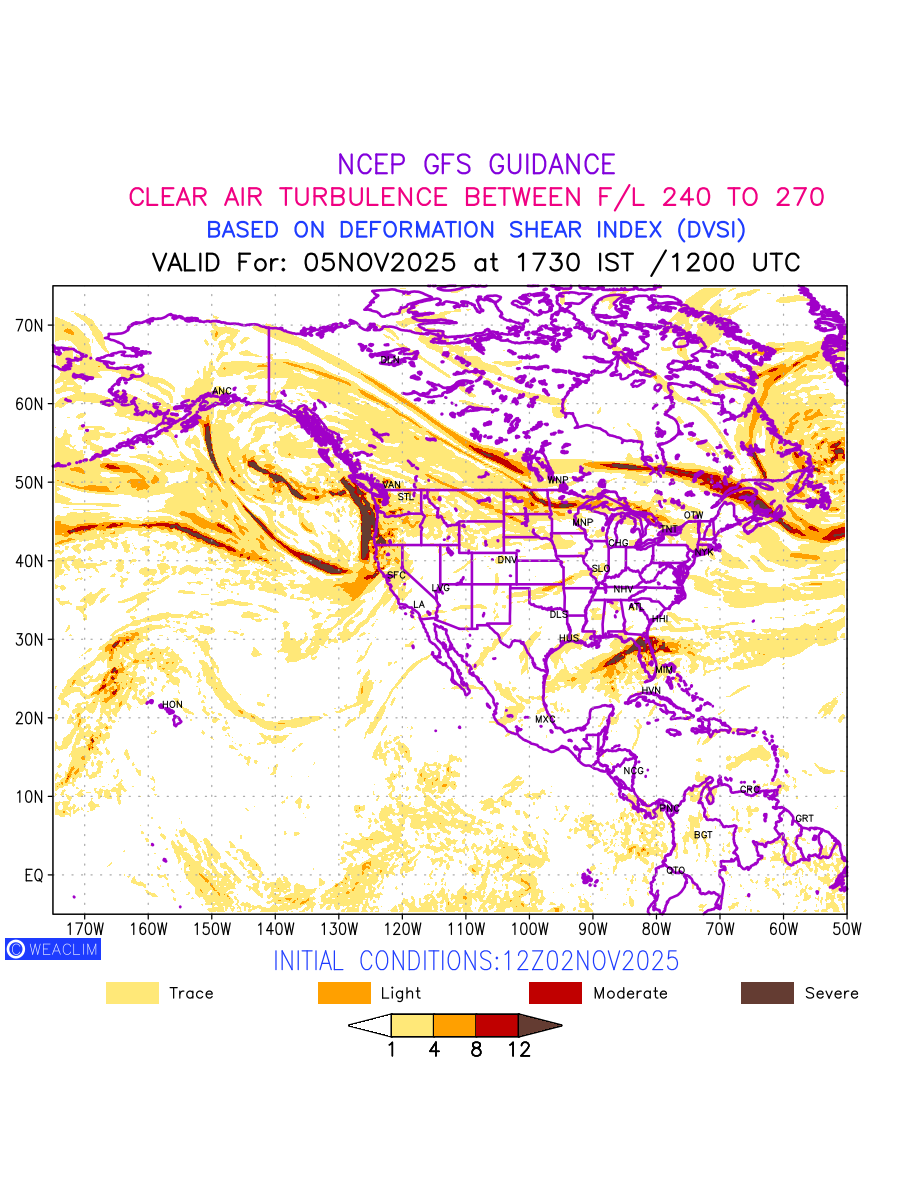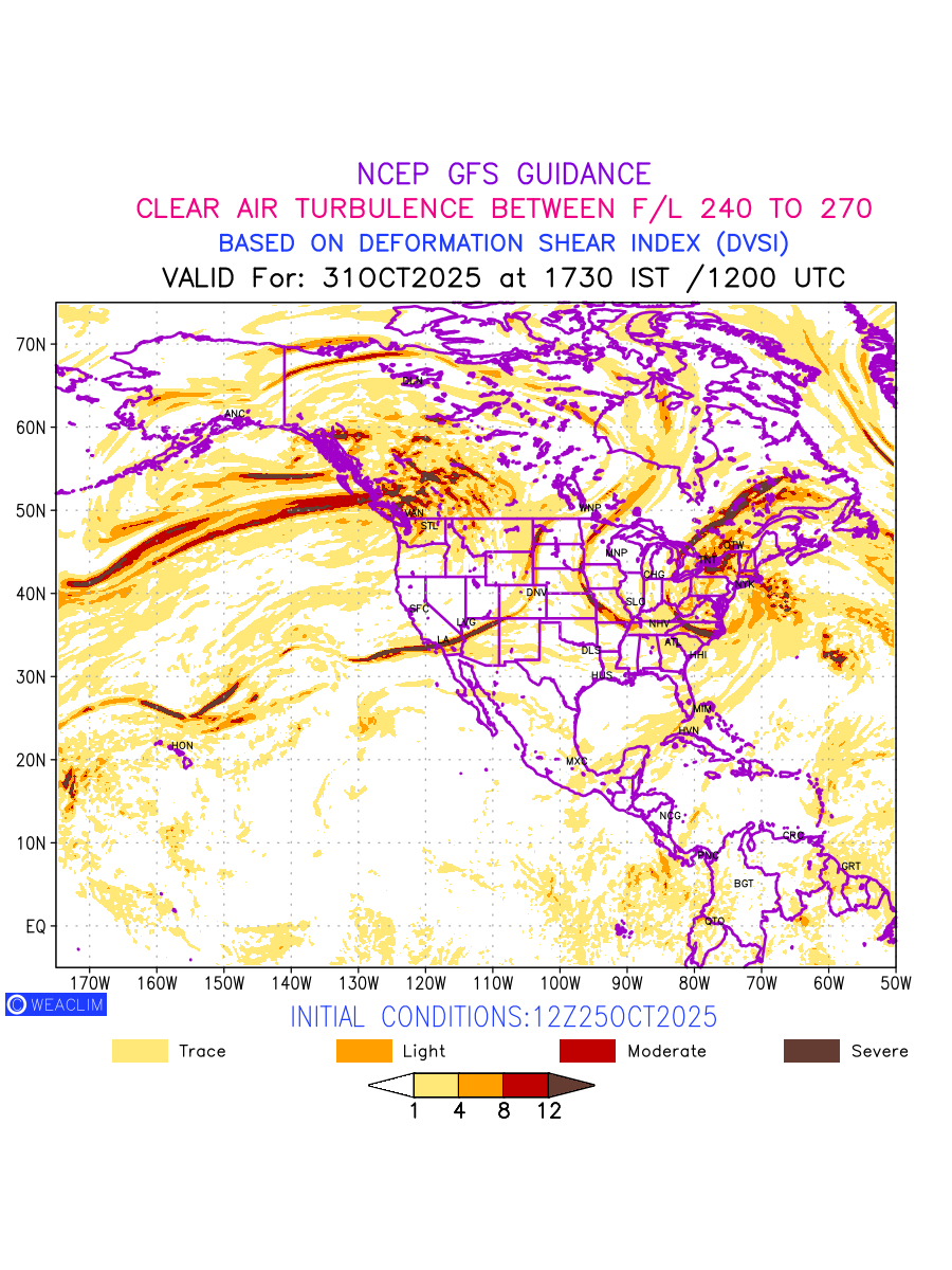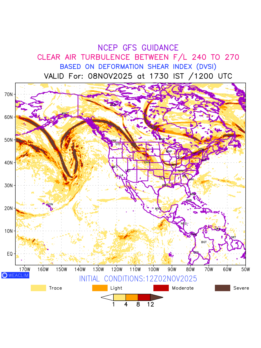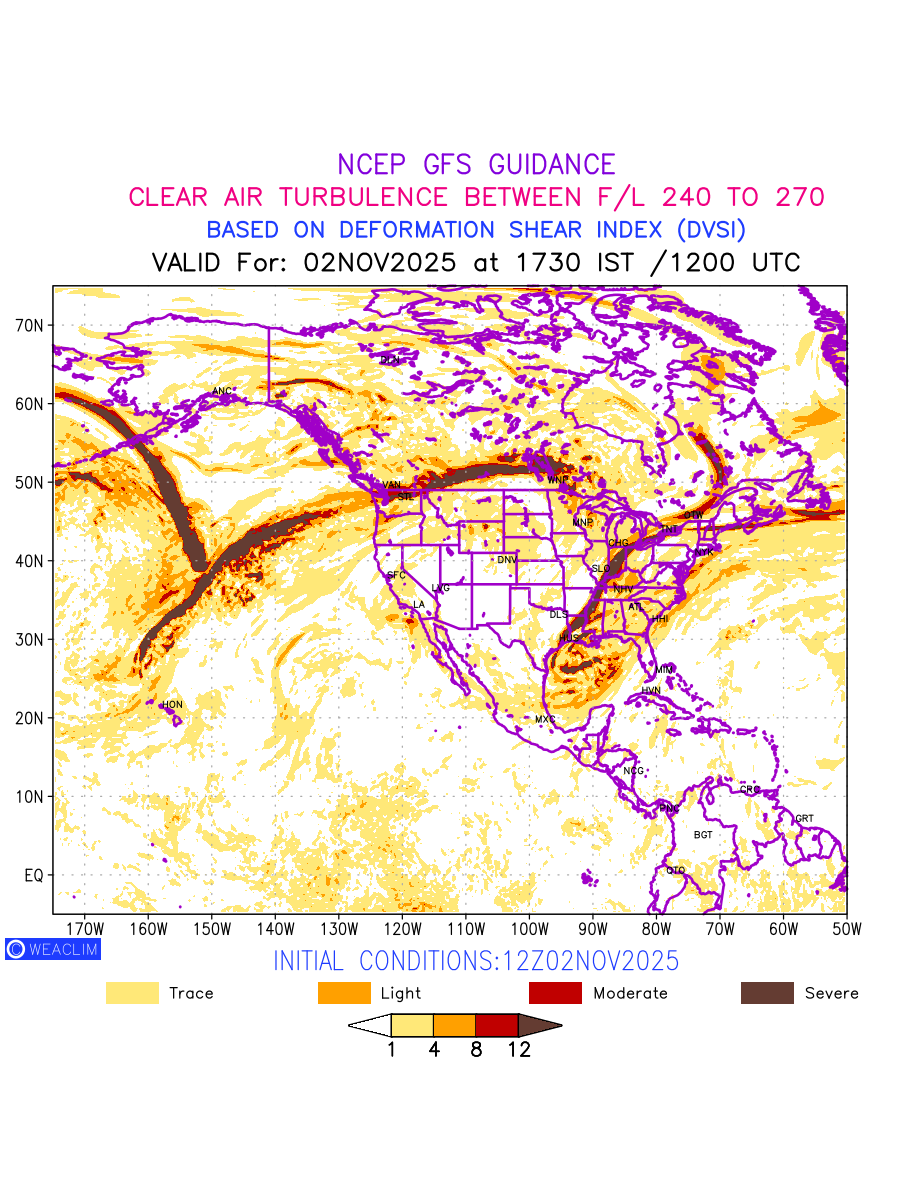 Clear Air Turbulence (CAT) is sudden severe turbulence occurring in cloudless regions that causes violent buffeting of aircraft. CAT is commonly applied to higher altitude turbulence associated with wind shear. It is caused by patches of air swirling chaotically within the world’s jet streams—strong air currents that circle the globe from west to east and that we see on weather maps as wide, wavy lines that bend around low- and high-pressure centre. It is prominent between 500hPa to 200hPa. Shown here are the CAT Conditions at 400hPa for the North American Region for the next ten days.