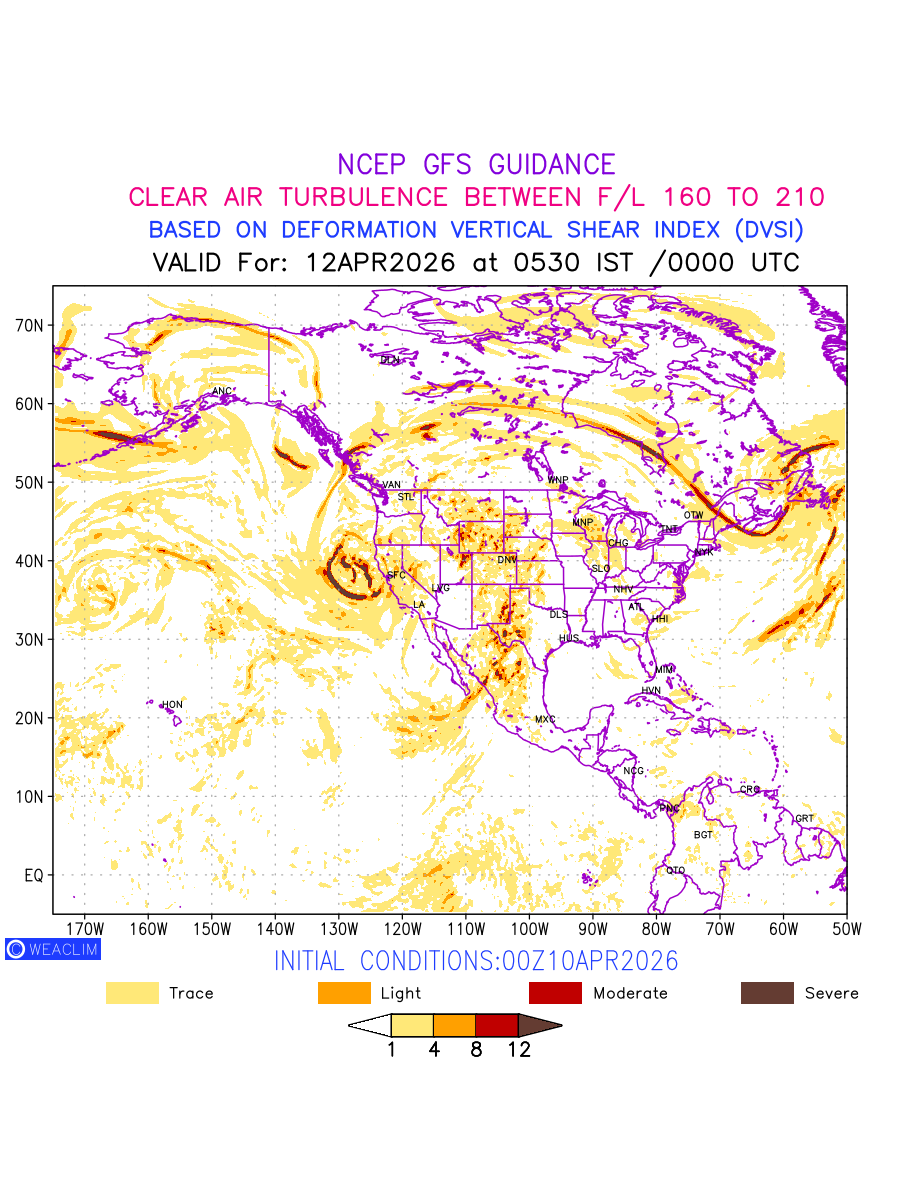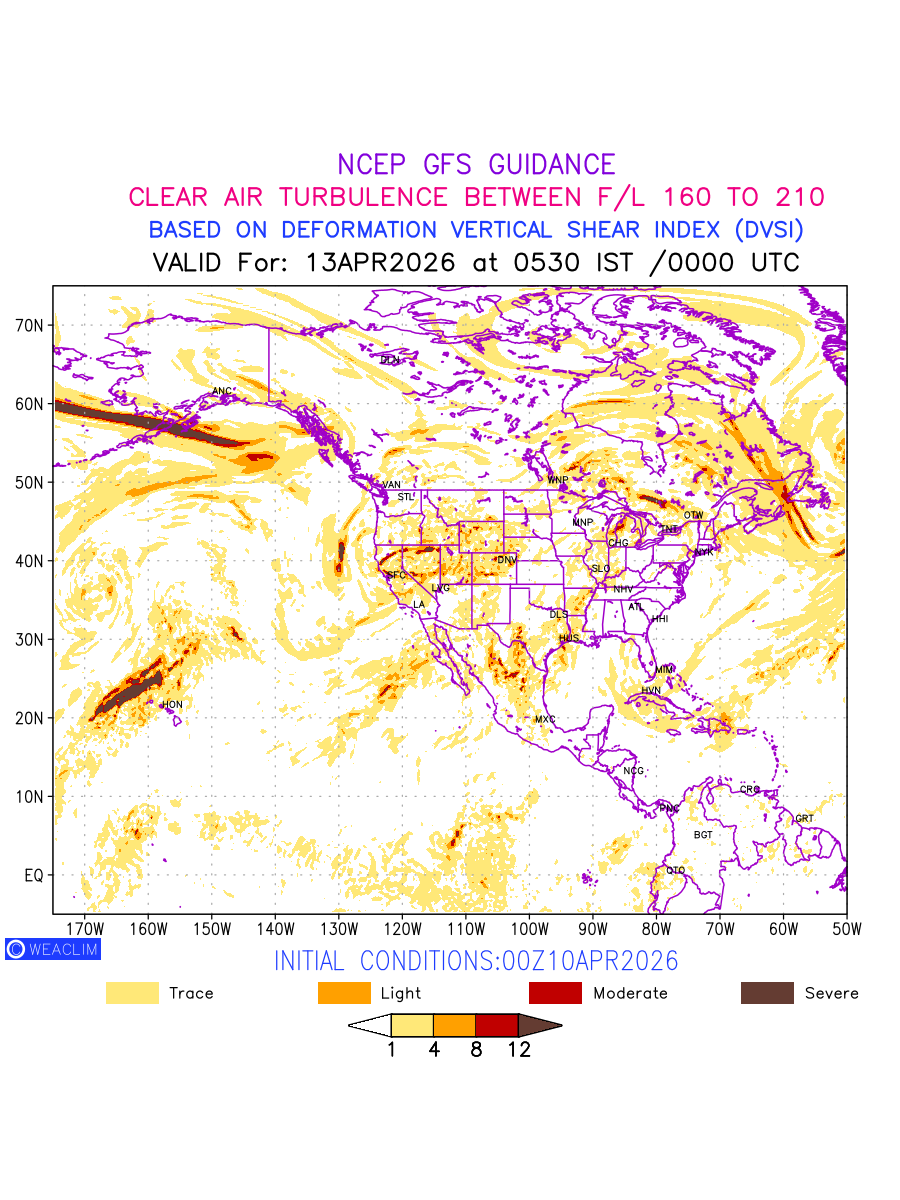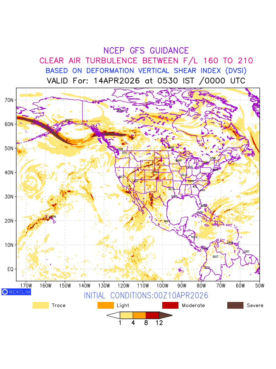 Clear Air Turbulence (CAT) is sudden severe turbulence occurring in cloudless regions that causes violent buffeting of aircraft. CAT is commonly applied to higher altitude turbulence associated with wind shear. It is caused by patches of air swirling chaotically within the world’s jet streams—strong air currents that circle the globe from west to east and that we see on weather maps as wide, wavy lines that bend around low- and high-pressure centre. It is prominent between 500hPa to 200hPa. Shown here are the CAT Conditions at 500hPa for the North American Region for the next ten days.