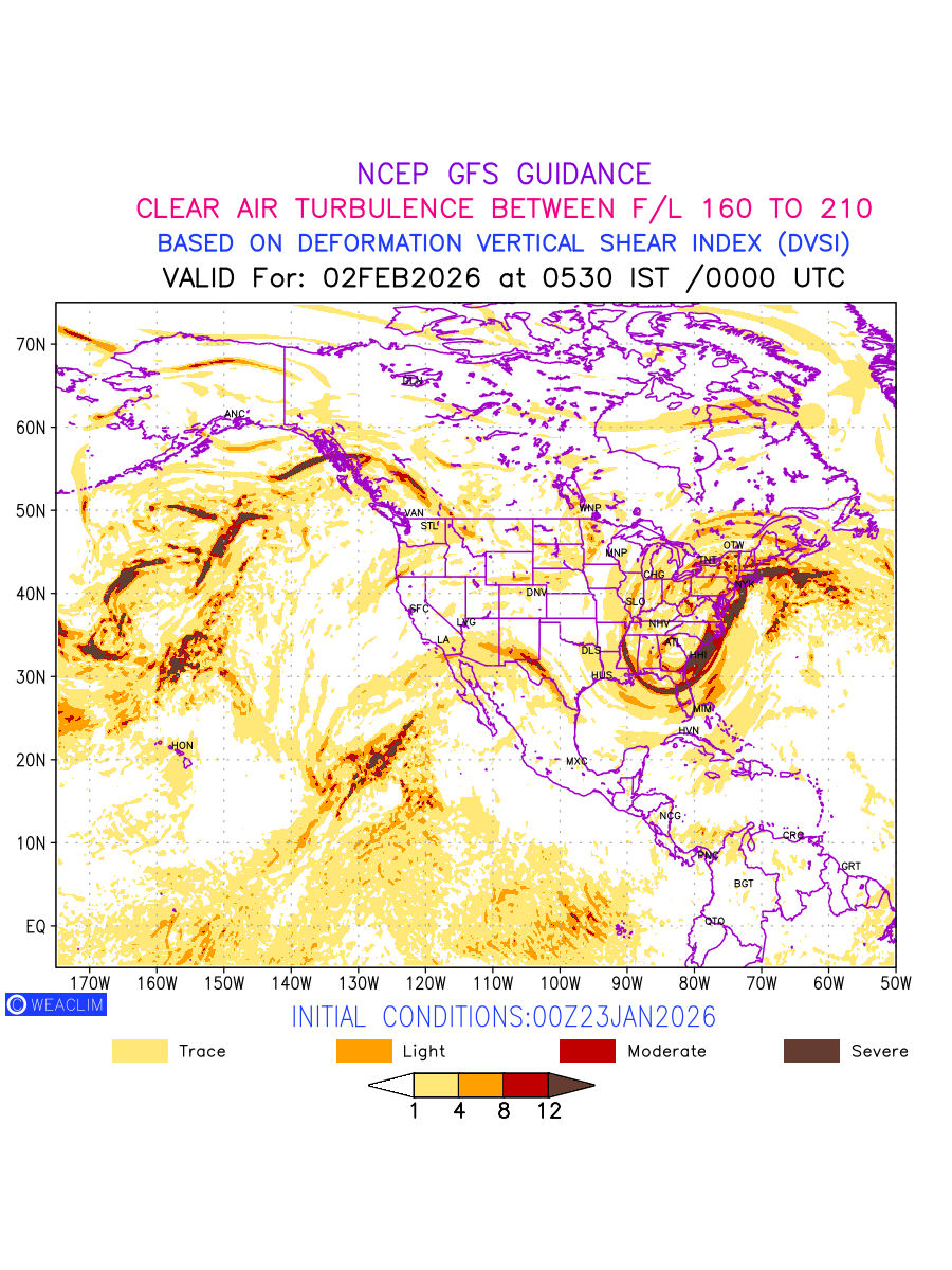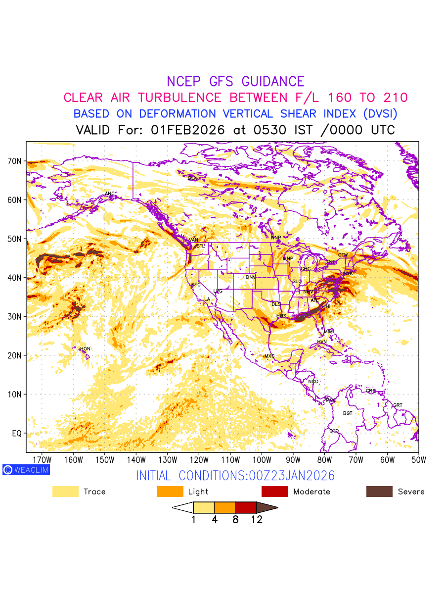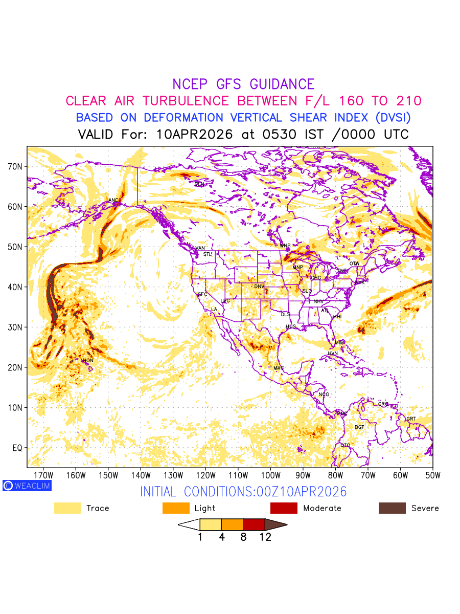 Clear Air Turbulence (CAT) is sudden severe turbulence occurring in cloudless regions that causes violent buffeting of aircraft. CAT is commonly applied to higher altitude turbulence associated with wind shear. It is caused by patches of air swirling chaotically within the world’s jet streams—strong air currents that circle the globe from west to east and that we see on weather maps as wide, wavy lines that bend around low- and high-pressure centre. It is prominent between 500hPa to 200hPa. Shown here are the CAT Conditions at 500hPa for the North American Region for the next ten days.