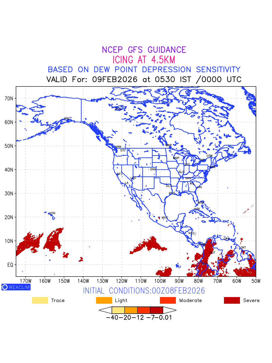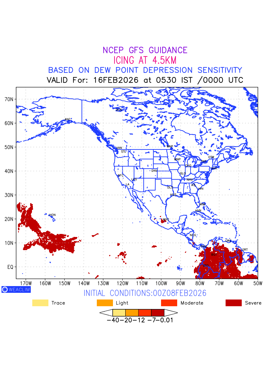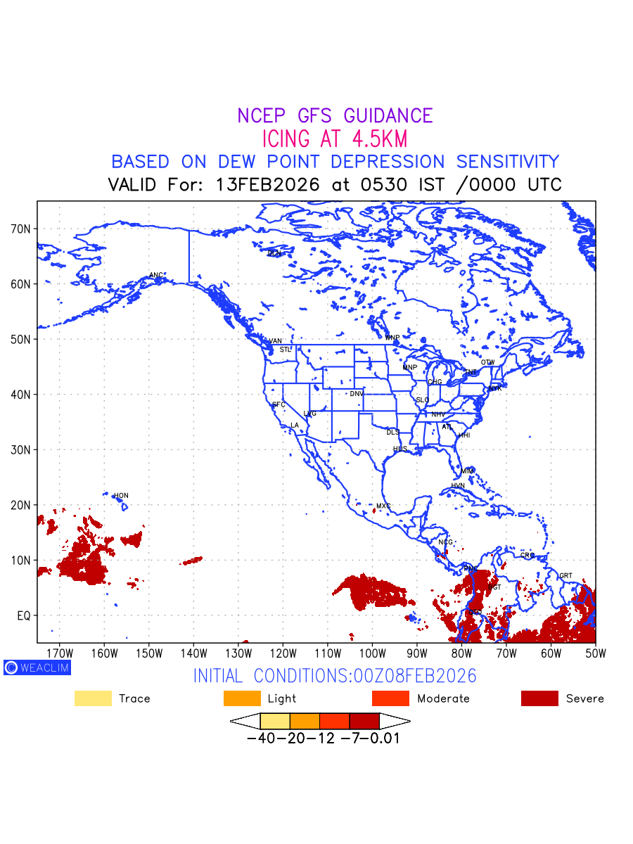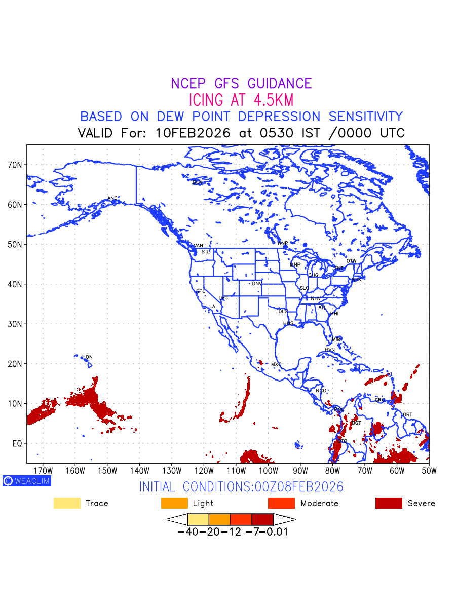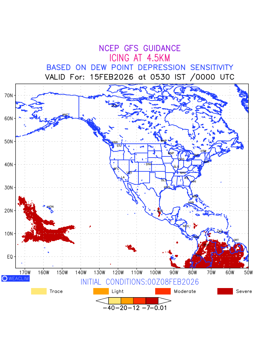 Known icing conditions exist when visible moisture or high relative humidity combines with temperatures near or below freezing. Icing conditions are only present in temperatures between 0ºC and -40ºC, with the highest risk occurring between 0ºC and -15ºC. The size and temperature of the supercooled water droplets that impact on the aircraft determine the category of ice that is formed. Icing is prominent between 600hPa to 700hPa level. Shown here is the icing condition at 600hPa level for the North American Region for the next ten days.