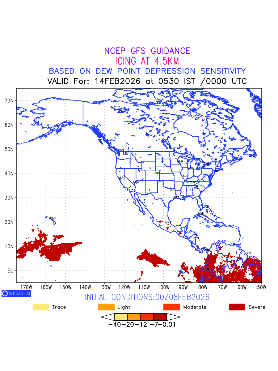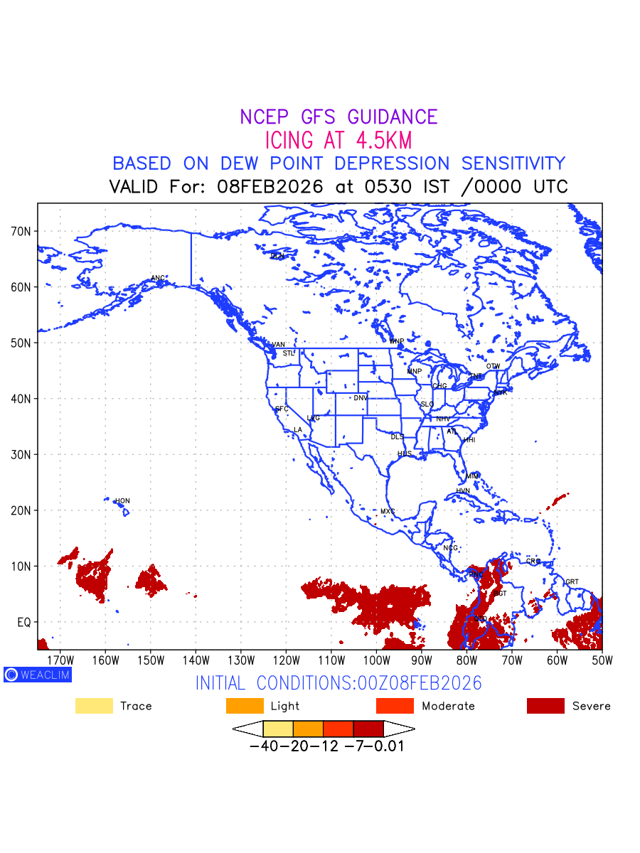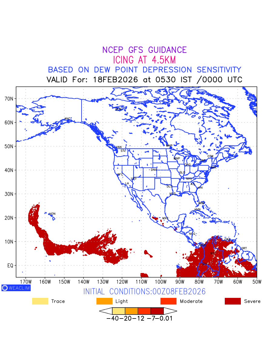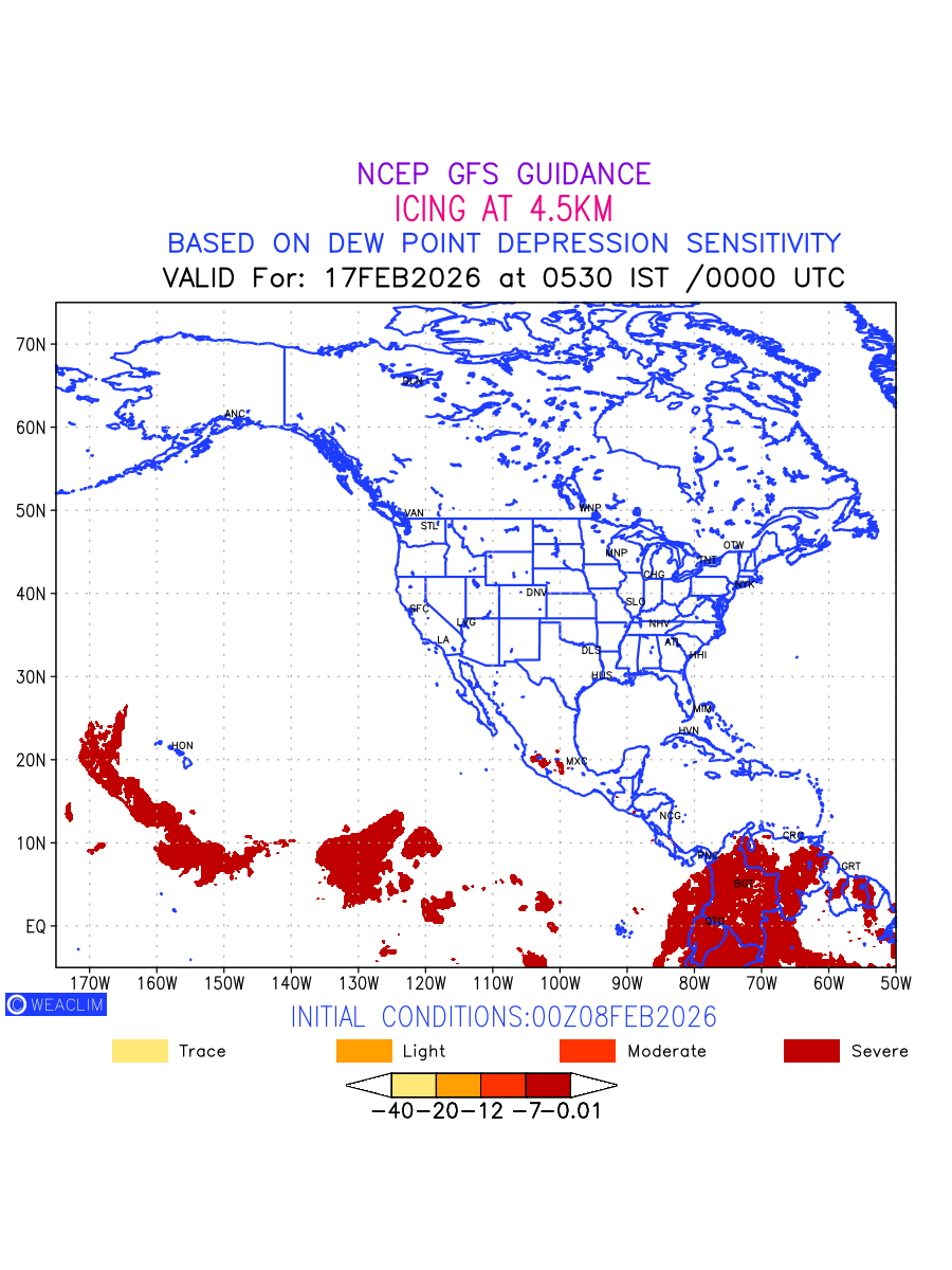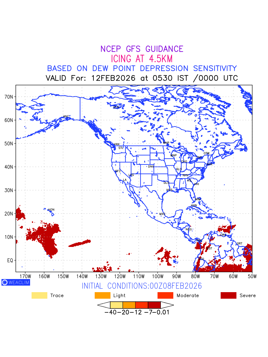 Known icing conditions exist when visible moisture or high relative humidity combines with temperatures near or below freezing. Icing conditions are only present in temperatures between 0ºC and -40ºC, with the highest risk occurring between 0ºC and -15ºC. The size and temperature of the supercooled water droplets that impact on the aircraft determine the category of ice that is formed. Icing is prominent between 600hPa to 700hPa level. Shown here is the icing condition at 600hPa level for the North American Region for the next ten days.