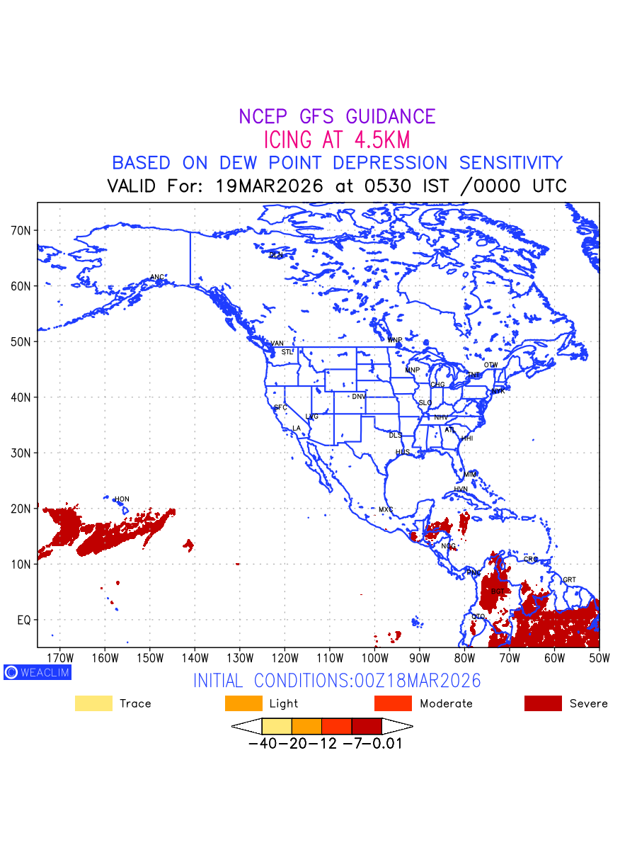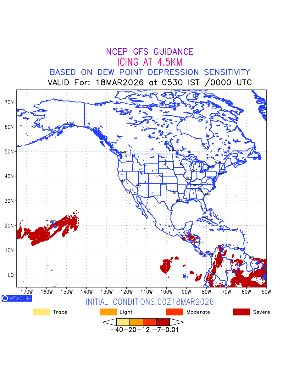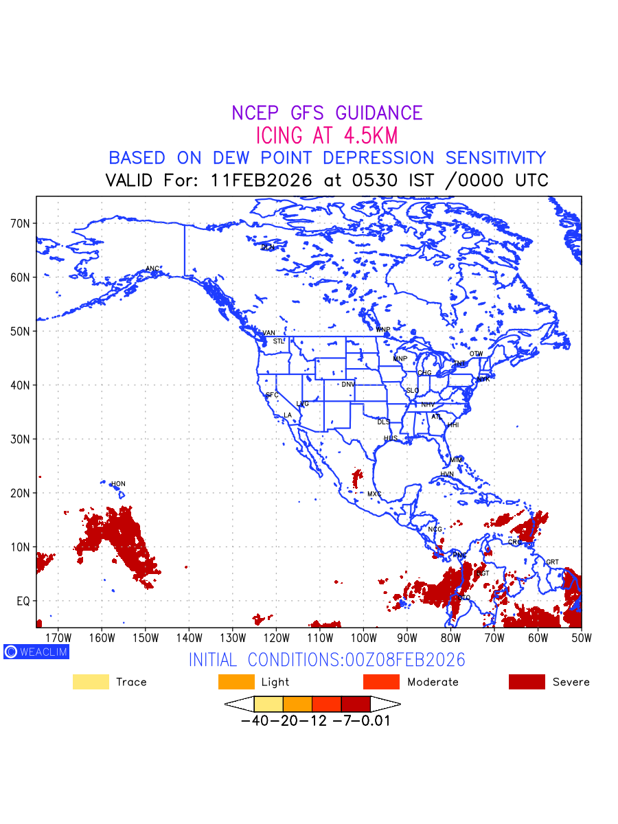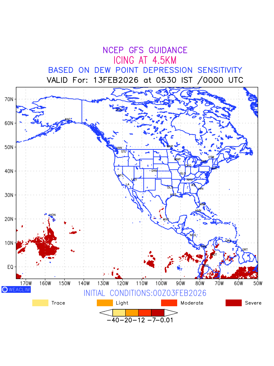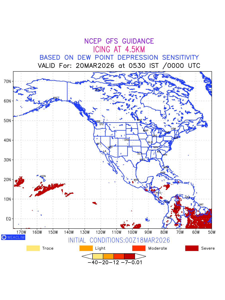 Known icing conditions exist when visible moisture or high relative humidity combines with temperatures near or below freezing. Icing conditions are only present in temperatures between 0ºC and -40ºC, with the highest risk occurring between 0ºC and -15ºC. The size and temperature of the supercooled water droplets that impact on the aircraft determine the category of ice that is formed. Icing is prominent between 600hPa to 700hPa level. Shown here is the icing condition at 600hPa level for the North American Region for the next ten days.