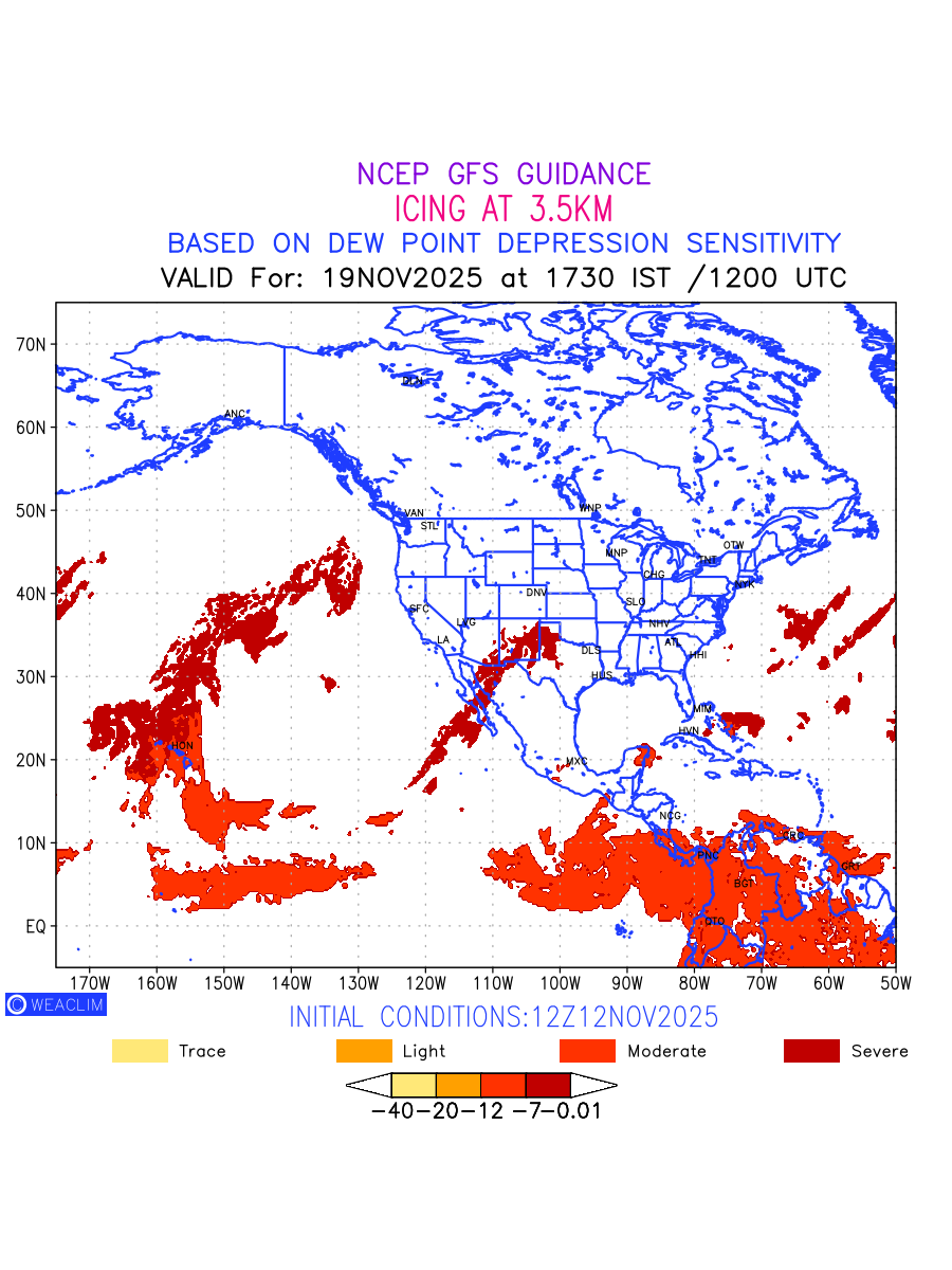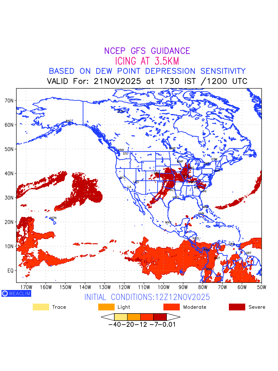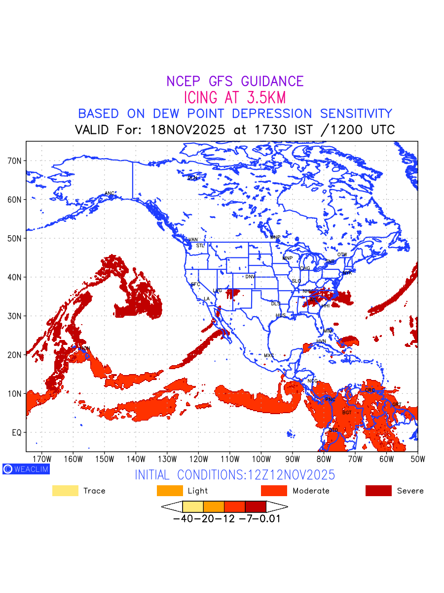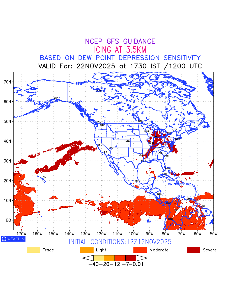 Known icing conditions exist when visible moisture or high relative humidity combines with temperatures near or below freezing. Icing conditions are only present in temperatures between 0ºC and -40ºC, with the highest risk occurring between 0ºC and -15ºC. The size and temperature of the supercooled water droplets that impact on the aircraft determine the category of ice that is formed. Icing is prominent between 600hPa to 700hPa level. Shown here is the icing condition at 700hPa level for the North American Region for the next ten days.