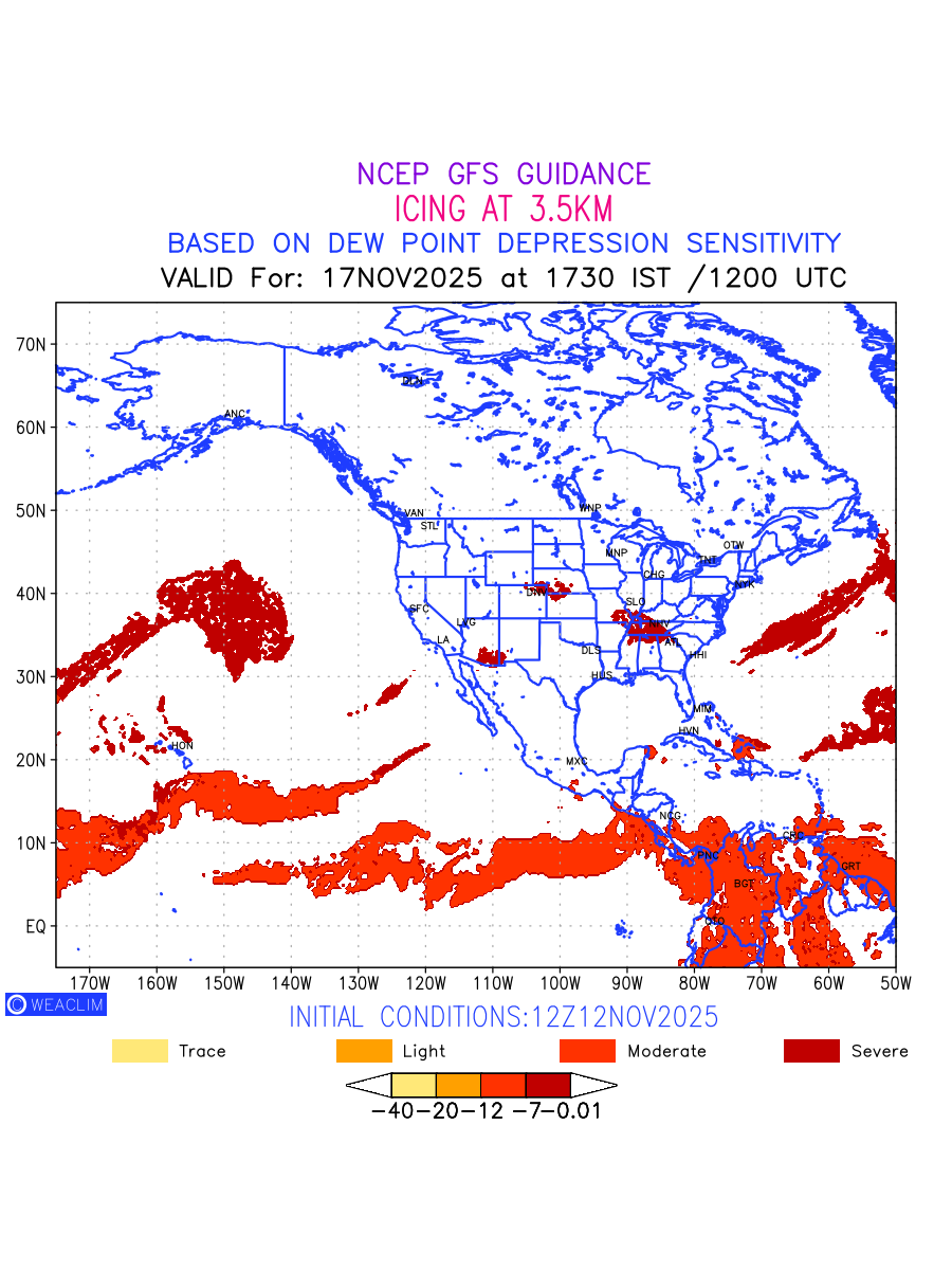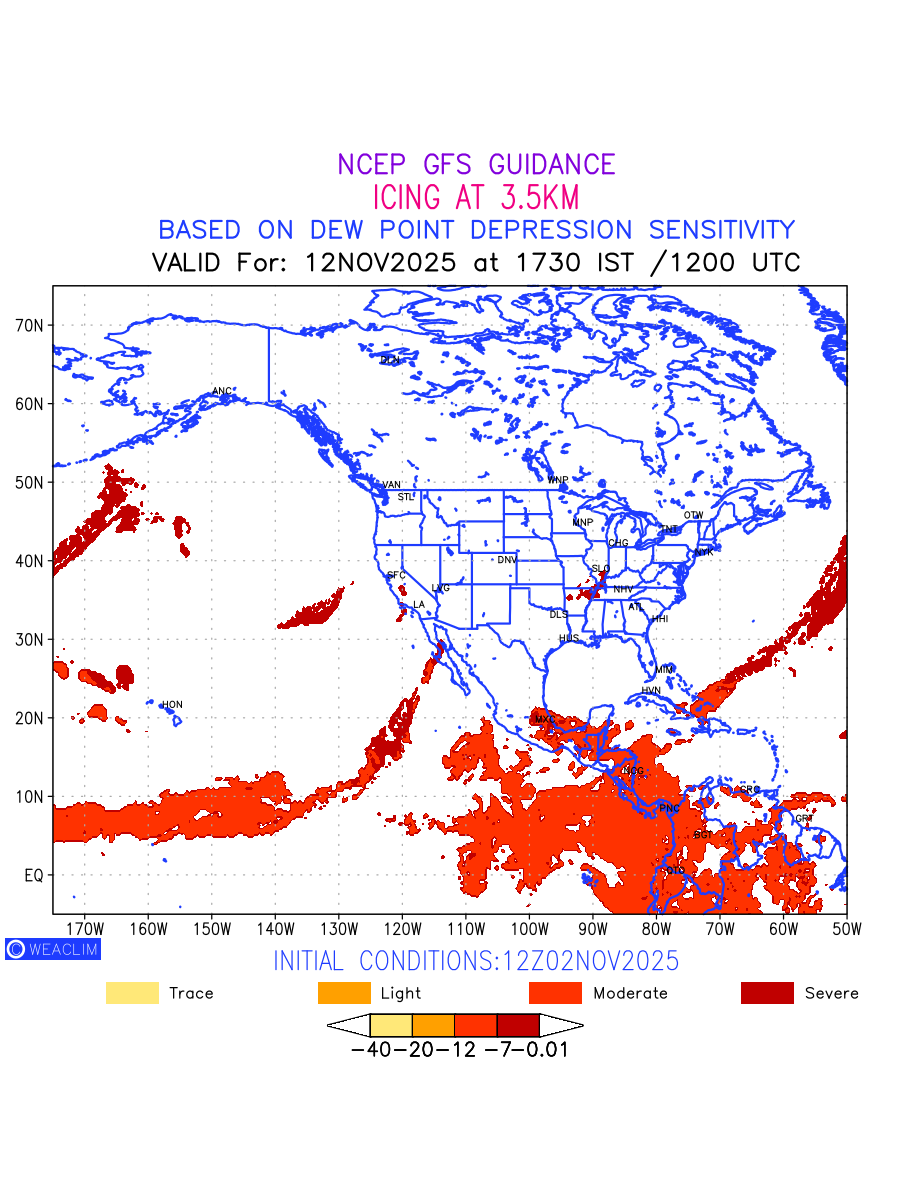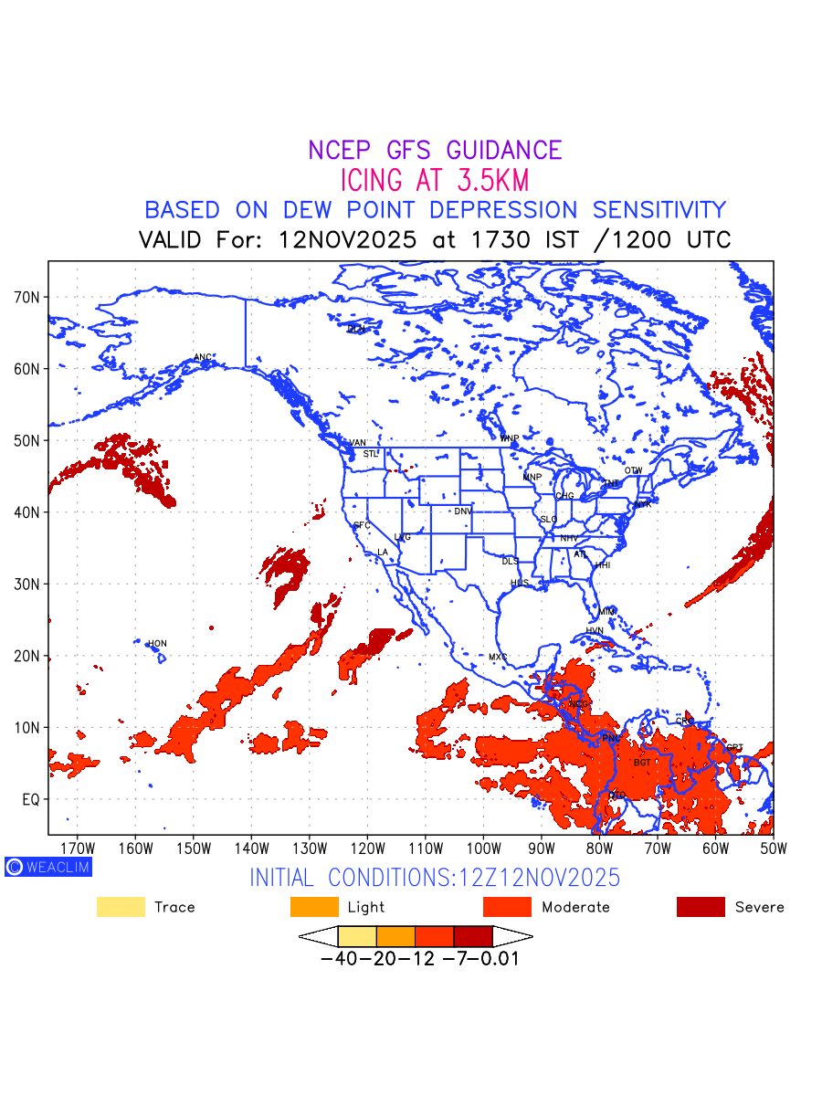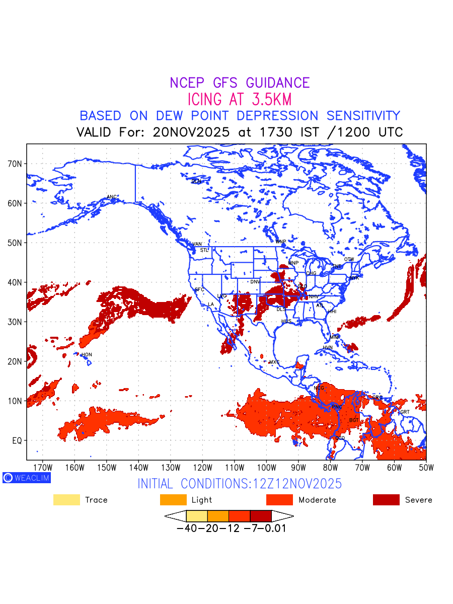 Known icing conditions exist when visible moisture or high relative humidity combines with temperatures near or below freezing. Icing conditions are only present in temperatures between 0ºC and -40ºC, with the highest risk occurring between 0ºC and -15ºC. The size and temperature of the supercooled water droplets that impact on the aircraft determine the category of ice that is formed. Icing is prominent between 600hPa to 700hPa level. Shown here is the icing condition at 700hPa level for the North American Region for the next ten days.