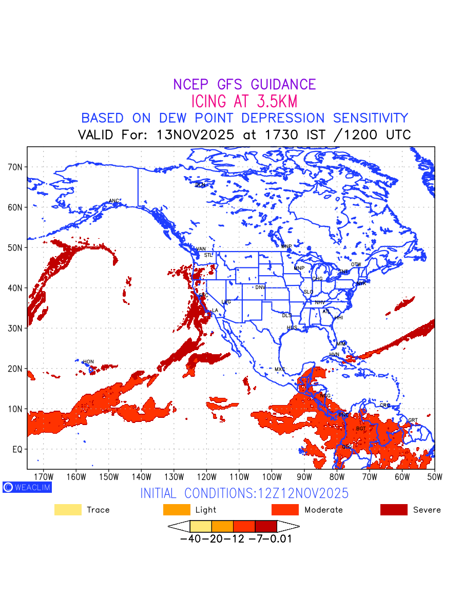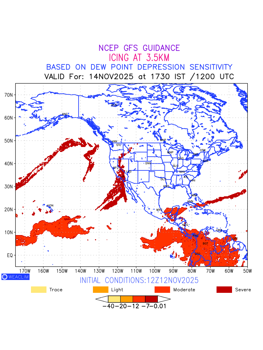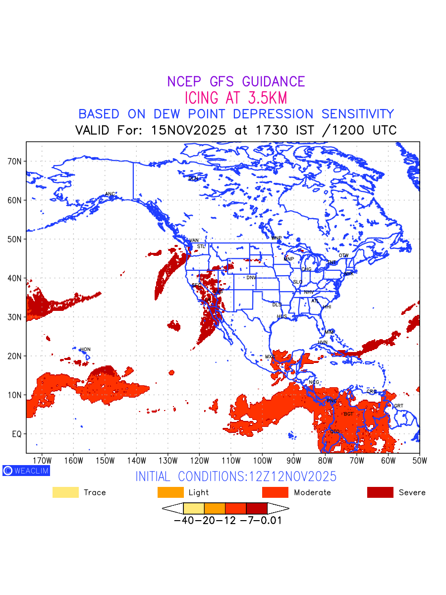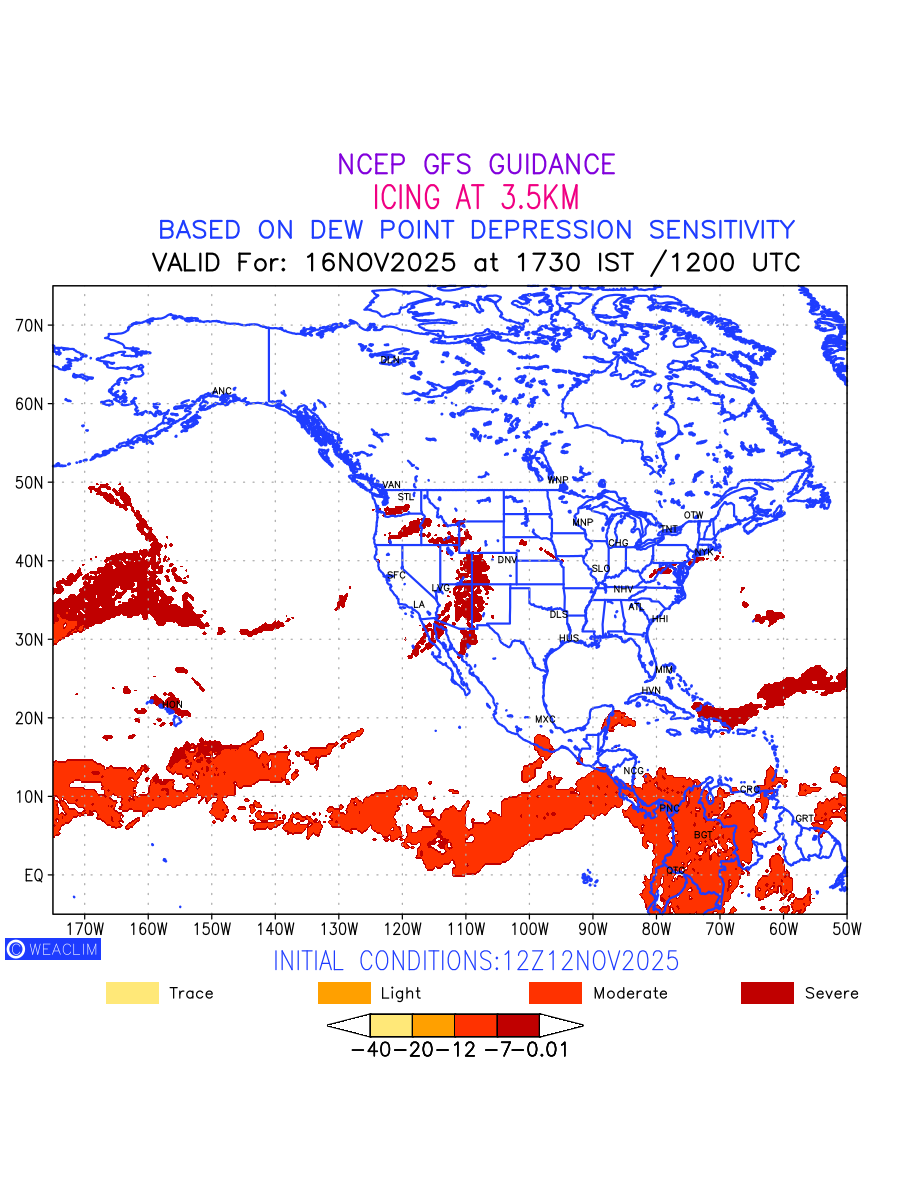 Known icing conditions exist when visible moisture or high relative humidity combines with temperatures near or below freezing. Icing conditions are only present in temperatures between 0ºC and -40ºC, with the highest risk occurring between 0ºC and -15ºC. The size and temperature of the supercooled water droplets that impact on the aircraft determine the category of ice that is formed. Icing is prominent between 600hPa to 700hPa level. Shown here is the icing condition at 700hPa level for the North American Region for the next ten days.