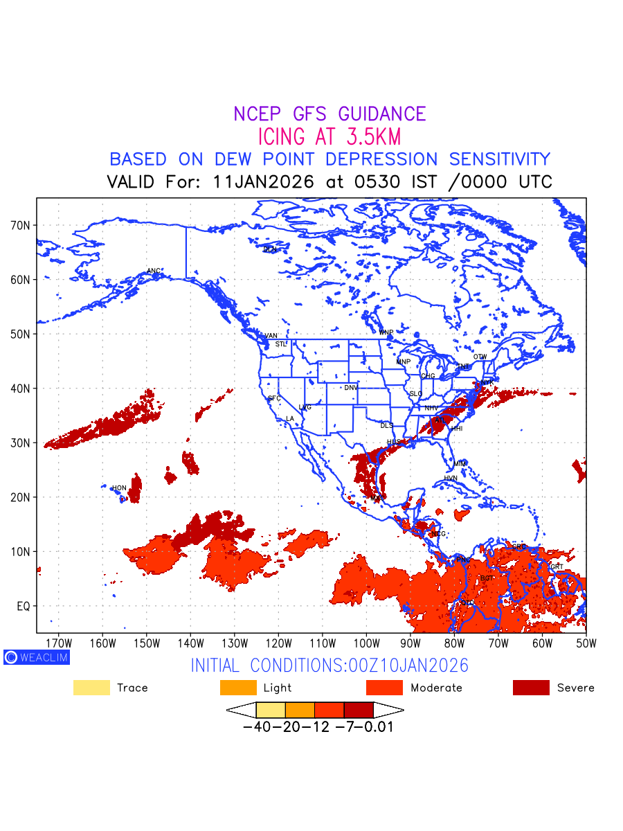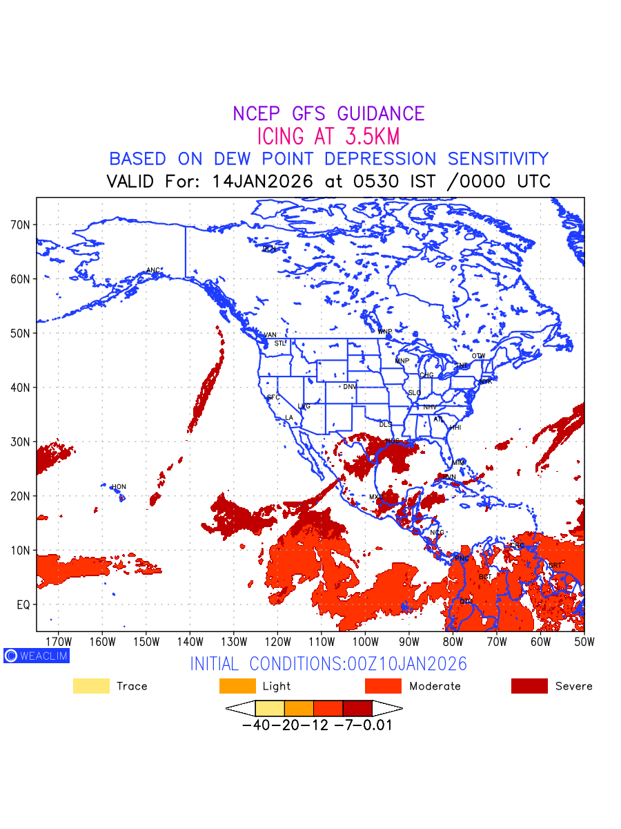 Known icing conditions exist when visible moisture or high relative humidity combines with temperatures near or below freezing. Icing conditions are only present in temperatures between 0ºC and -40ºC, with the highest risk occurring between 0ºC and -15ºC. The size and temperature of the supercooled water droplets that impact on the aircraft determine the category of ice that is formed. Icing is prominent between 600hPa to 700hPa level. Shown here is the icing condition at 700hPa level for the North American Region for the next ten days.