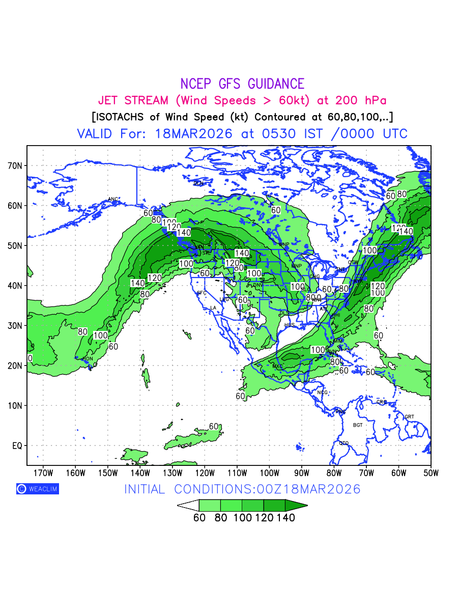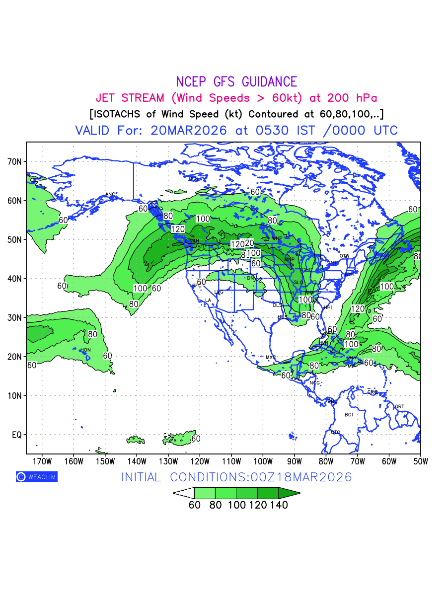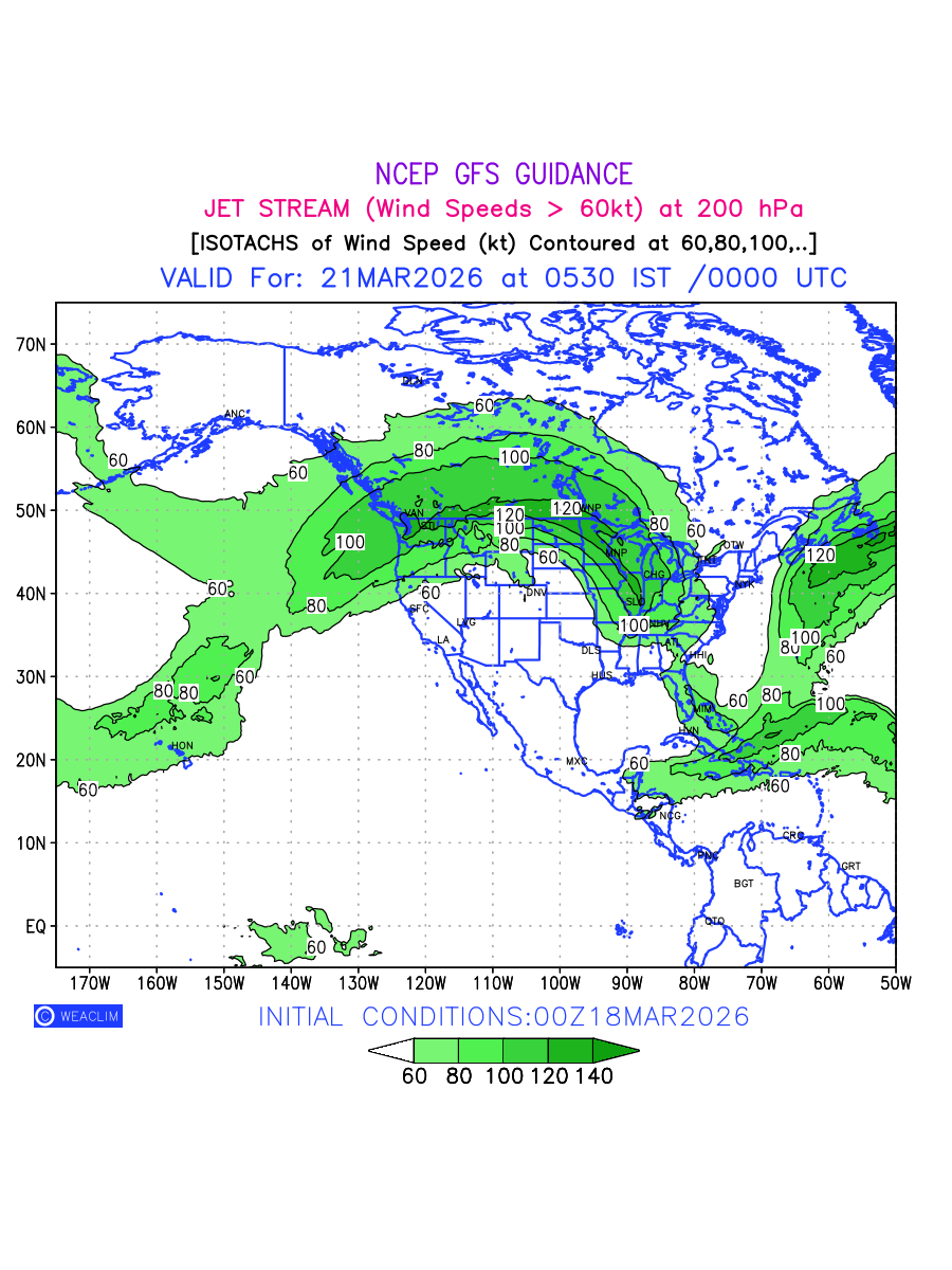 Three features that are significant for aviation are the Jet Stream in upper troposphere, Clear Air Turbulence (CAT) in upper troposphere and Icing in mid troposphere. Shown here is the Jet Stream at 200 hPa for the North American Region for next ten days. Isotachs of winds speed of more than 60 kt are marked at 200 hPa to represent Jet Stream flow at 200 hPa for better appreciation.