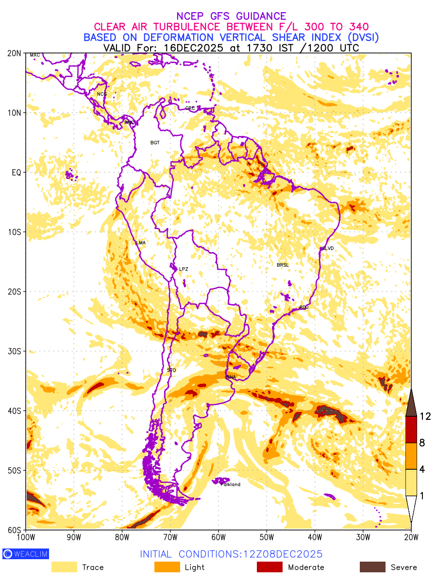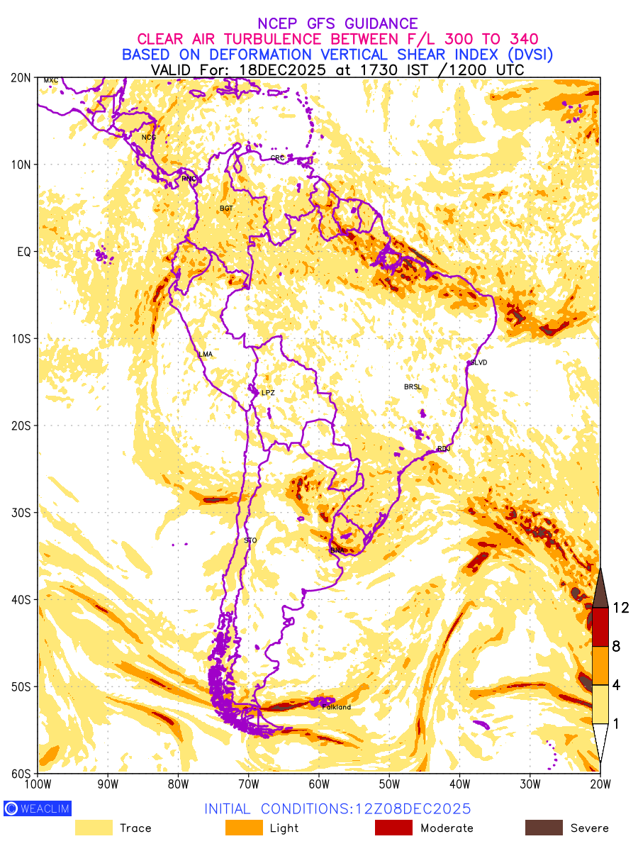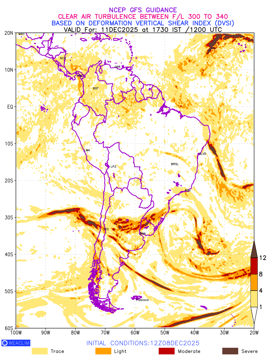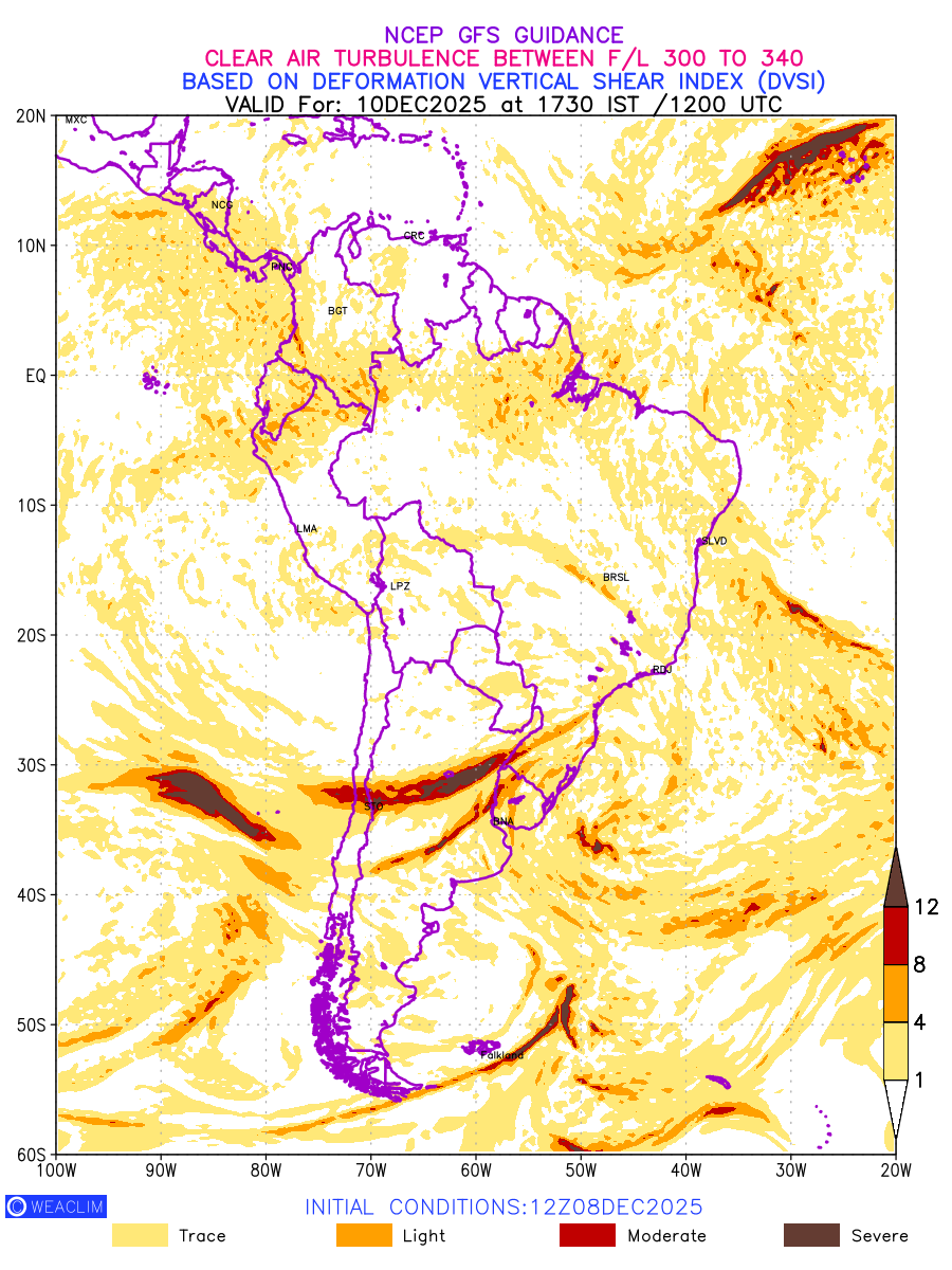 Clear Air Turbulence (CAT) is sudden severe turbulence occurring in cloudless regions that causes violent buffeting of aircraft. CAT is commonly applied to higher altitude turbulence associated with wind shear. It is caused by patches of air swirling chaotically within the world’s jet streams—strong air currents that circle the globe from west to east and that we see on weather maps as wide, wavy lines that bend around low- and high-pressure centre. It is prominent between 500hPa to 200hPa. Shown here are the CAT Conditions at 300hPa for the South American Region for the next ten days.