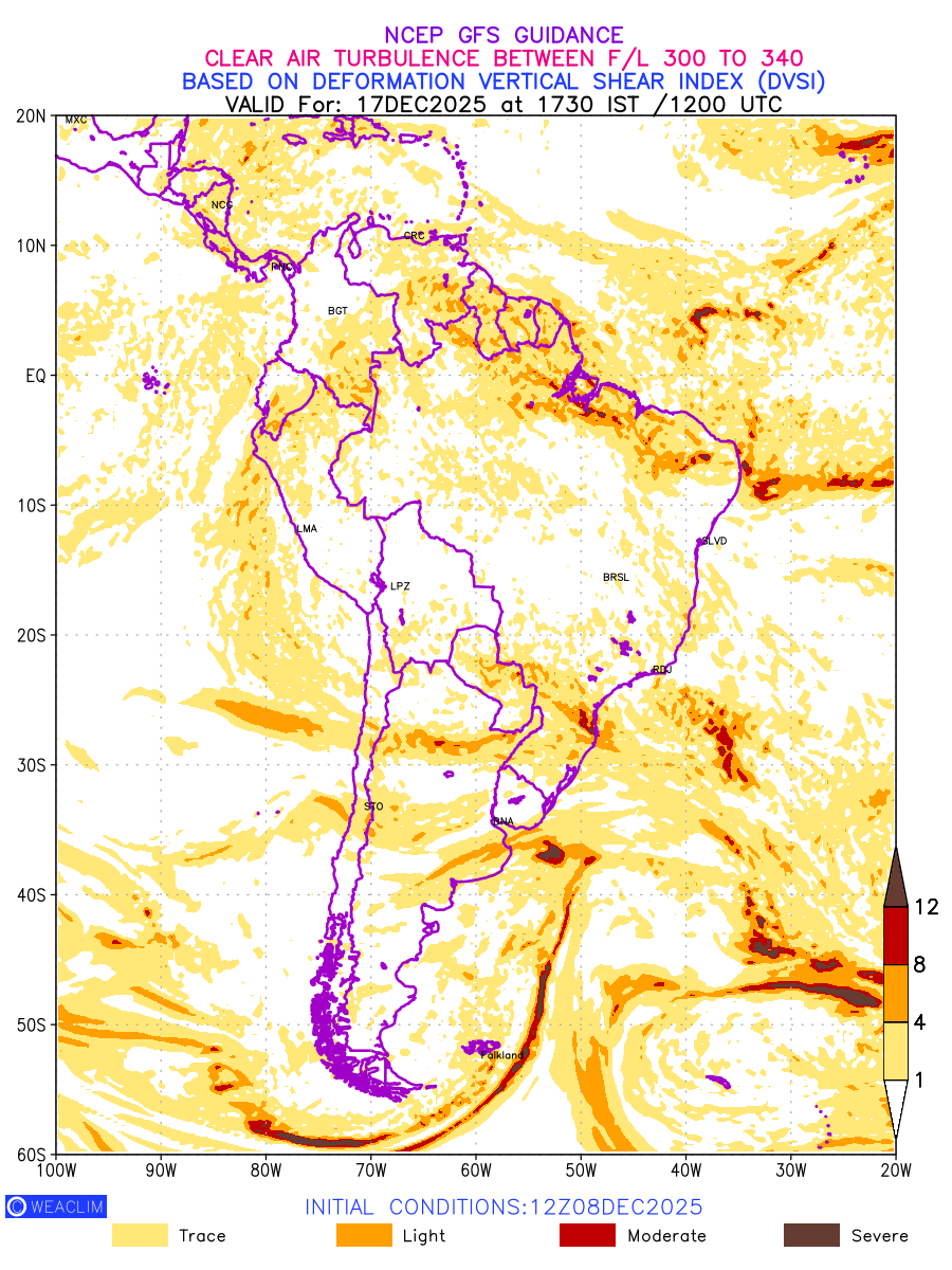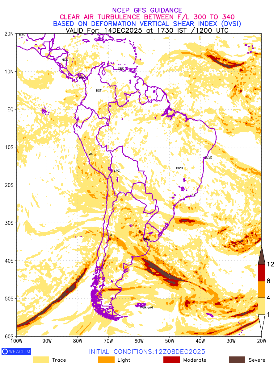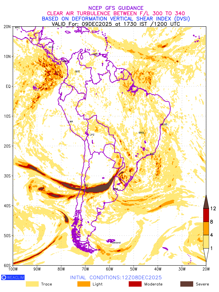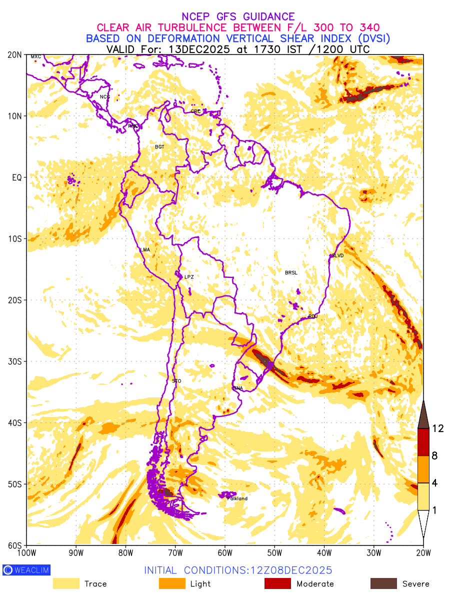 Clear Air Turbulence (CAT) is sudden severe turbulence occurring in cloudless regions that causes violent buffeting of aircraft. CAT is commonly applied to higher altitude turbulence associated with wind shear. It is caused by patches of air swirling chaotically within the world’s jet streams—strong air currents that circle the globe from west to east and that we see on weather maps as wide, wavy lines that bend around low- and high-pressure centre. It is prominent between 500hPa to 200hPa. Shown here are the CAT Conditions at 300hPa for the South American Region for the next ten days.