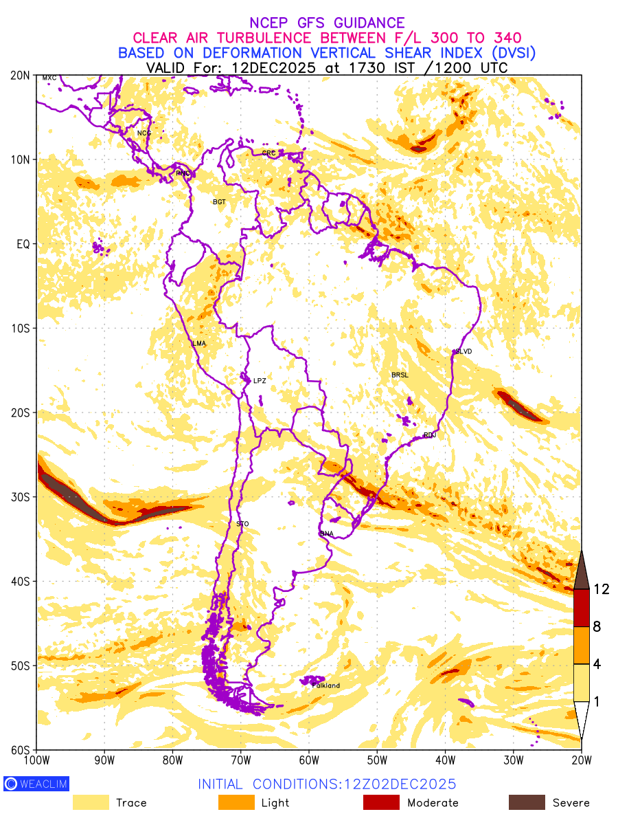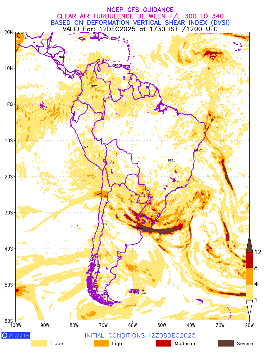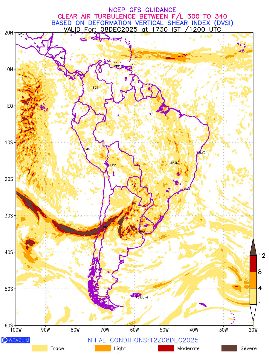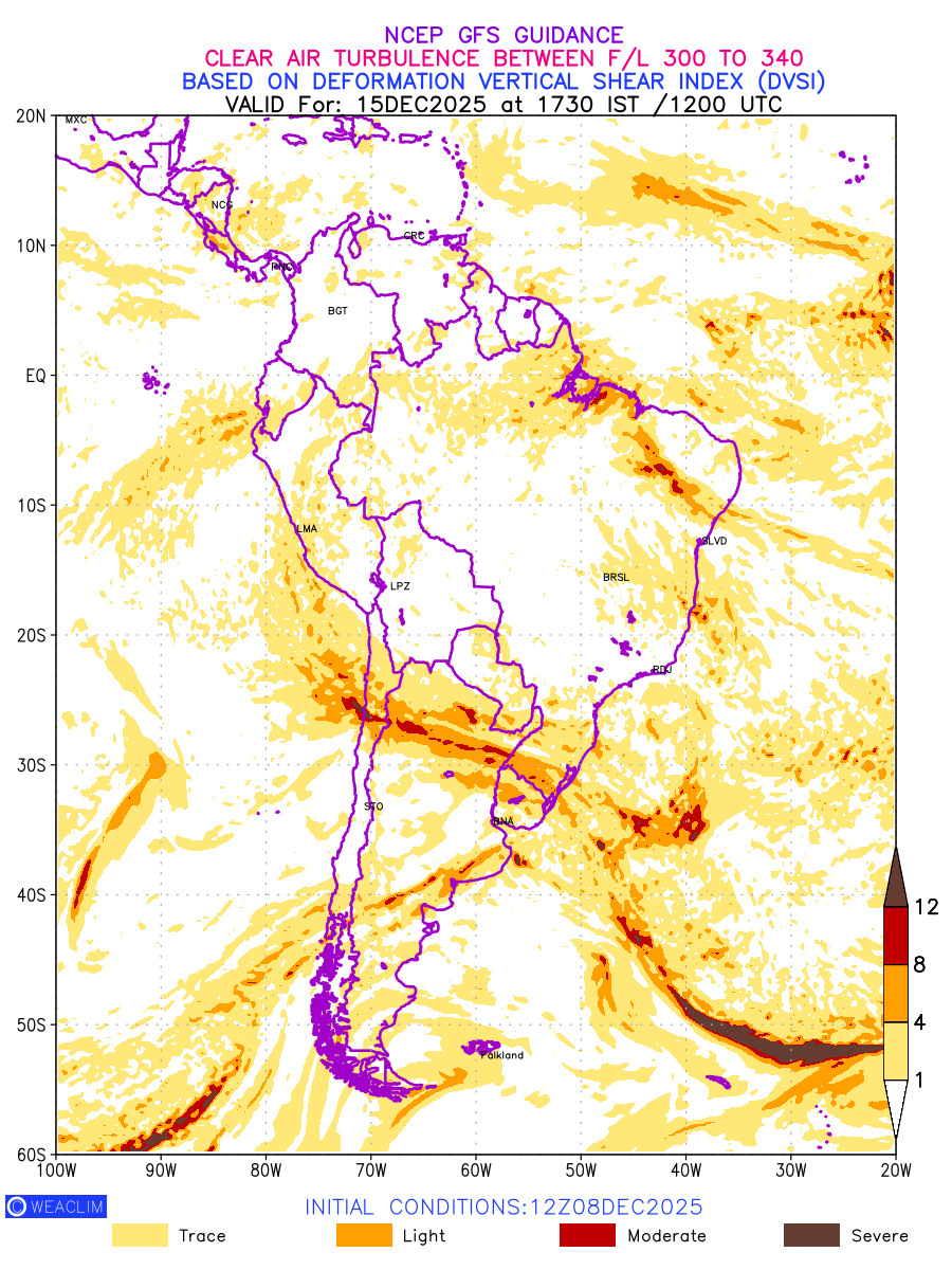 Clear Air Turbulence (CAT) is sudden severe turbulence occurring in cloudless regions that causes violent buffeting of aircraft. CAT is commonly applied to higher altitude turbulence associated with wind shear. It is caused by patches of air swirling chaotically within the world’s jet streams—strong air currents that circle the globe from west to east and that we see on weather maps as wide, wavy lines that bend around low- and high-pressure centre. It is prominent between 500hPa to 200hPa. Shown here are the CAT Conditions at 300hPa for the South American Region for the next ten days.