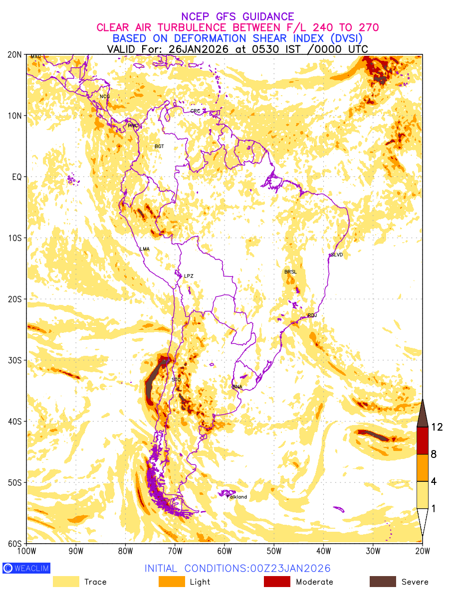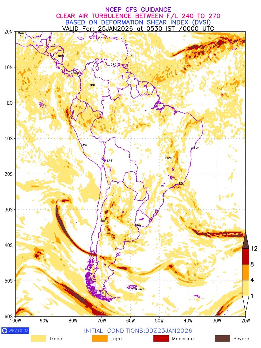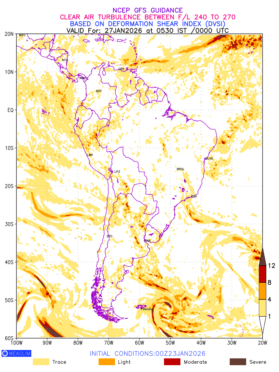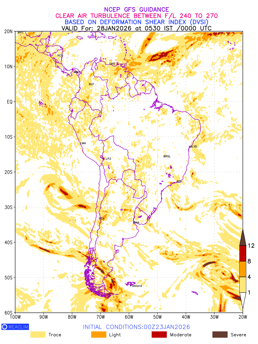 Clear Air Turbulence (CAT) is sudden severe turbulence occurring in cloudless regions that causes violent buffeting of aircraft. CAT is commonly applied to higher altitude turbulence associated with wind shear. It is caused by patches of air swirling chaotically within the world’s jet streams—strong air currents that circle the globe from west to east and that we see on weather maps as wide, wavy lines that bend around low- and high-pressure centre. It is prominent between 500hPa to 200hPa. Shown here are the CAT Conditions at 400hPa for the South American Region for the next ten days.