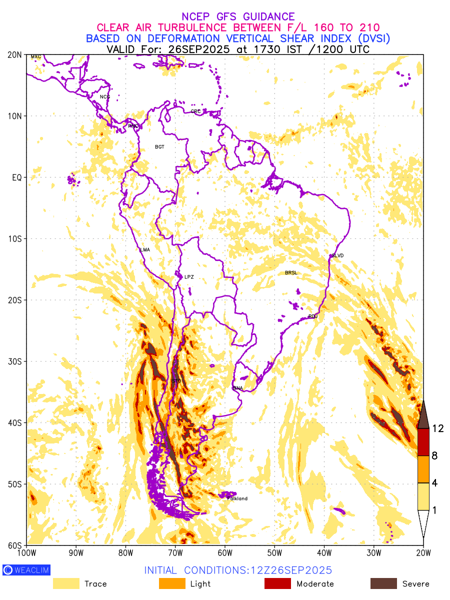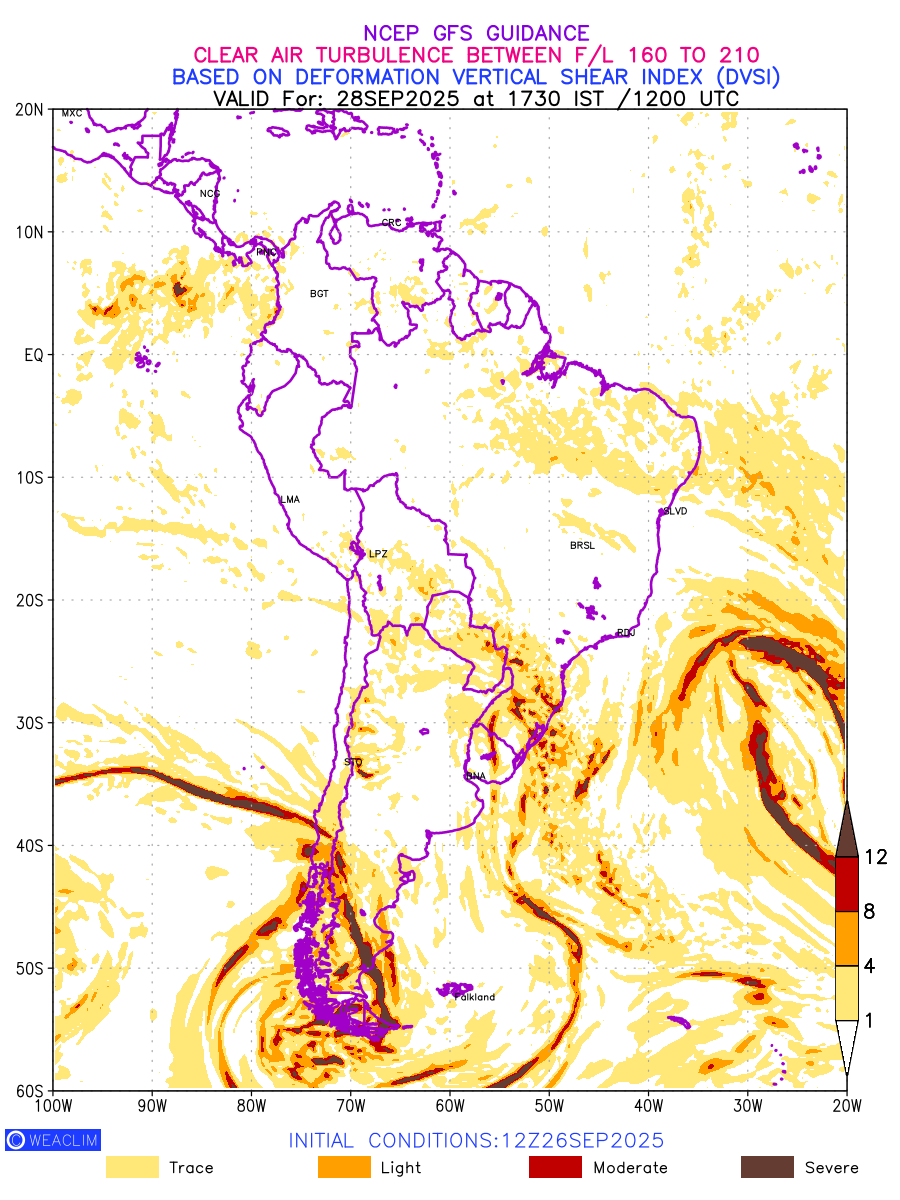 Clear Air Turbulence (CAT) is sudden severe turbulence occurring in cloudless regions that causes violent buffeting of aircraft. CAT is commonly applied to higher altitude turbulence associated with wind shear. It is caused by patches of air swirling chaotically within the world’s jet streams—strong air currents that circle the globe from west to east and that we see on weather maps as wide, wavy lines that bend around low- and high-pressure centre. It is prominent between 500hPa to 200hPa. Shown here are the CAT Conditions at 500hPa for the South American Region for the next ten days.