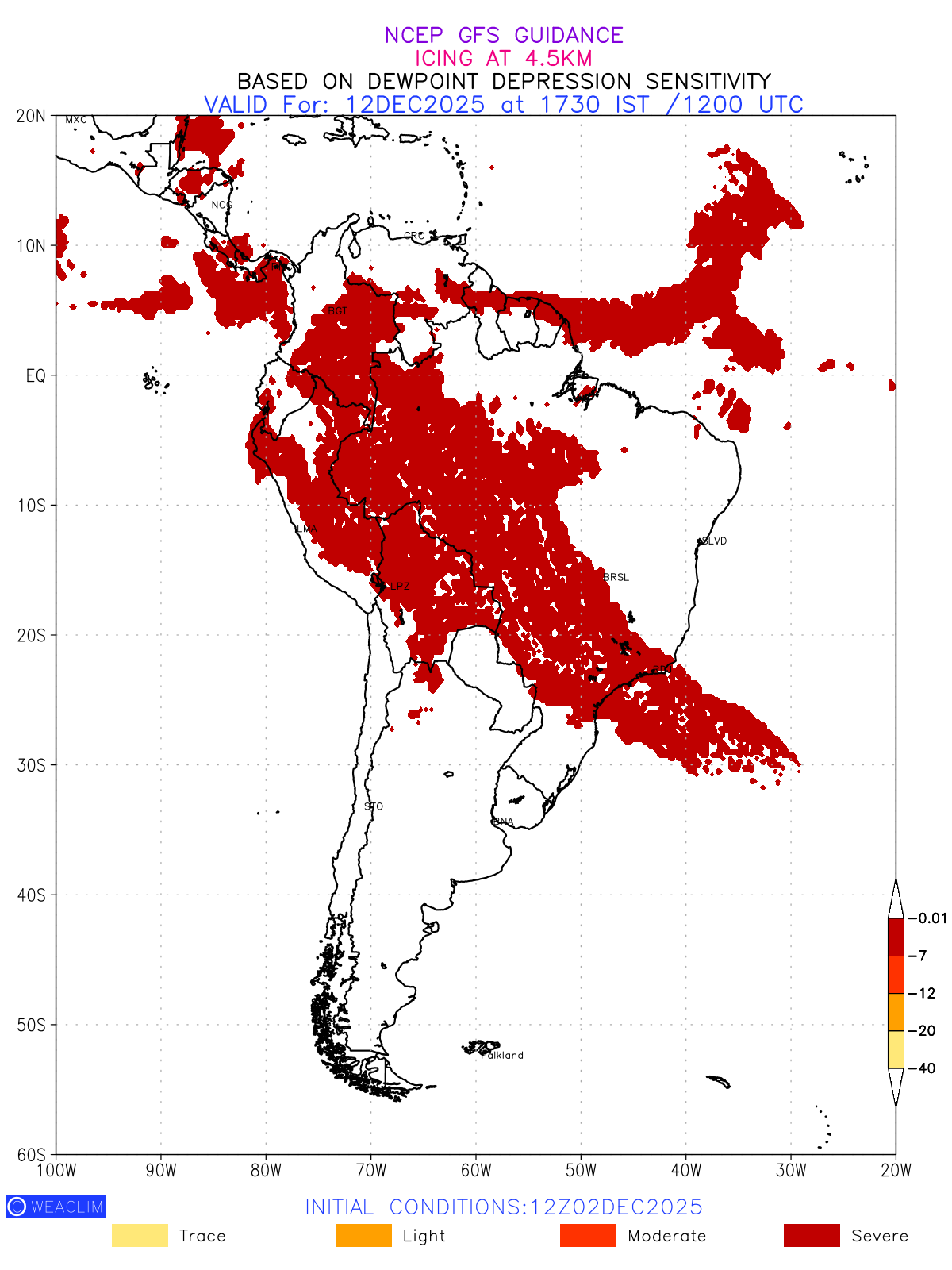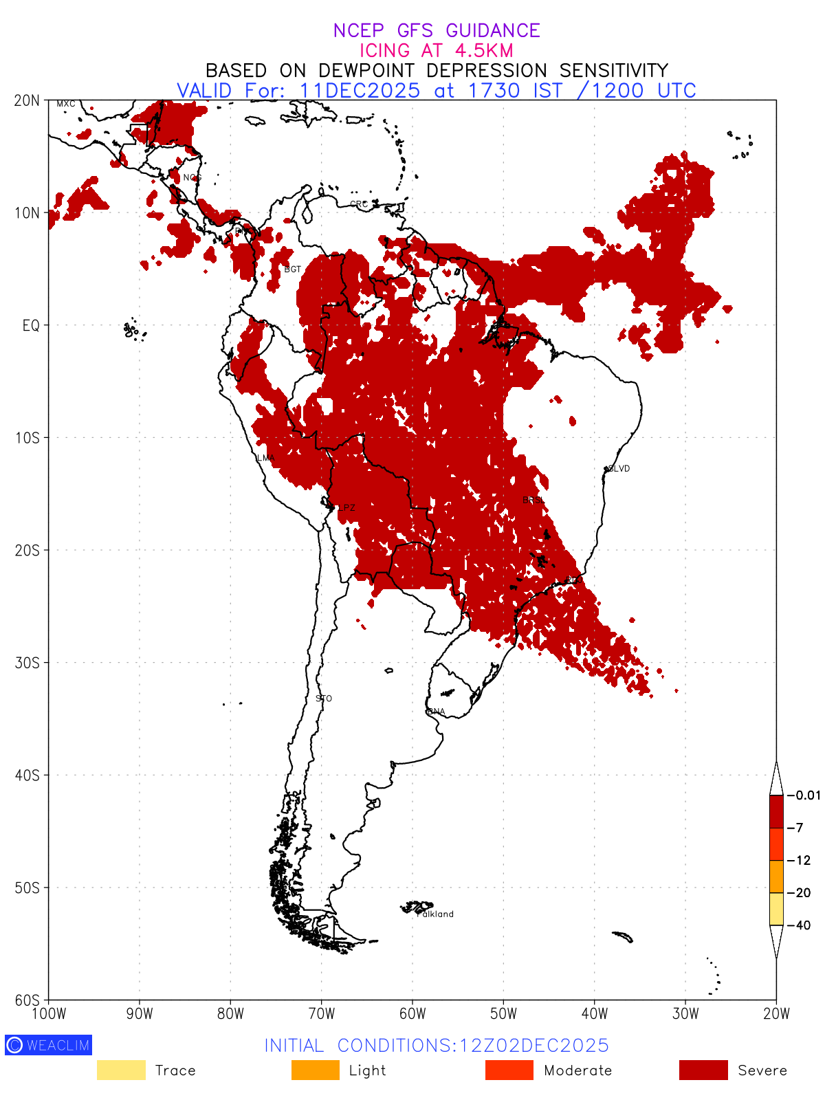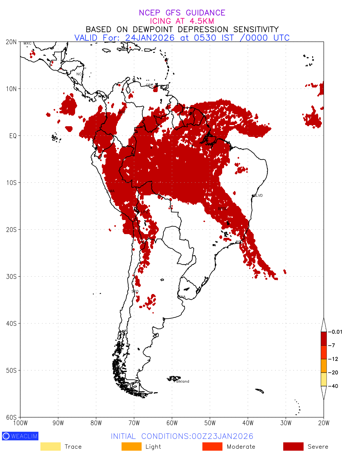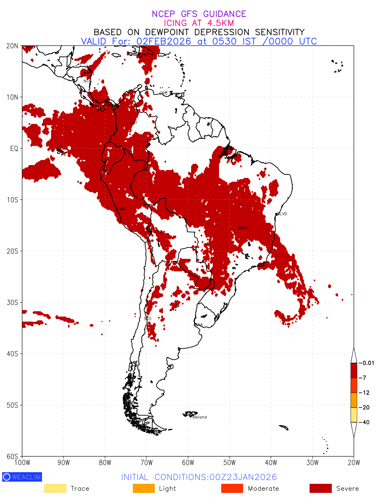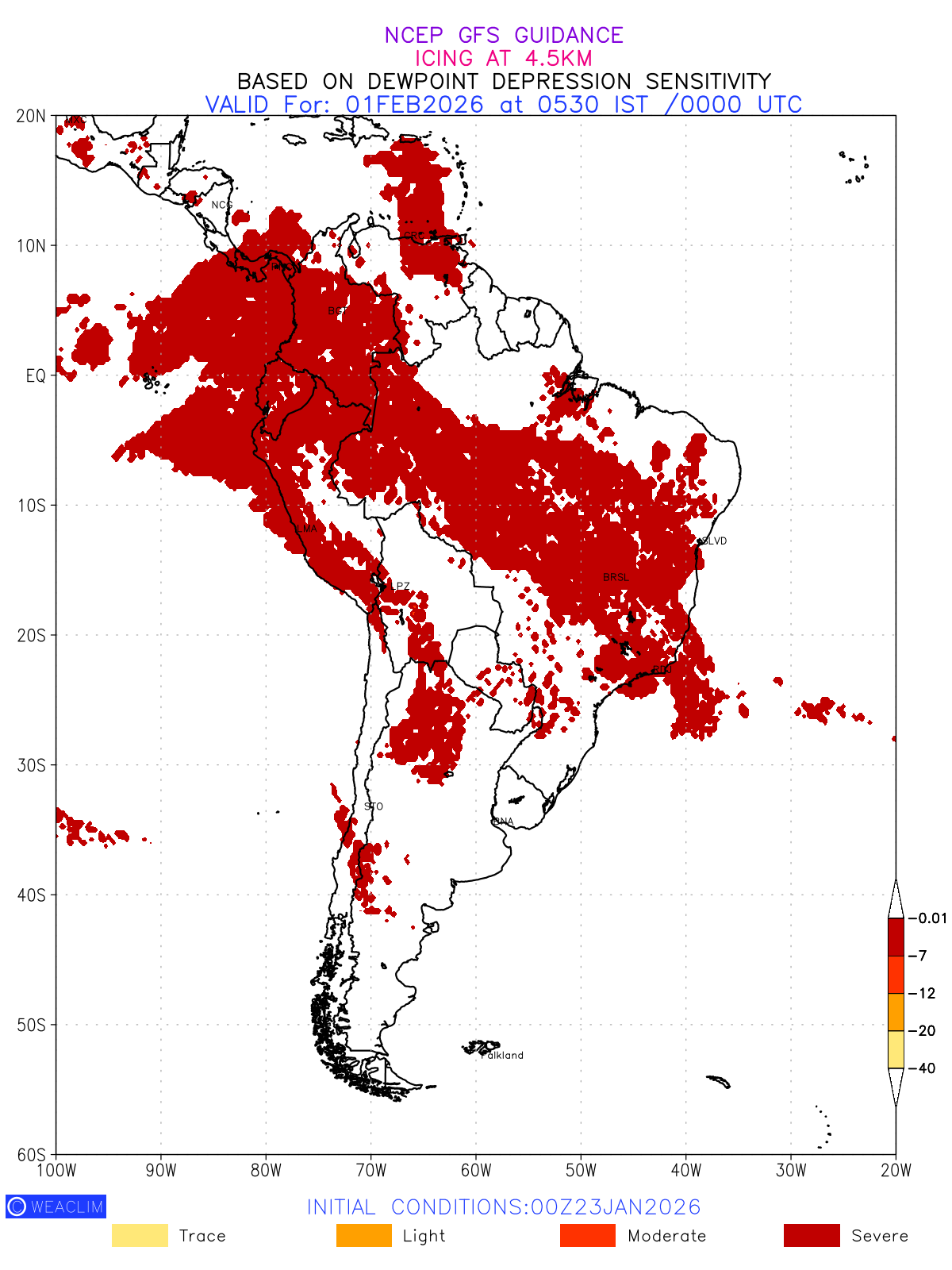 Known icing conditions exist when visible moisture or high relative humidity combines with temperatures near or below freezing. Icing conditions are only present in temperatures between 0ºC and -40ºC, with the highest risk occurring between 0ºC and -15ºC. The size and temperature of the supercooled water droplets that impact on the aircraft determine the category of ice that is formed. Icing is prominent between 600hPa to 700hPa level. Shown here is the icing condition at 600hPa level for the South American Region for the next ten days.