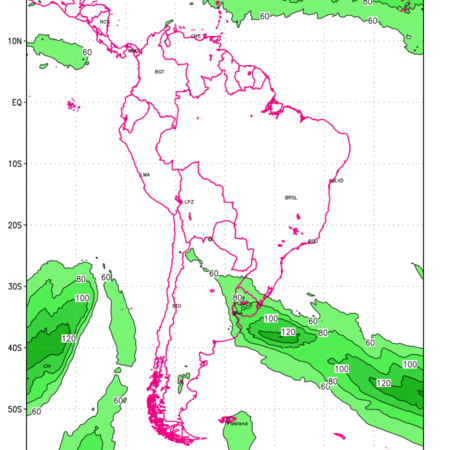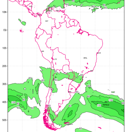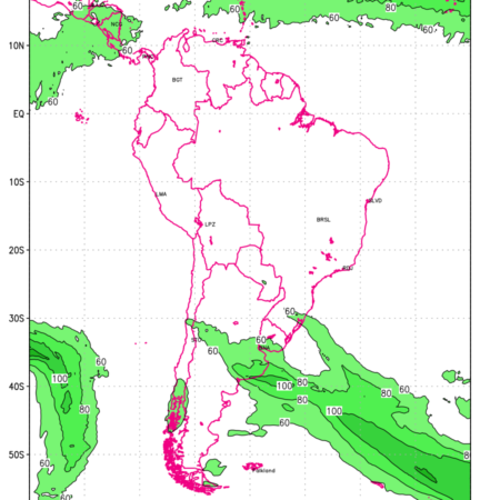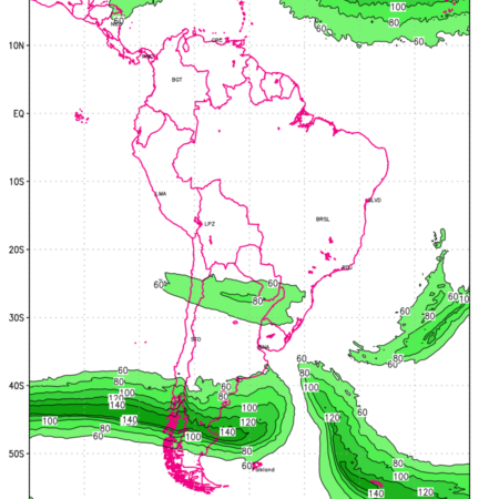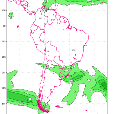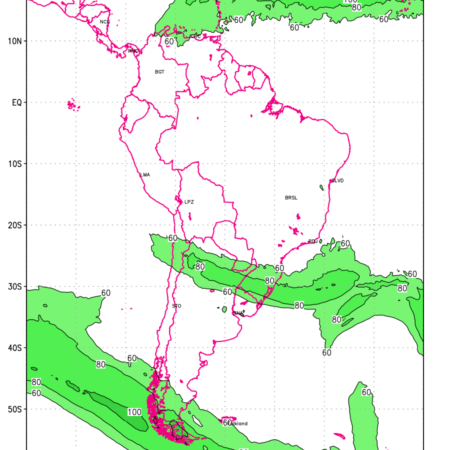 Three features that are significant for aviation are the Jet Stream in upper troposphere, Clear Air Turbulence (CAT) in upper troposphere and Icing in mid troposphere. Shown here is the Jet Stream at 200 hPa for the South American Region for next ten days. Isotachs of winds speed of more than 60 kt are marked at 200 hPa to represent Jet Stream flow at 200 hPa for better appreciation.