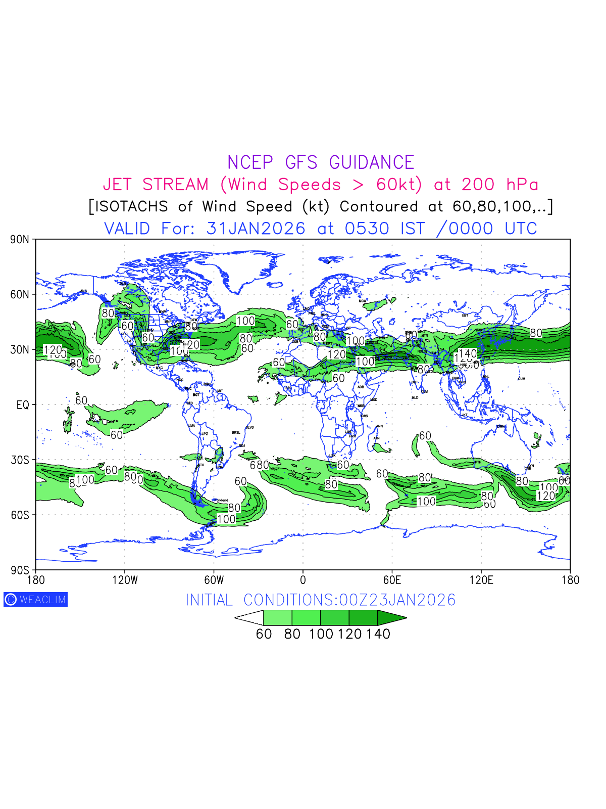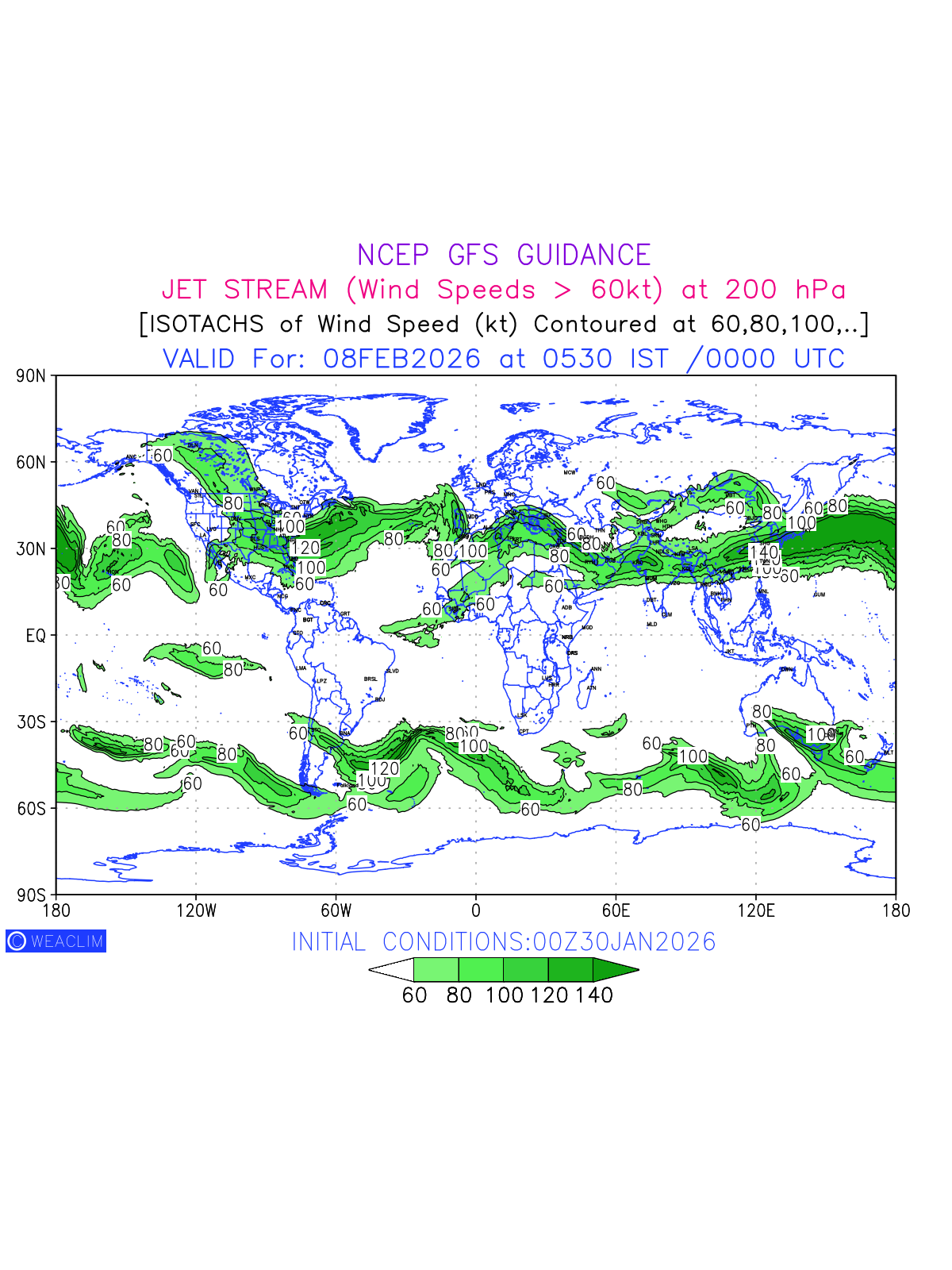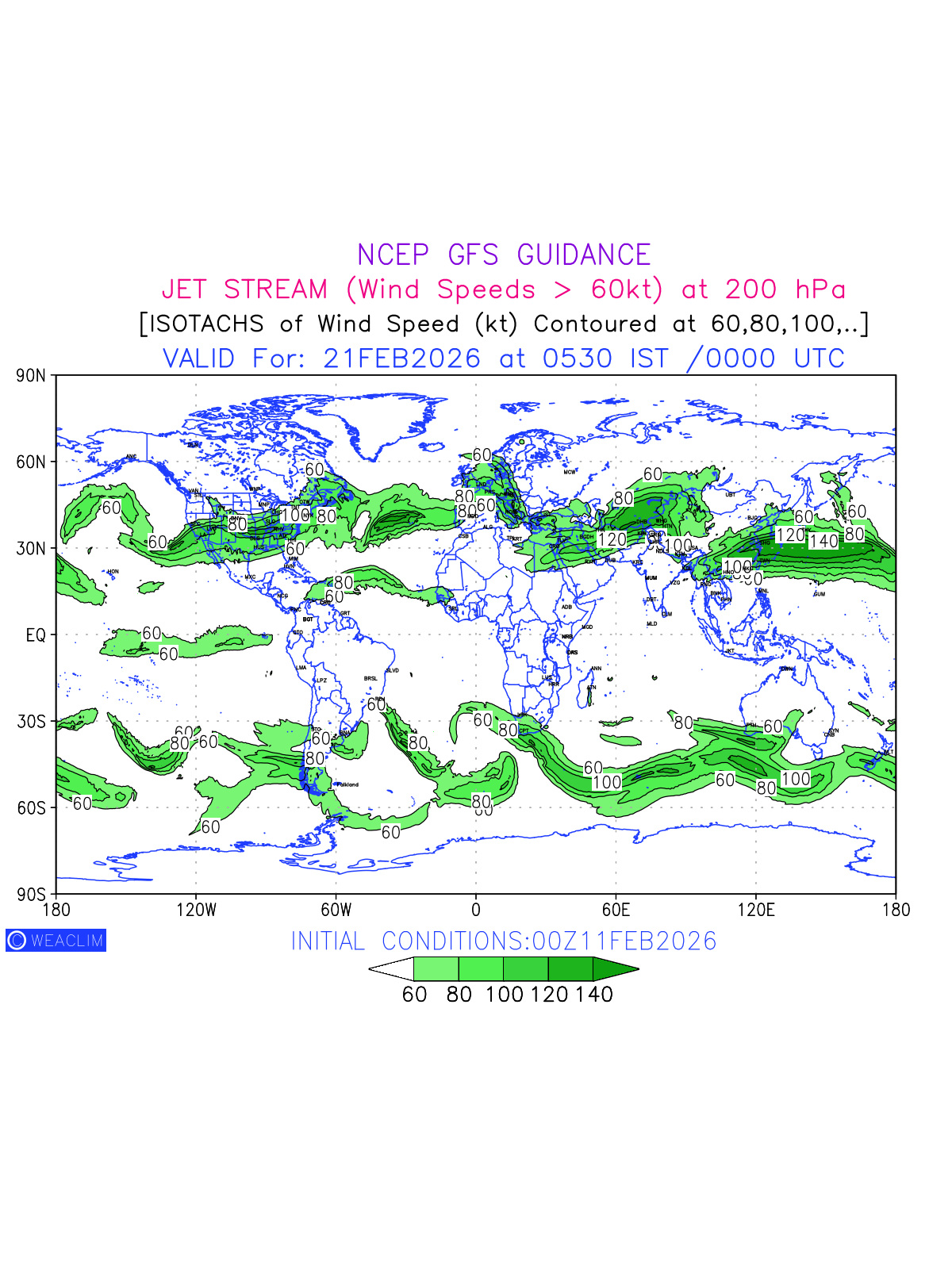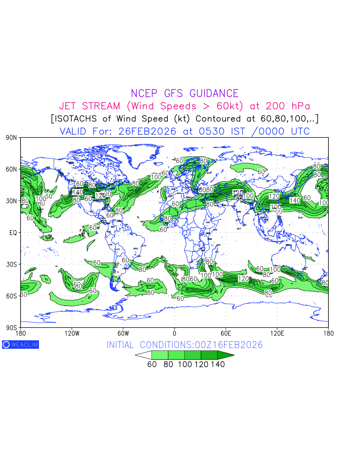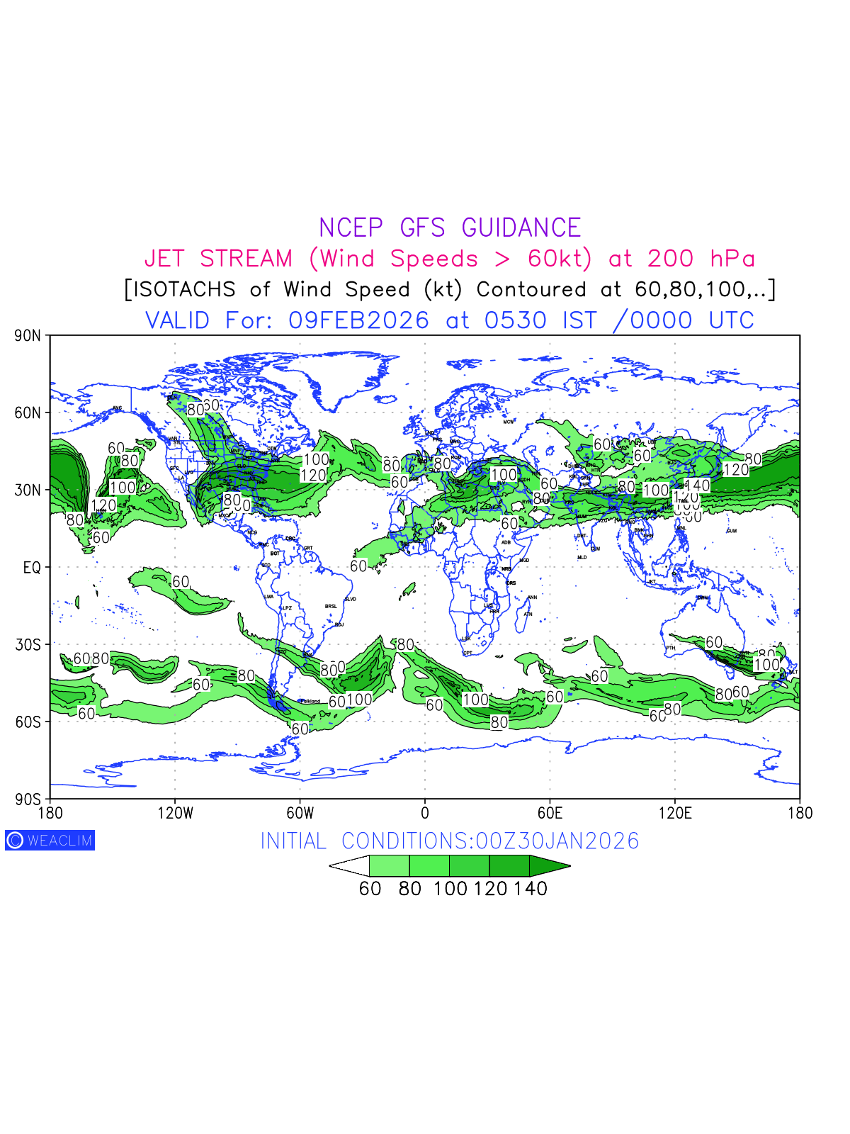 Three features that are significant for aviation are the Jet Stream in upper troposphere, Clear Air Turbulence (CAT) in upper troposphere and Icing in mid troposphere. Shown here is the Jet Stream at 200 hPa for the entire World for next ten days. Isotachs of winds speed of more than 60 kt are marked at 200 hPa to represent Jet Stream flow at 200 hPa for better appreciation.