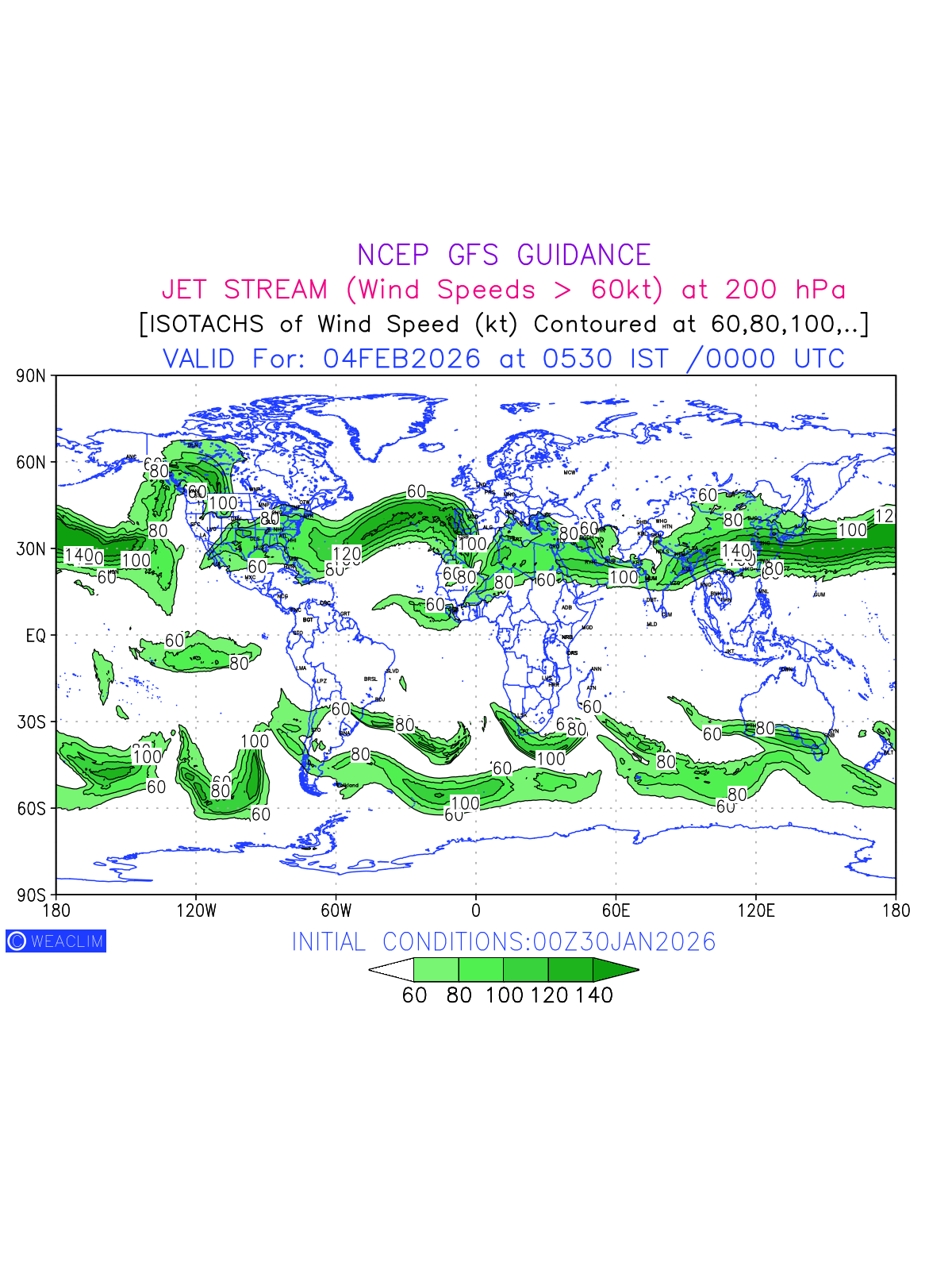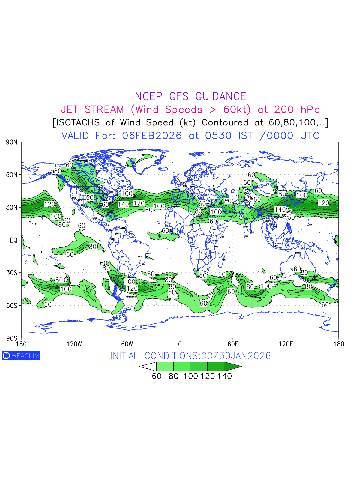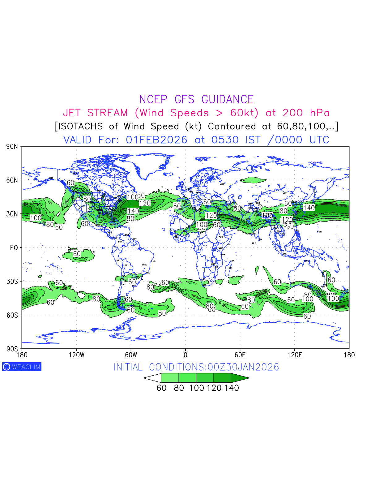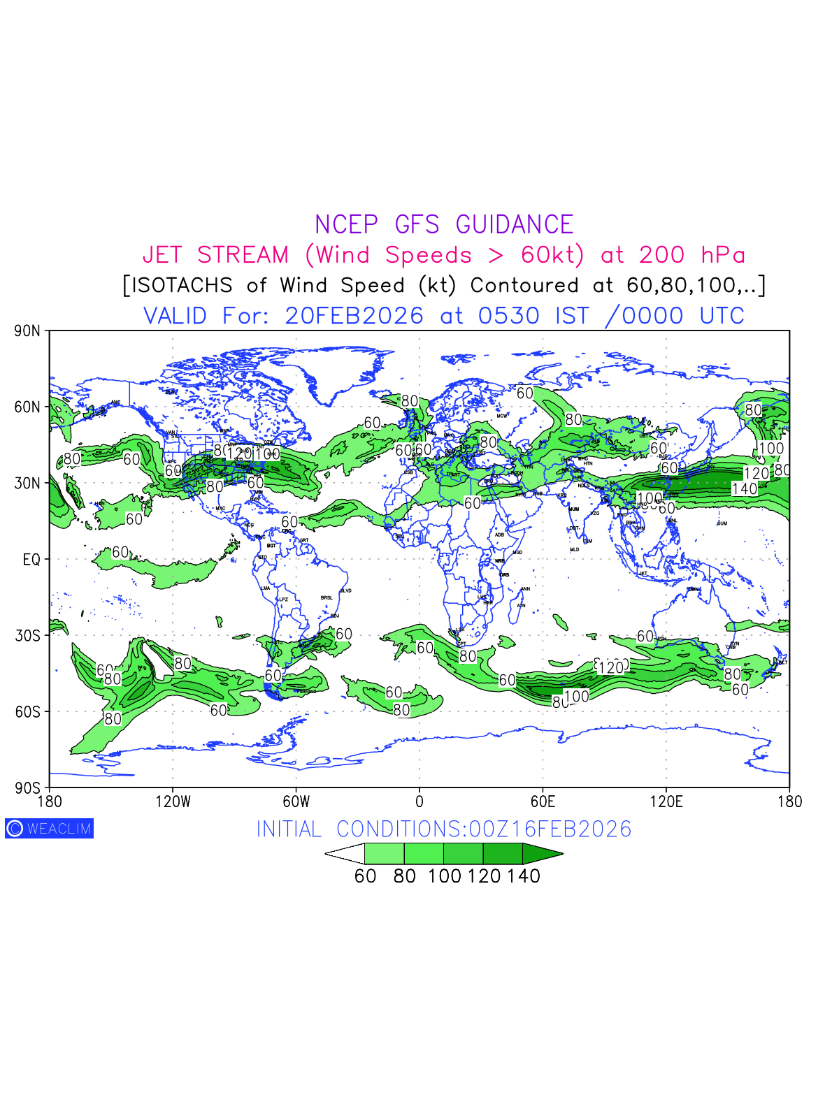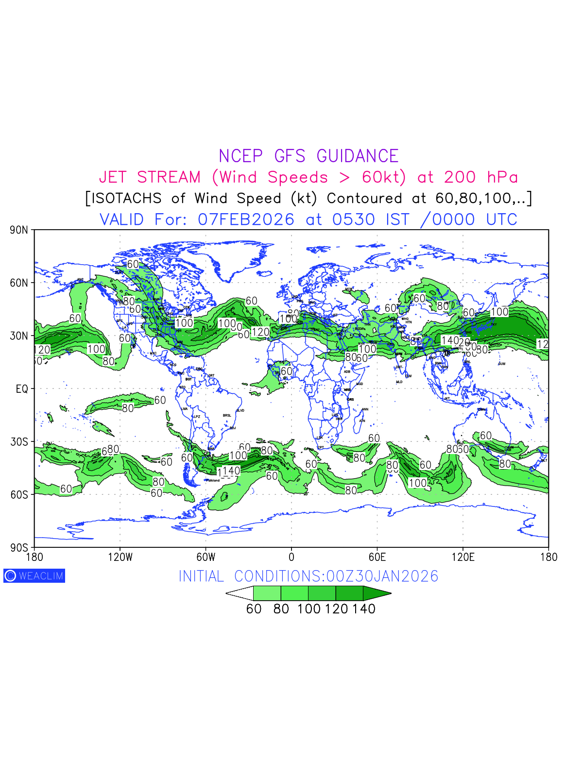 Three features that are significant for aviation are the Jet Stream in upper troposphere, Clear Air Turbulence (CAT) in upper troposphere and Icing in mid troposphere. Shown here is the Jet Stream at 200 hPa for the entire World for next ten days. Isotachs of winds speed of more than 60 kt are marked at 200 hPa to represent Jet Stream flow at 200 hPa for better appreciation.