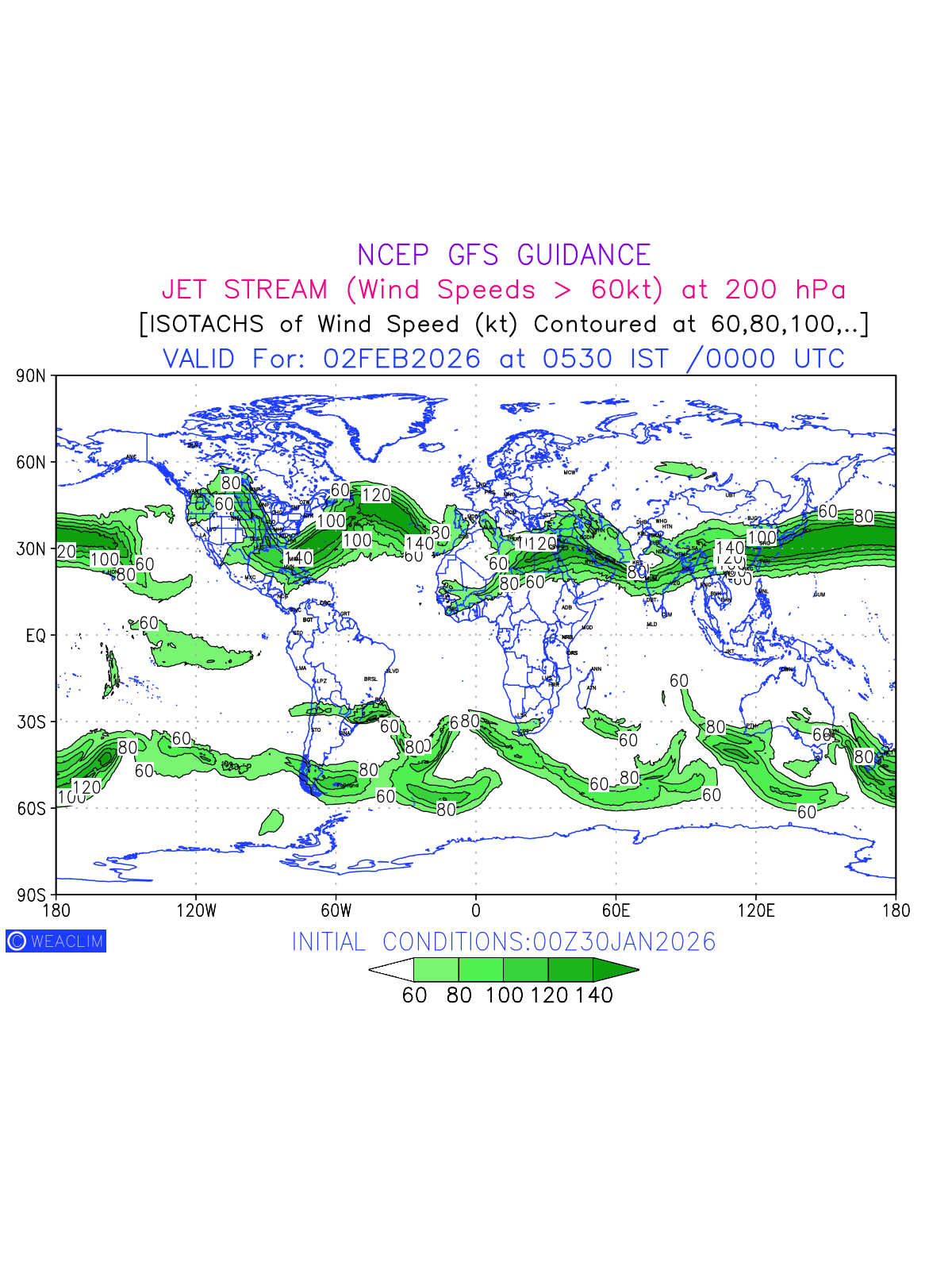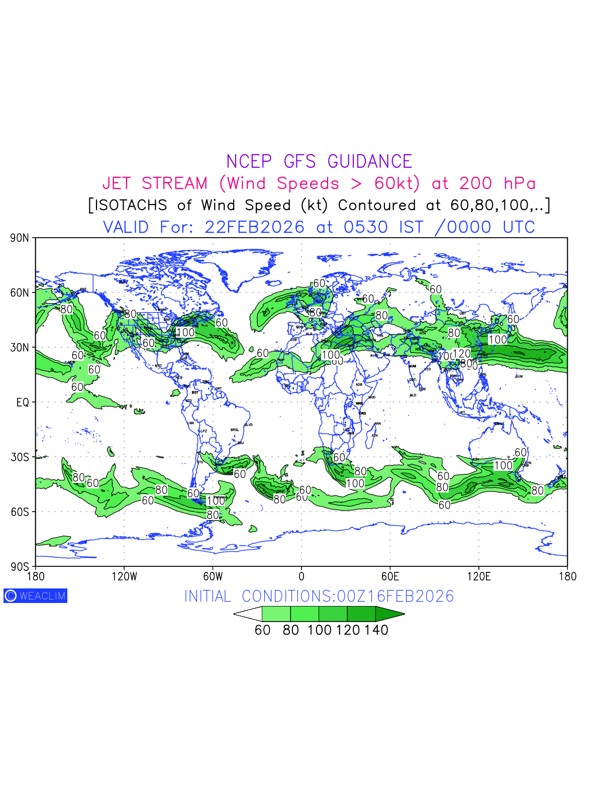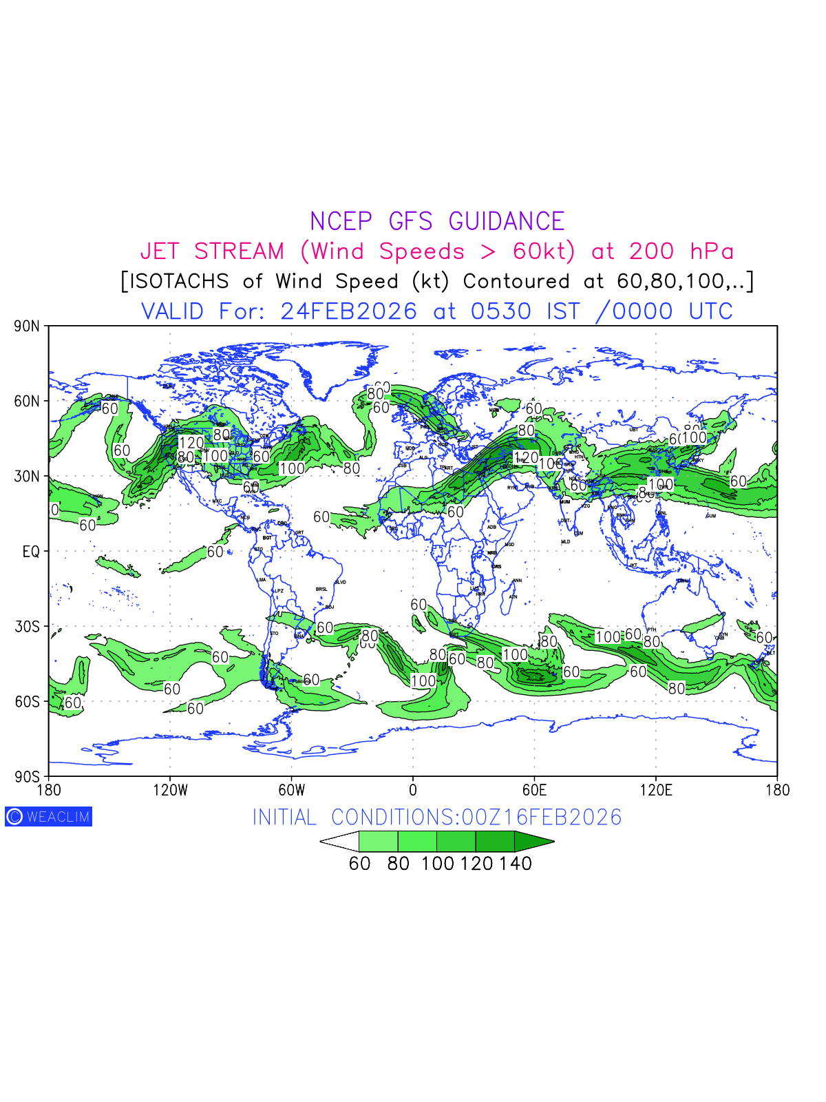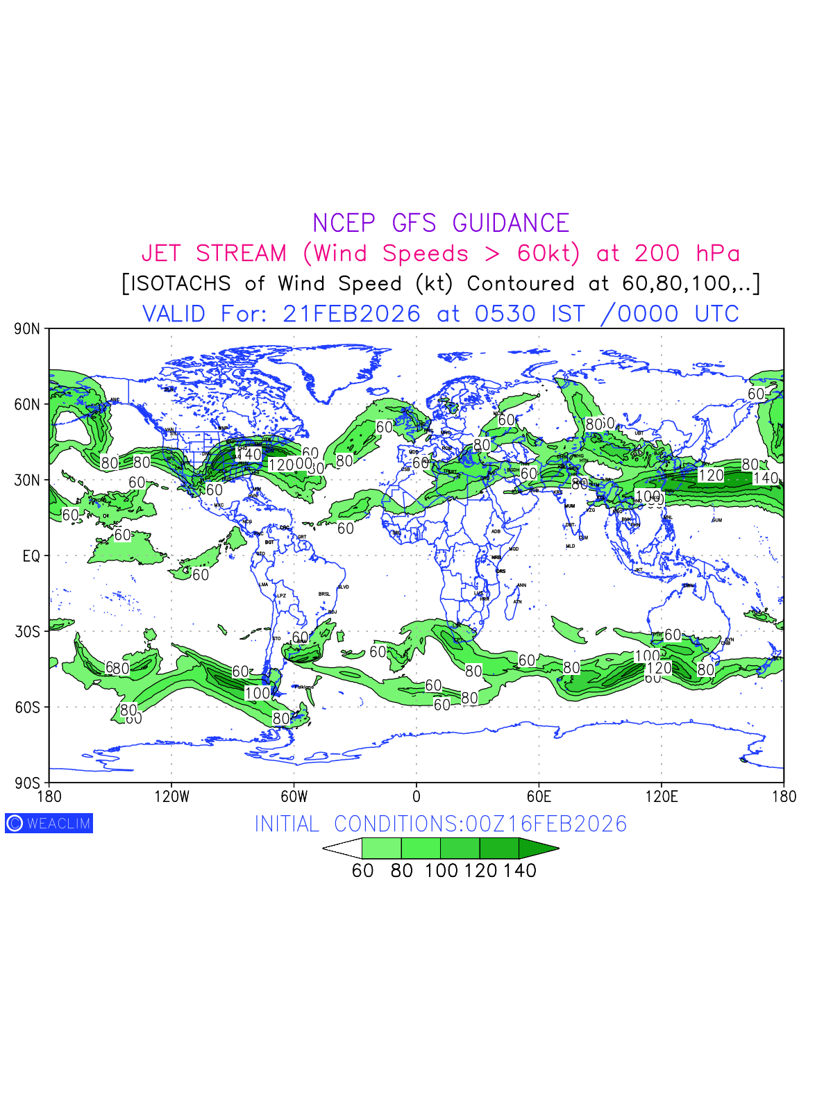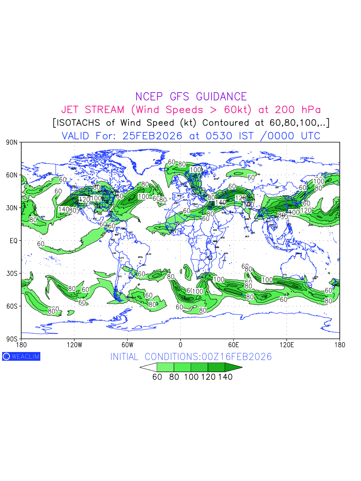 Three features that are significant for aviation are the Jet Stream in upper troposphere, Clear Air Turbulence (CAT) in upper troposphere and Icing in mid troposphere. Shown here is the Jet Stream at 200 hPa for the entire World for next ten days. Isotachs of winds speed of more than 60 kt are marked at 200 hPa to represent Jet Stream flow at 200 hPa for better appreciation.