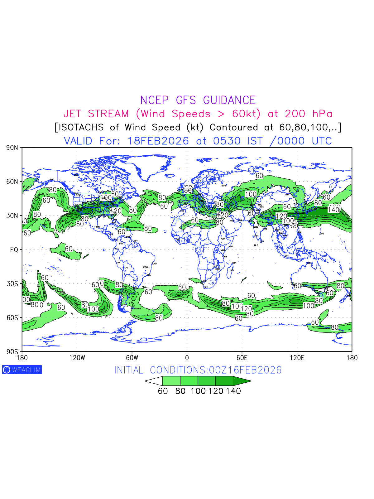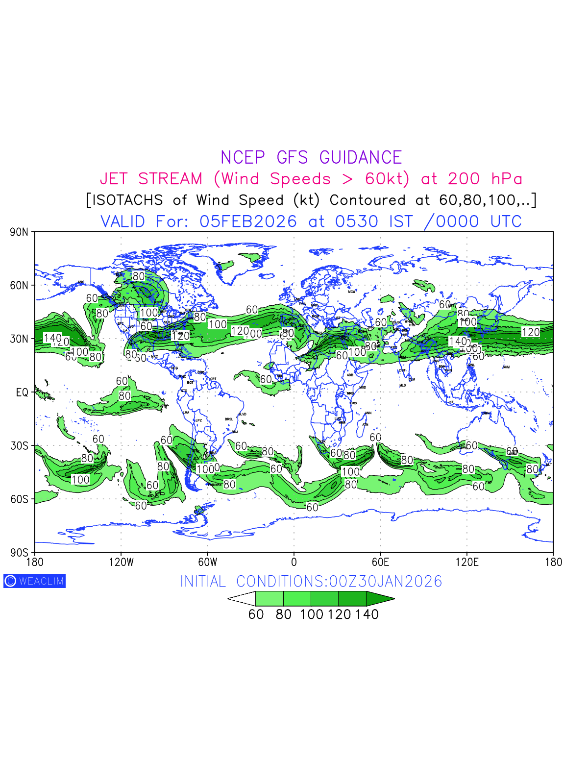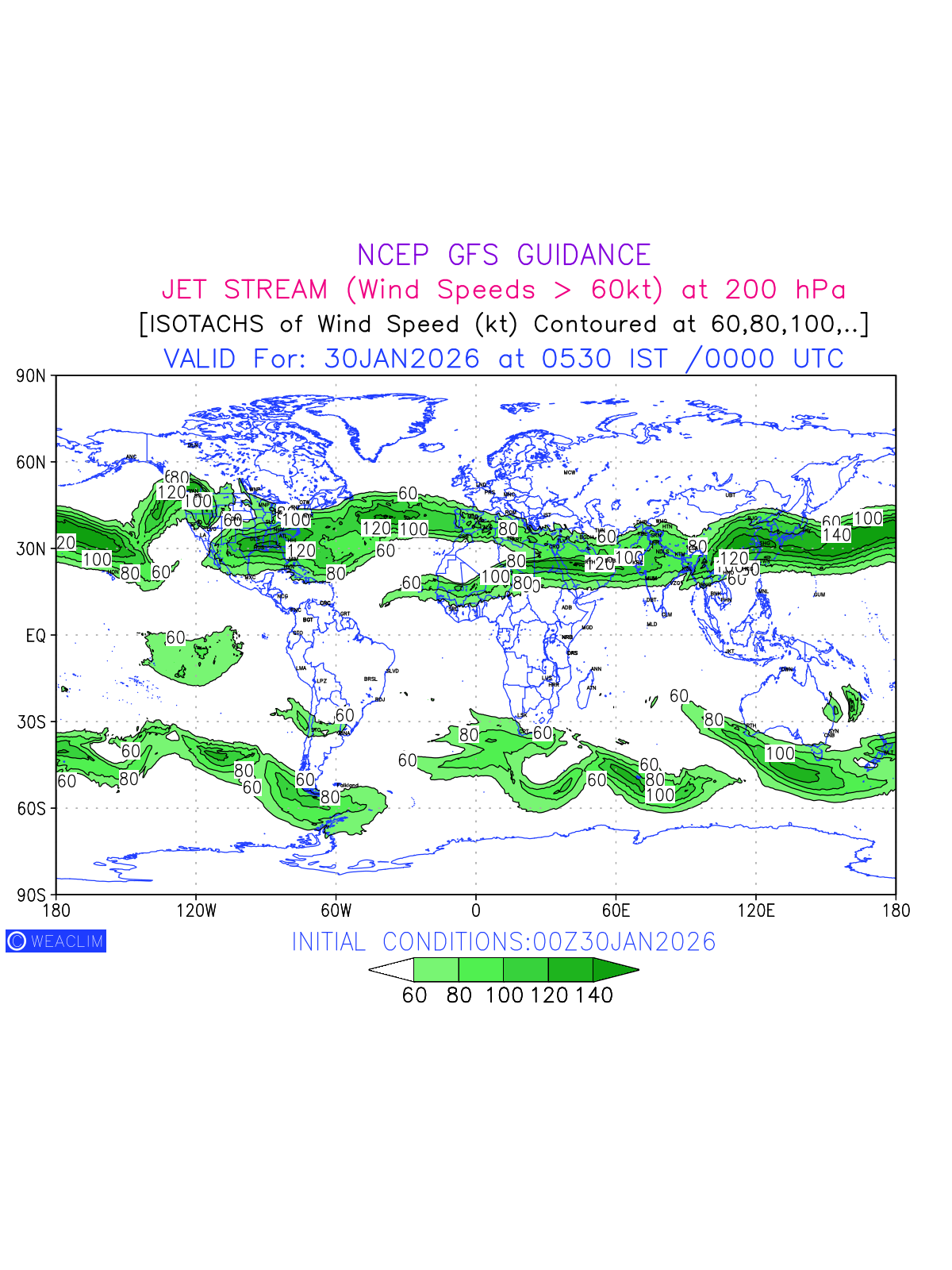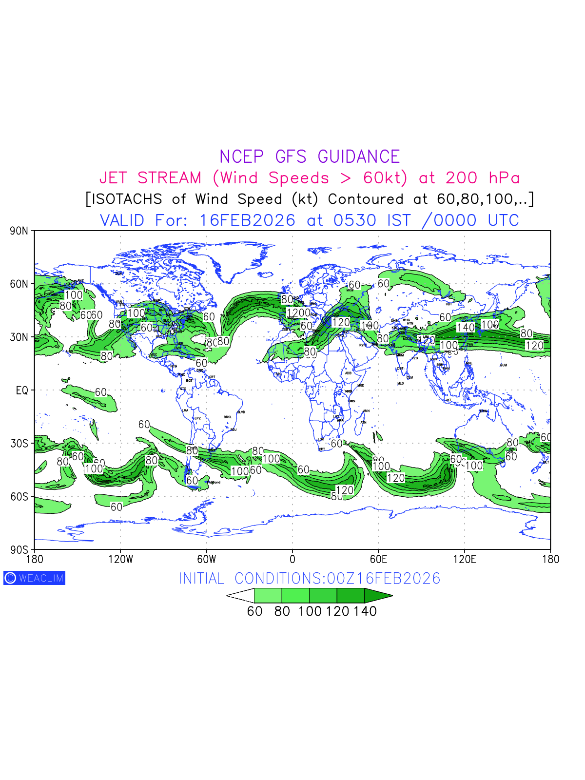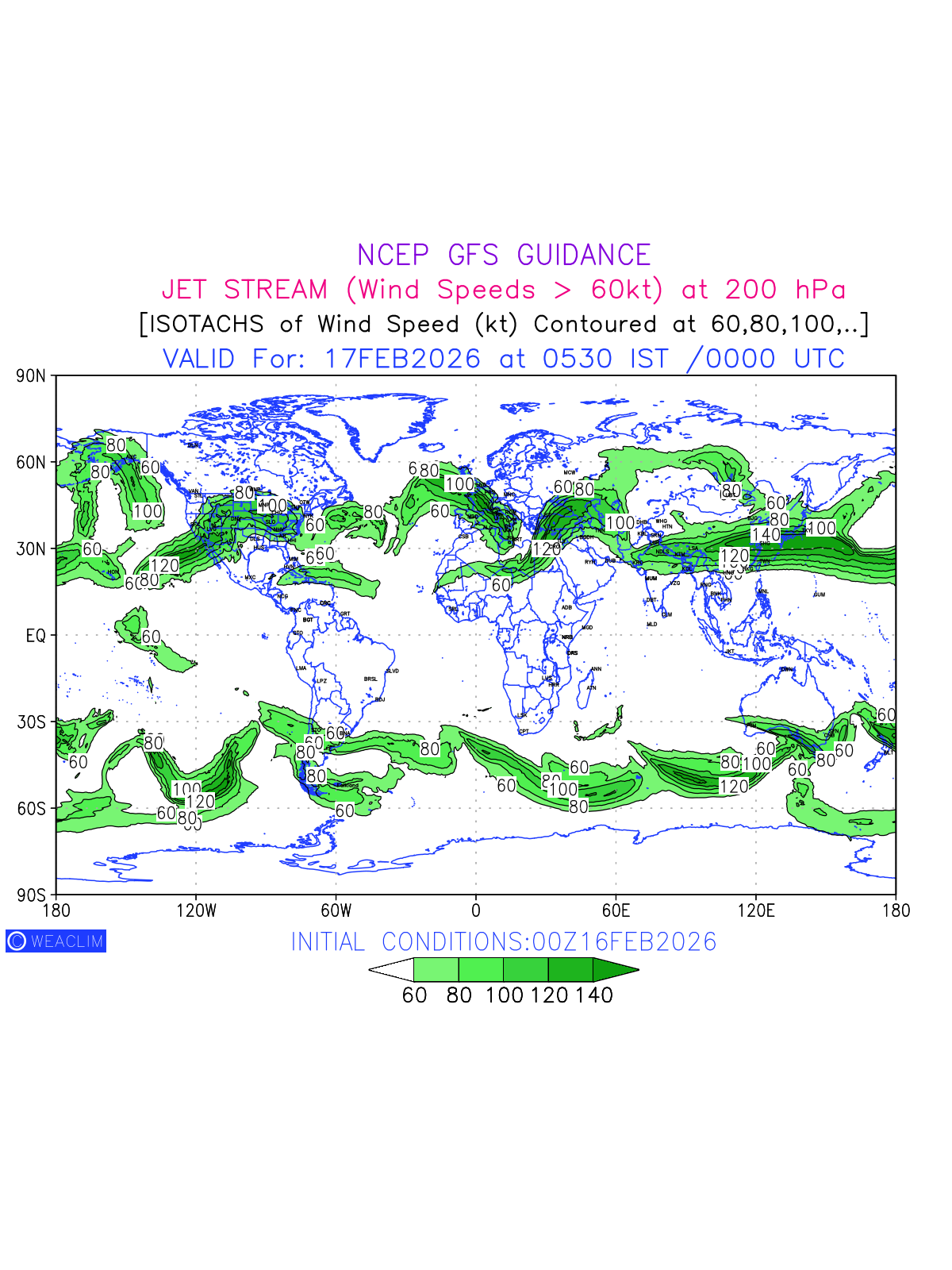Three features that are significant for aviation are the Jet Stream in upper troposphere, Clear Air Turbulence (CAT) in upper troposphere and Icing in mid troposphere. Shown here is the Jet Stream at 200 hPa for the entire World for next ten days. Isotachs of winds speed of more than 60 kt are marked at 200 hPa to represent Jet Stream flow at 200 hPa for better appreciation.