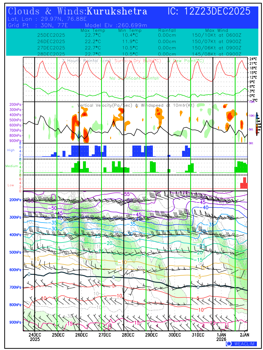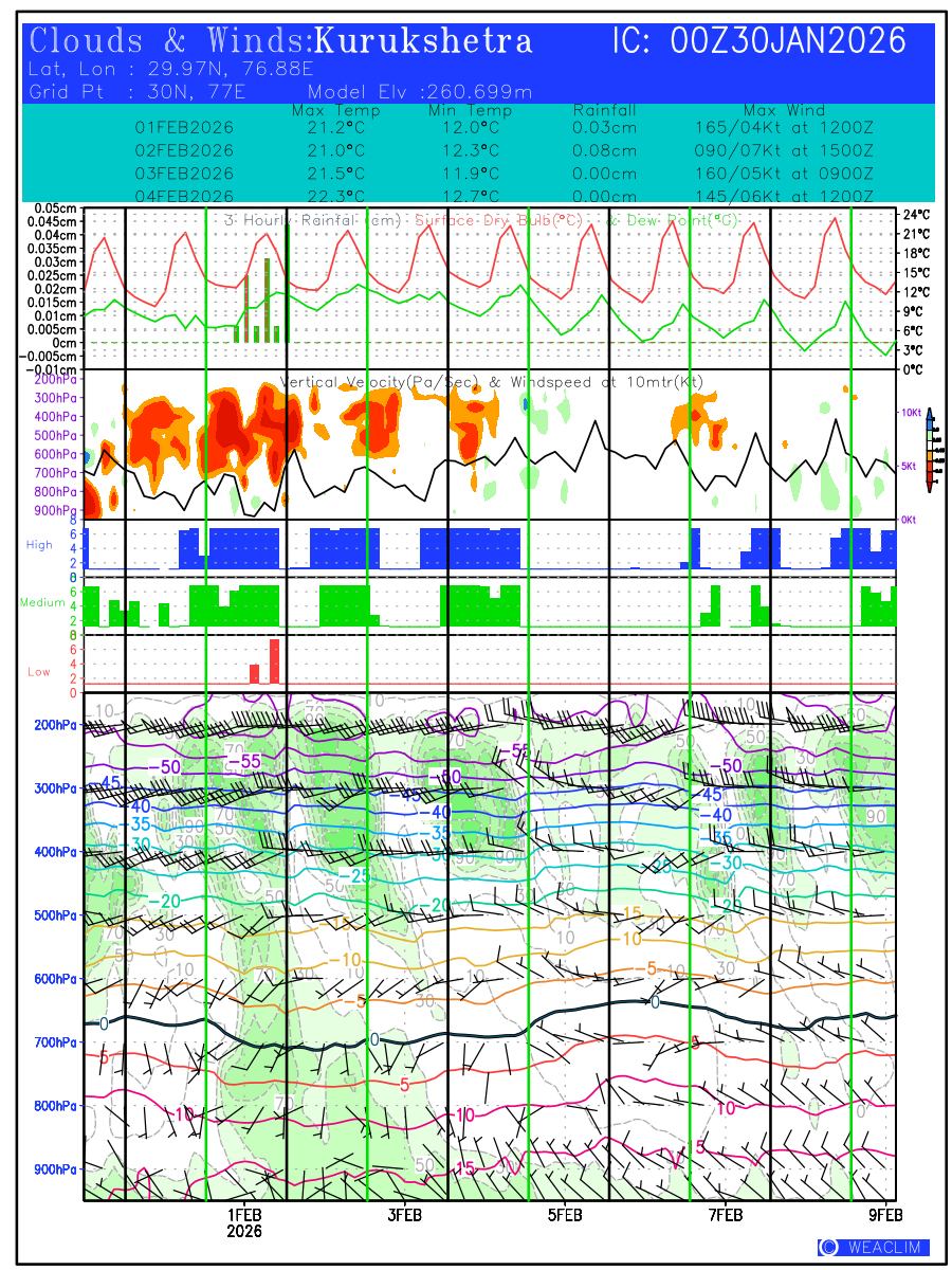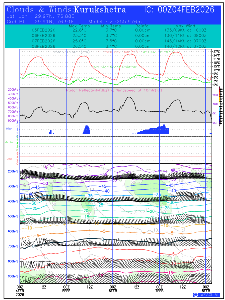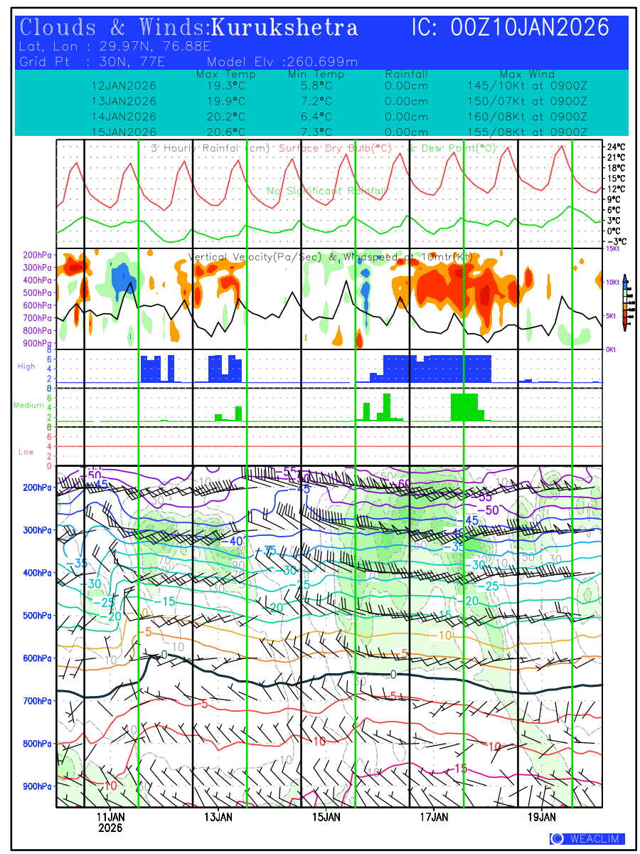 Location Specific Forecasts or Meteograms are graphics that display predicted meteorological data over time for a particular location. They provide a convenient way to quickly visualize and interpret complex weather data, allowing users to make informed decisions based on the latest weather information. These predictions are customised to a time frame with validity of ten days from the date of issue. First Panel at the bottom is the time height representation of the atmospheric profile from surface to 100 hPa level showing the magnitude and direction of winds through wind barbs, isotherm of temperature with freezing level depicted in black and the relative humidity contoured and shaded in green. Second, third and fourth panels show the oktas of low, medium and high clouds in red, green and blue colors, respectively. The fifth panel shows time height representation of Vertical Velocity (ω in Pa/Sec) contoured in shaded colors and the wind speed at 10 meters (kt). Vertical velocity shows the magnitude of verti al winds with negative values showing upward movement (causing formation of convective clouds) and positive values showing downward movement (leading to clear skies) of the airmass at the selected location. The sixth panel shows the Hourly Rainfall (in cm) along with Surface Dry Bulb and Dew Point Temperatures ( o C) over the time period of next ten days. The seventh panel shows the values of predicted Maximum and Minimum Temperature ( o C), Rainfall amount (in cm) and time of Maximum Winds (kt) expected during the next three days.The eighth panel at the top gives the general information on name of the selected location, time of initial conditions (in UTC), latitude and longitude of the location and its model elevation.