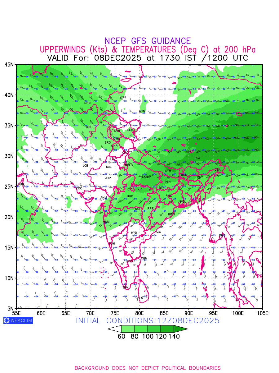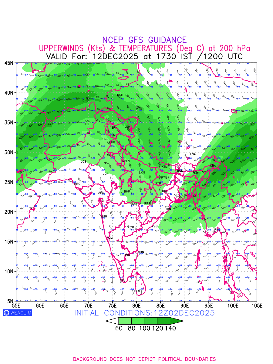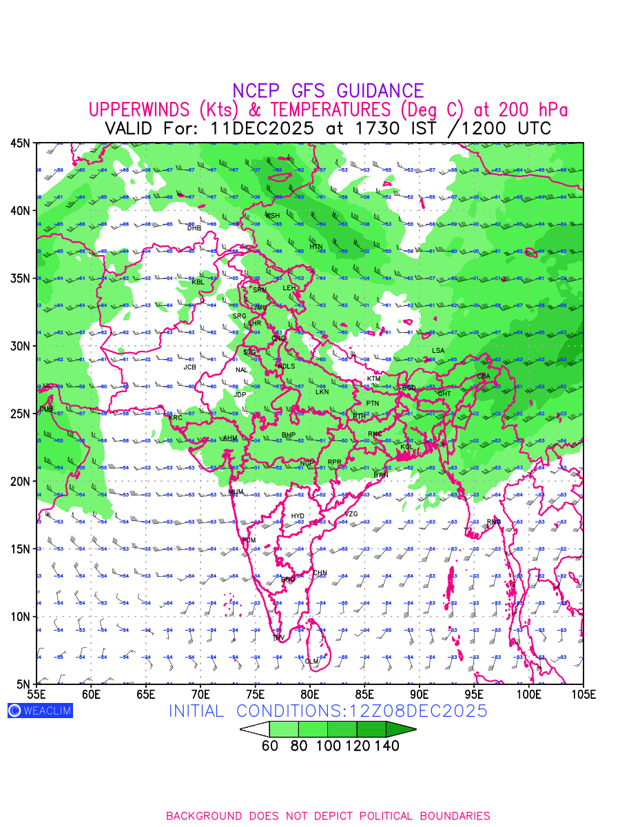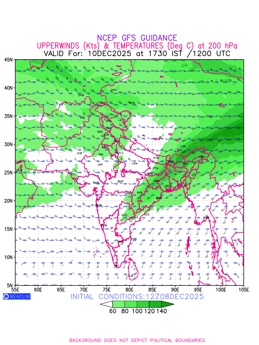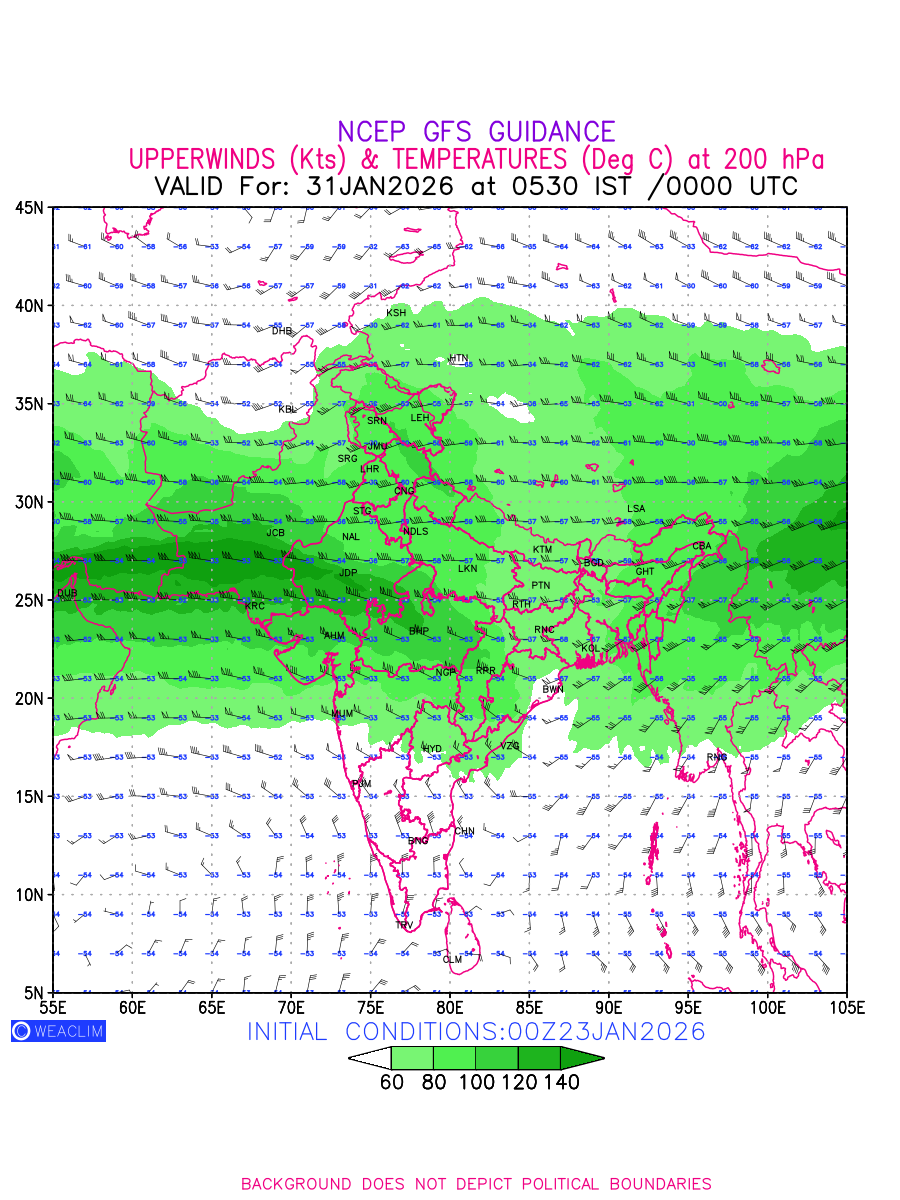 Winds at 200 hPa at the 24th hour for India and adjoining countries refers to the predicted wind direction and speed at a pressure level of 200 hPa, which is located in the upper troposphere (approximately 12 Km or 7.5 miles above the Earths surface). The winds are presented knots (kt), and the direction is given in degrees from true north. ‘Jet Streams’ are marked in shades of green for winds with magnitude of more than 60 kt is a narrow band of high-speed winds that can influence weather patterns over large areas. Along with the wind speed (kt) and direction, upper air temperatures (Deg C) are also shown at the grid points over the Indian Region at 200 hPa level for the next ten days.