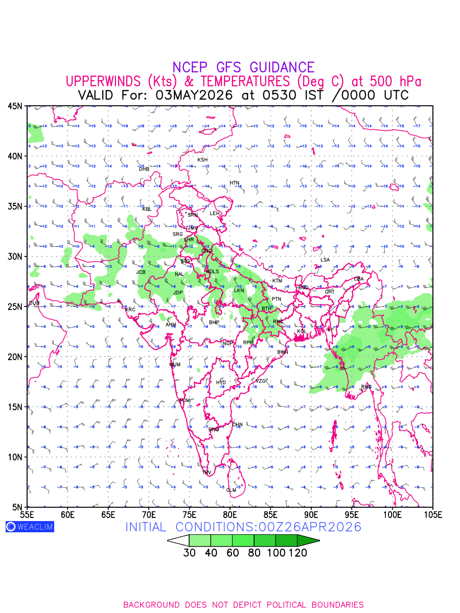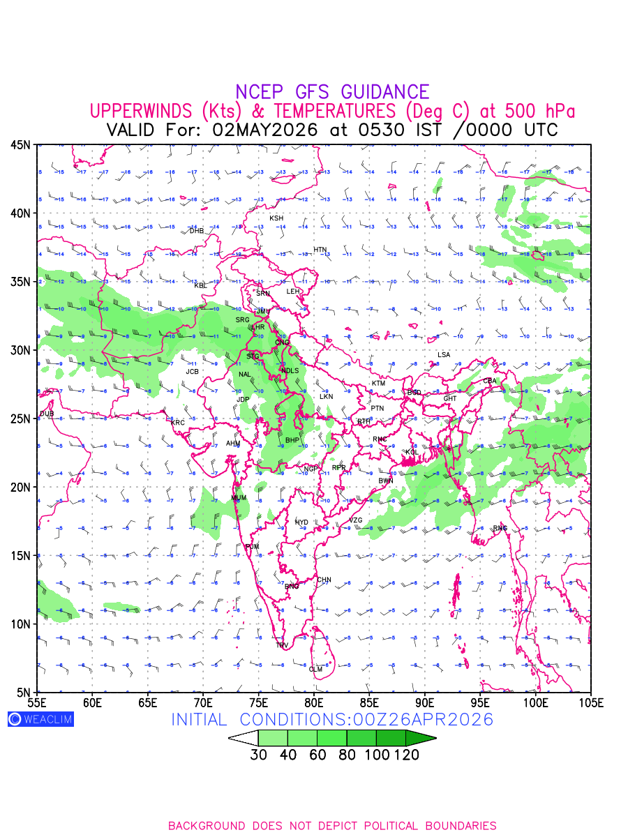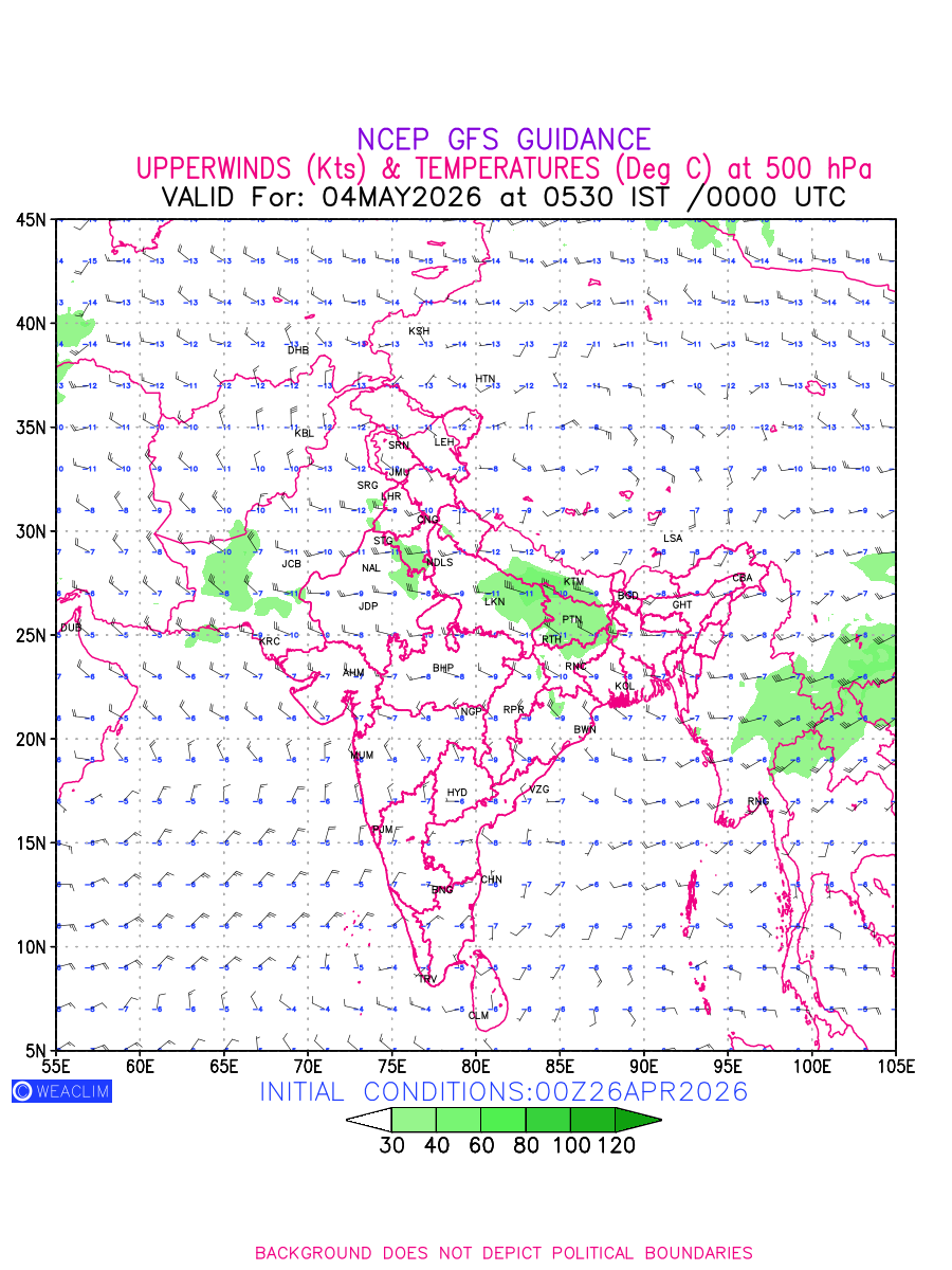 Winds at 500 hPa at the 24th hour for India and adjoining countries refers to the predicted wind direction and speed at a pressure level of 500 hPa, which is located in the upper troposphere about 5.5 km (18,000 ft) above the Earth’s surface. The winds are presented in knots (kt), and the direction is given in degrees from true north. Winds with magnitude of more than 40 kt are marked in shades of green. It provides important information on forecasting weather patterns, including the movement and intensification of storms, the development of weather fronts, and the location and strength of high and low pressure systems. Along with the wind speed (kt) and direction, upper air temperatures (Deg C) are also shown at the grid points over the Indian Region at 500 hPa level for the next ten days.