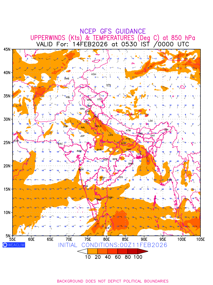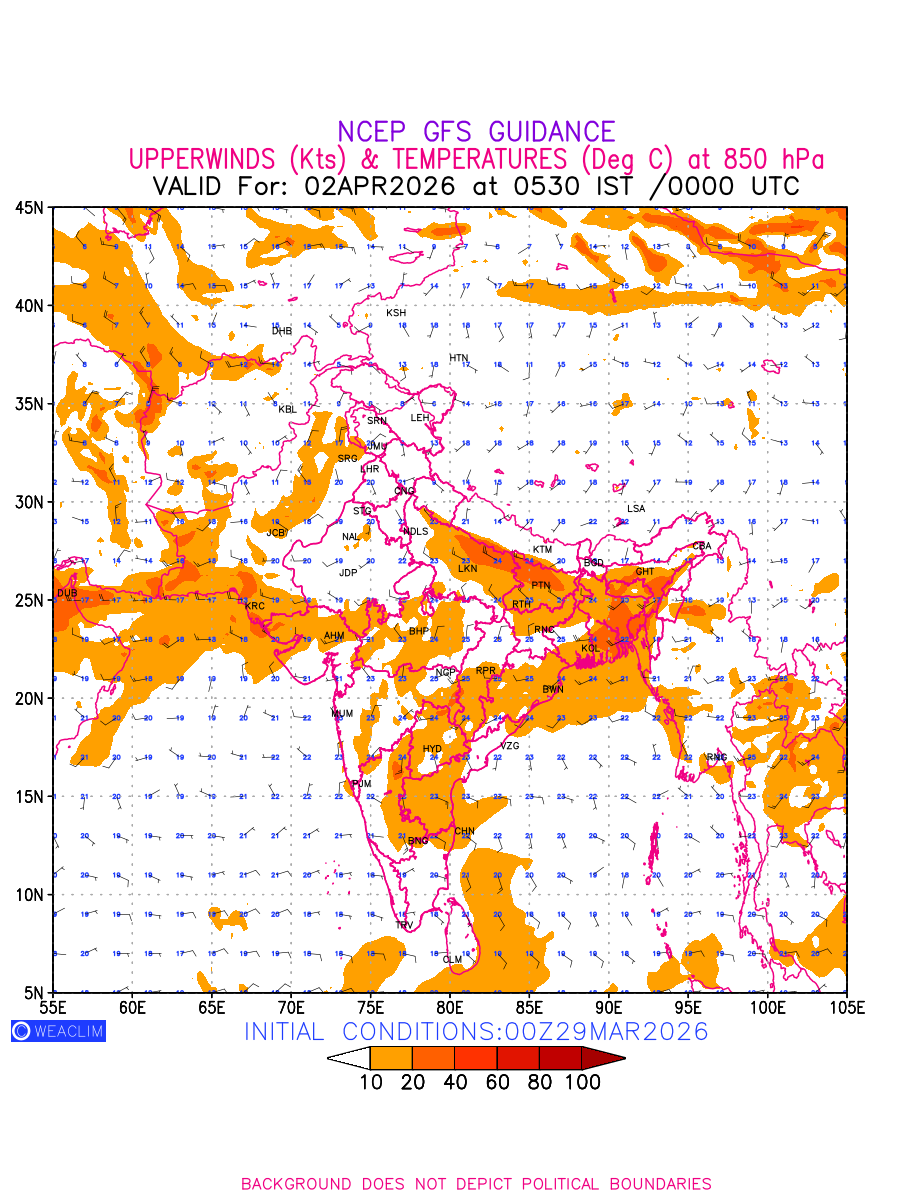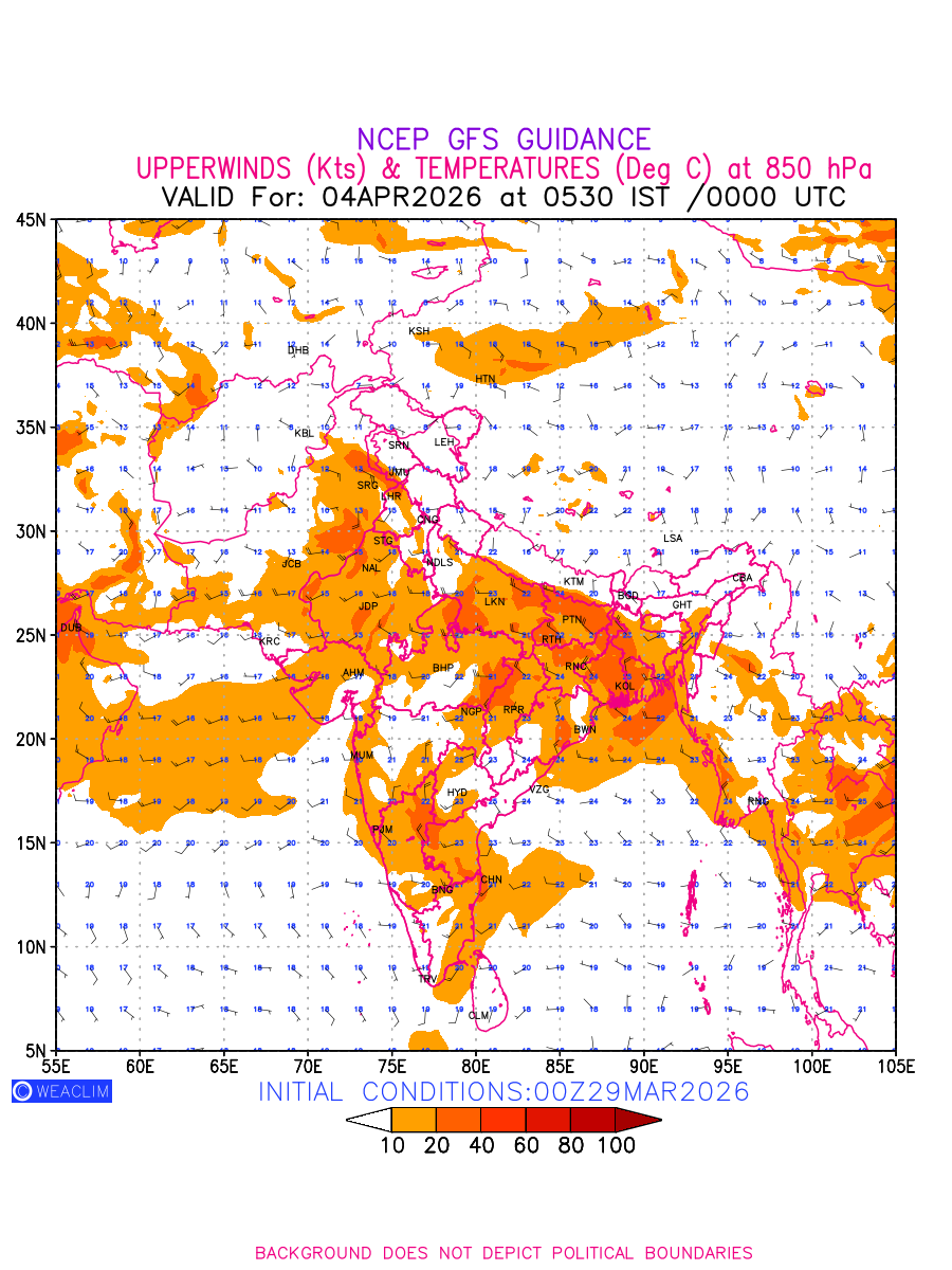 Winds at 850 hPa at the 24th hour for India and adjoining countries refers to the predicted wind direction and speed at a pressure level of 850 hPa, which is located in the lower troposphere (1,500 meters or 5,000 feet above the Earth’s surface). The winds are presented in knots (kt), and the direction is given in degrees from true north. Winds with magnitude of more than 20 kt are marked in shades of red. Being close to the Earth’s surface it is strongly influenced by surface features such as mountains, valleys, and bodies of water. It gives insight into the strength and direction of wind flow in the lower troposphere, affecting the movement of weather systems and the transport of heat, moisture, and pollutants in the atmosphere. Along with the wind speed (kt) and direction, upper air temperatures (Deg C) are also shown at the grid points over the Indian Region at 850 hPa level for the next ten days.