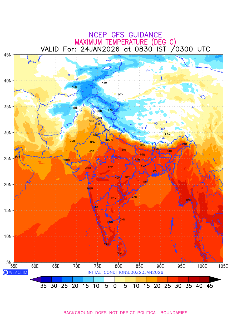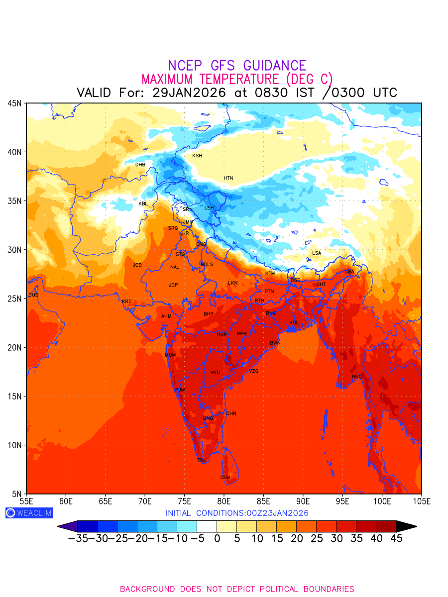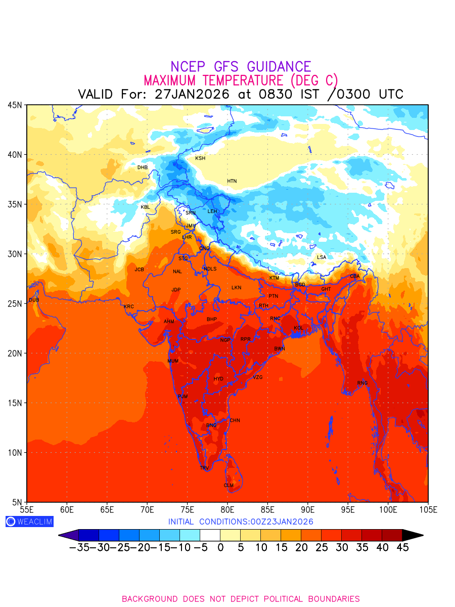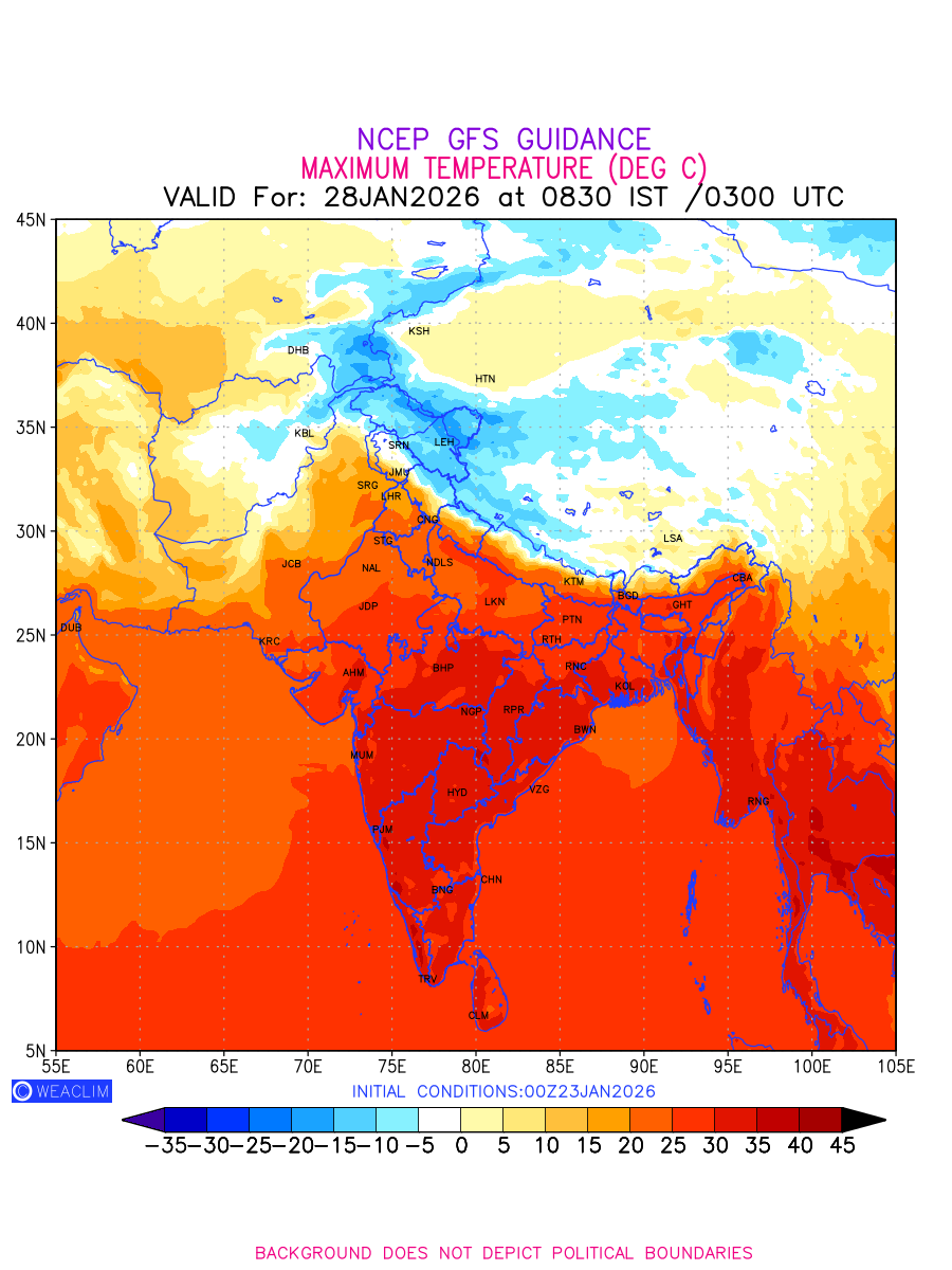 Maximum Temperature for India and adjoining countries depicts the highest temperatures at 2m above the ground surface between 0300 UTC of the previous date to 0300 UTC of the required date. This is an important variable for weather forecasting, as it determines the conditions at the Earth’s surface during the warmest part of the date, affecting human activities, agriculture, and the environment. 2m Temperature data can be used for a variety of applications, such as predicting the onset of heatwaves or cold spells, forecasting temperature trends,and studying the impact of weather on various systems and processes.