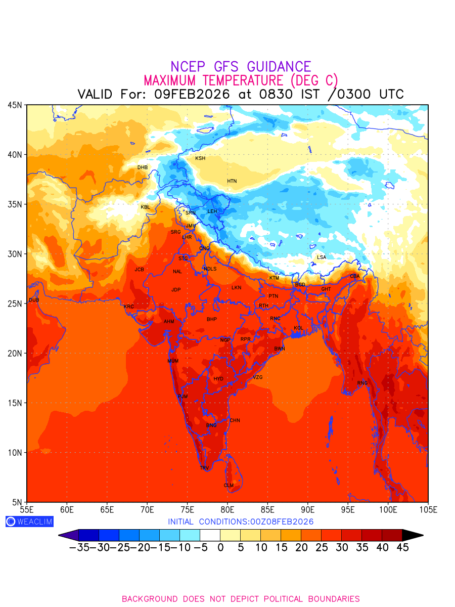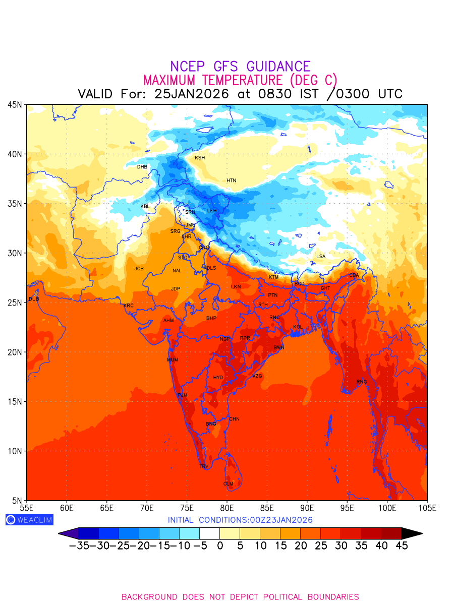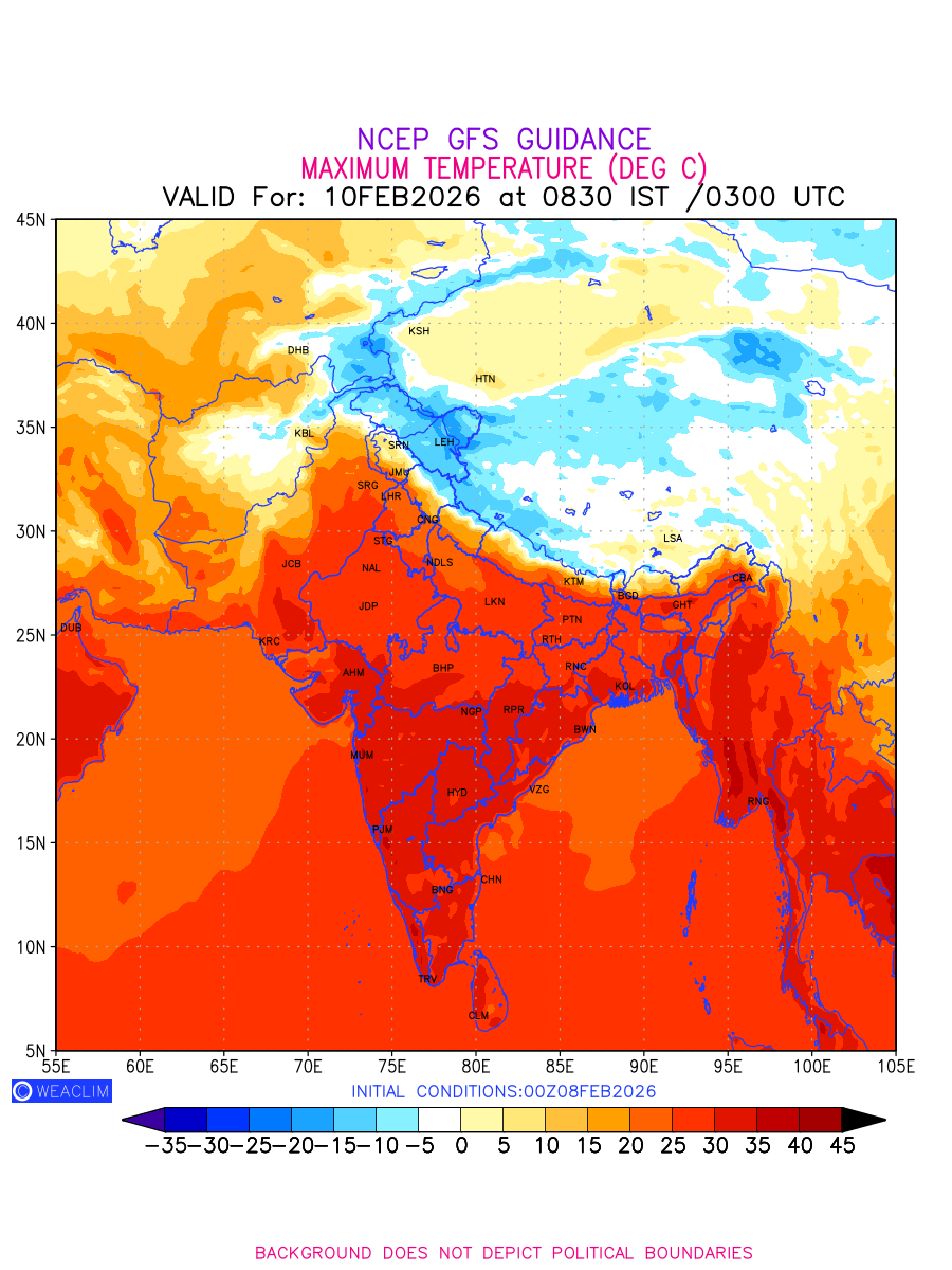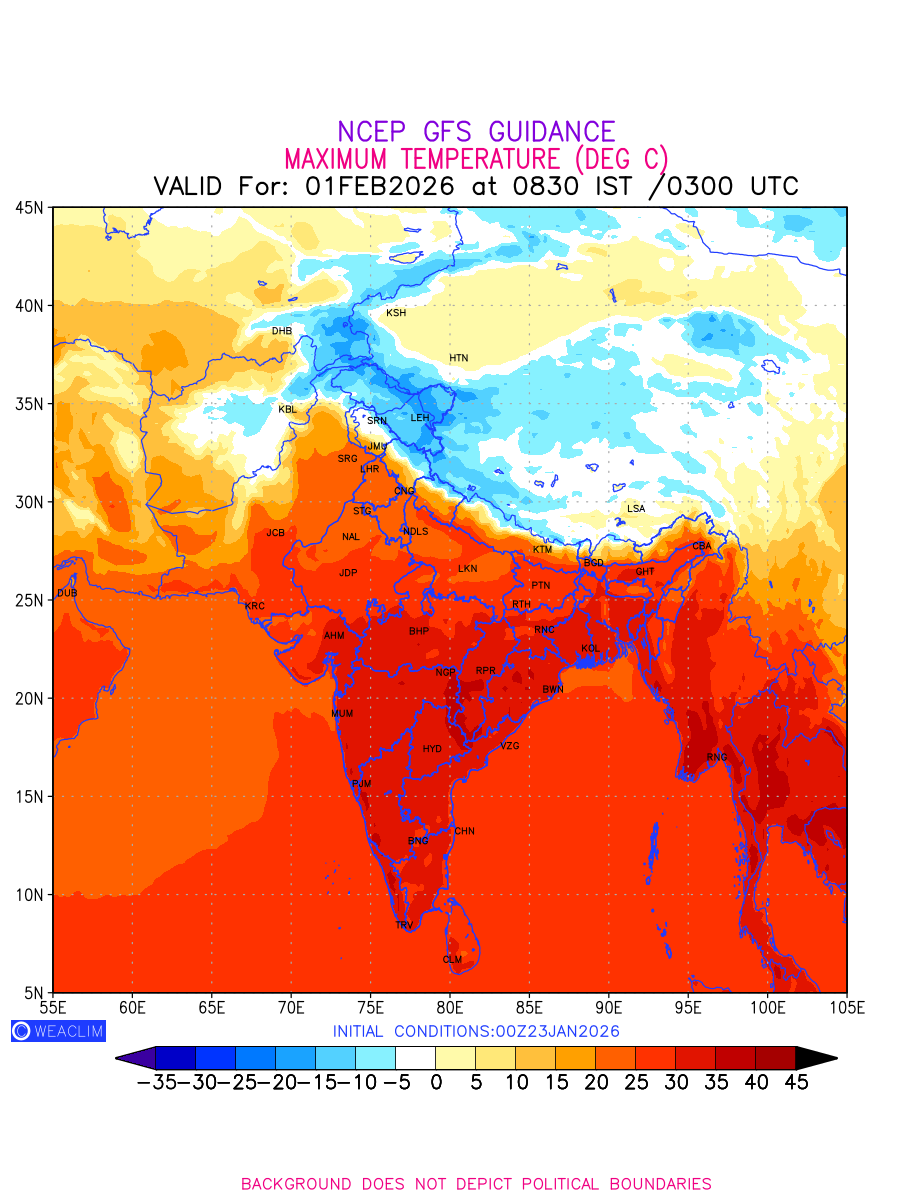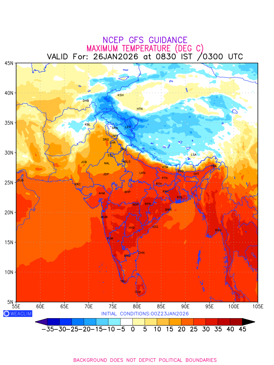 Maximum Temperature for India and adjoining countries depicts the highest temperatures at 2m above the ground surface between 0300 UTC of the previous date to 0300 UTC of the required date. This is an important variable for weather forecasting, as it determines the conditions at the Earth’s surface during the warmest part of the date, affecting human activities, agriculture, and the environment. 2m Temperature data can be used for a variety of applications, such as predicting the onset of heatwaves or cold spells, forecasting temperature trends,and studying the impact of weather on various systems and processes.