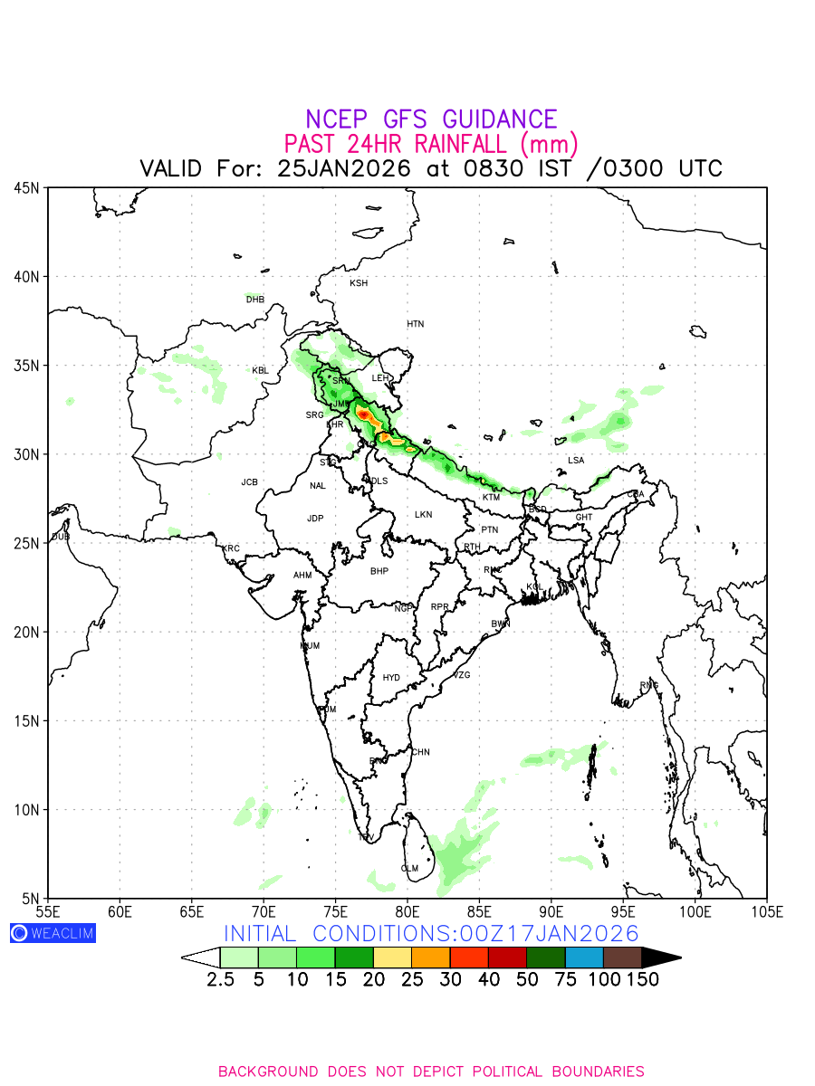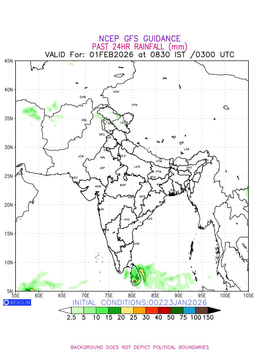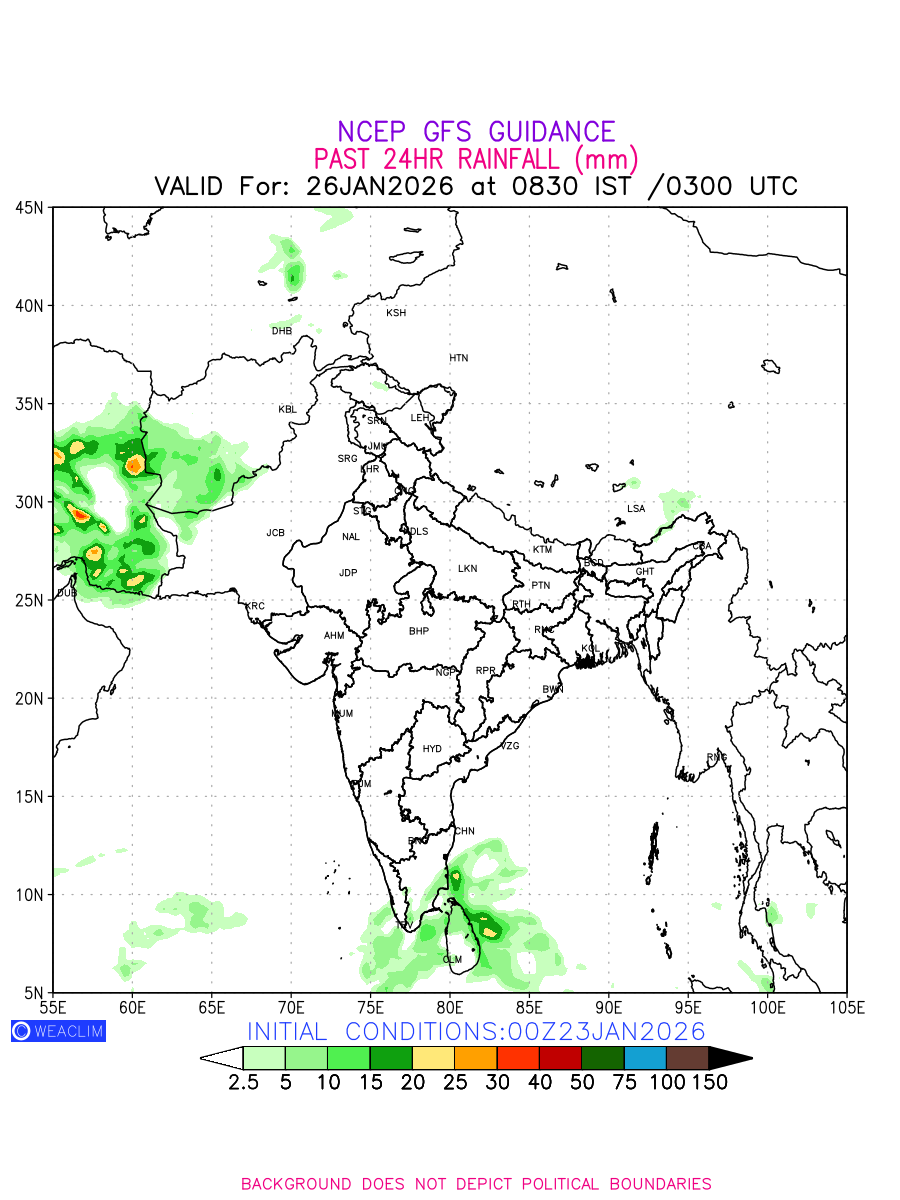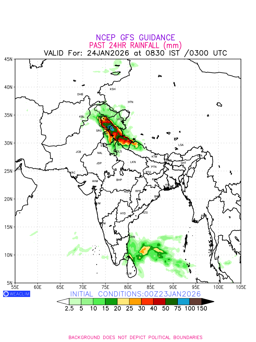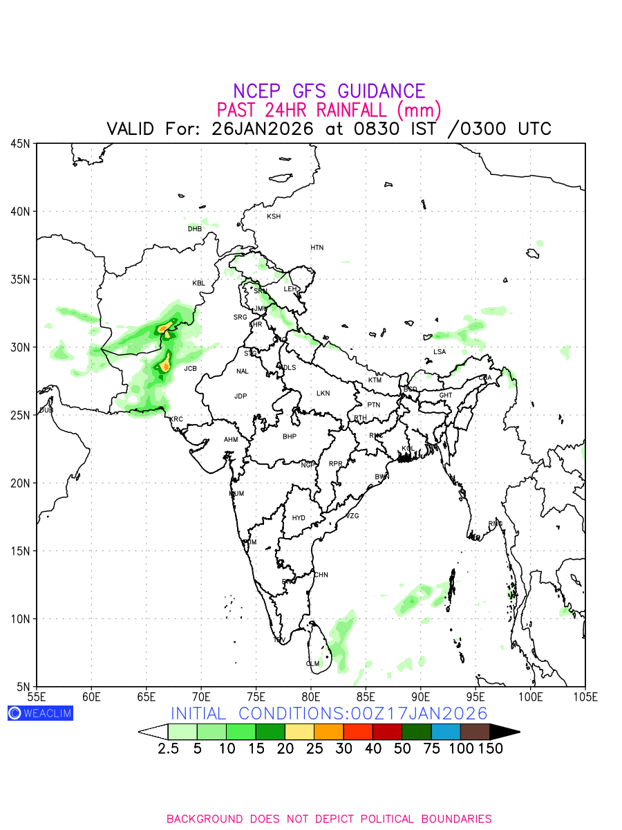 Rainfall forecast for 24 hours for India and adjoining countries is expected amount of precipitation in millimeters for a given area over a time period of 24 hours and valid from 0300 UTC (0830 IST) of the previous date to 0300 UTC of the required date. This prediction enables the users to plan/review their tasks that are affected by rainfall related severe weather events that may lead to flooding, drought, snowfall and avalanche etc.