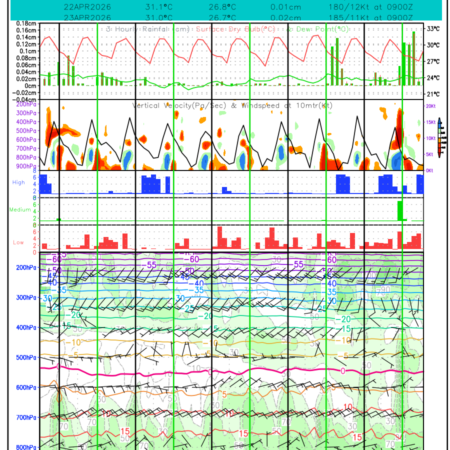 Location Specific Forecasts or Meteograms are graphics that display predicted meteorological data over time for a particular location. They provide a convenient way to quickly visualize and interpret complex weather data, allowing users to make informed decisions based on the latest weather information. These predictions are customised to a time frame with validity of ten days from the date of issue. First Panel at the bottom is the time height representation of the atmospheric profile from surface to 100 hPa level showing the magnitude and direction of winds through wind barbs, isotherm of temperature with freezing level depicted in black and the relative humidity contoured and shaded in green. Second, third and fourth panels show the oktas of low, medium and high clouds in red, green and blue colors, respectively. The fifth panel shows time height representation of Vertical Velocity (ω in Pa/Sec) contoured in shaded colors and the wind speed at 10 meters (kt). Vertical velocity shows the magnitude of verti al winds with negative values showing upward movement (causing formation of convective clouds) and positive values showing downward movement (leading to clear skies) of the airmass at the selected location. The sixth panel shows the Hourly Rainfall (in cm) along with Surface Dry Bulb and Dew Point Temperatures ( o C) over the time period of next ten days. The seventh panel shows the values of predicted Maximum and Minimum Temperature ( o C), Rainfall amount (in cm) and time of Maximum Winds (kt) expected during the next three days.The eighth panel at the top gives the general information on name of the selected location, time of initial conditions (in UTC), latitude and longitude of the location and its model elevation.