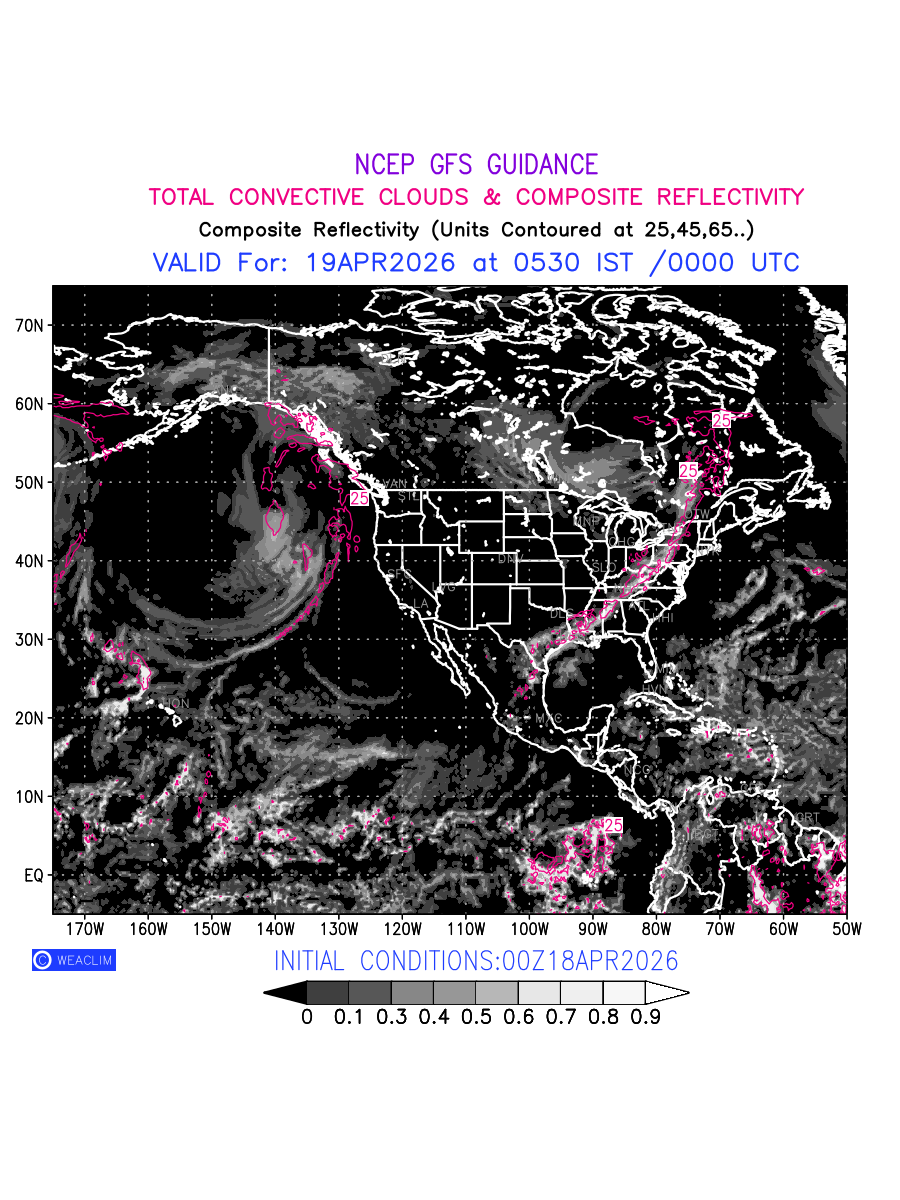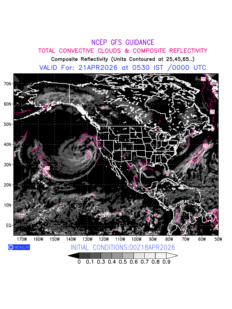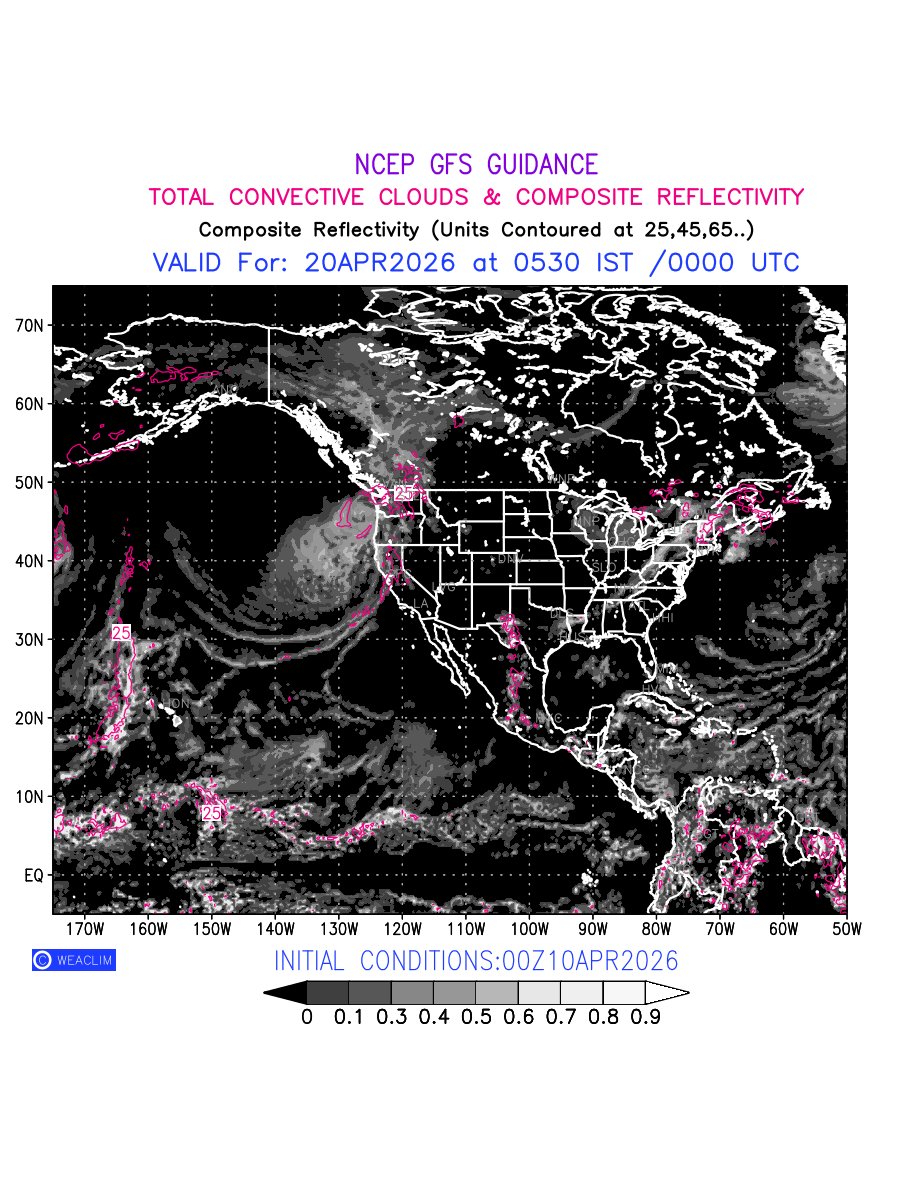 Convective clouds are formed by the vertical movement of air in the atmosphere and are associated with thunderstorms and other types of severe weather like intense rainfall, strong gusty winds etc. Shades from black to white on scale of 0 to 1 with whiter shade depicting more intensity of convection has been used in the depiction. Also shown is the Composite Reflectivity that takes the maximum reflectivity from each elevation angle of the Doppler Weather Radar and meshes it into one image.  Advantage of this type of image is the ability to quickly assess the intensity of storms. Predicted pattern of  Total Convective Clouds and percentage of the sky covered by them is shown here along with Composite Reflectivity over the North American Region for the next ten days.
