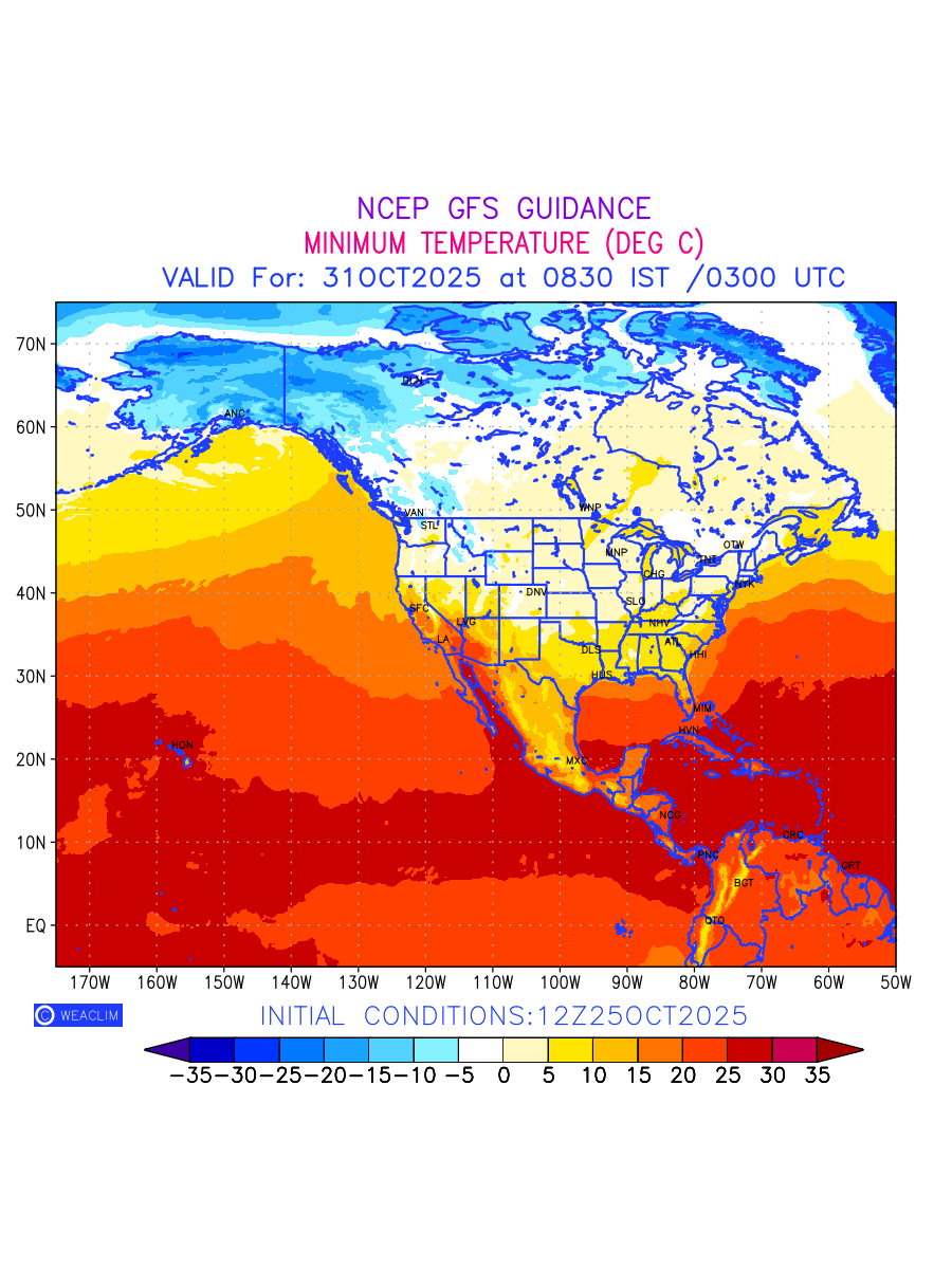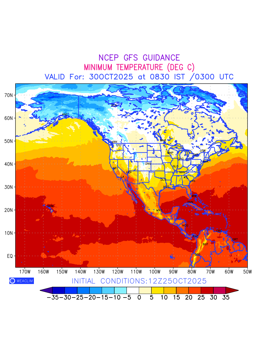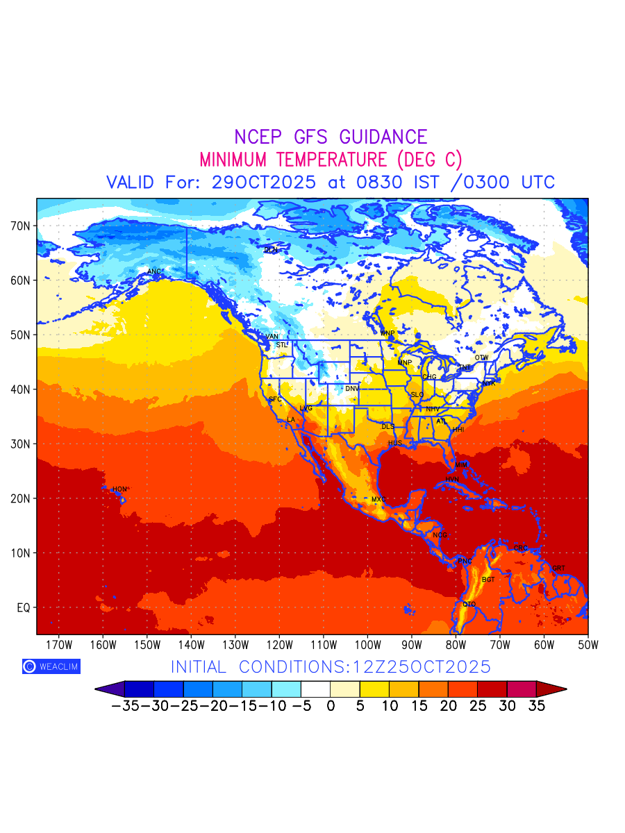Minimum Temperature for North America depicts the highest temperatures at 2m above the ground surface between 0300 UTC of the previous date to 0300 UTC of the required date. This is an important variable for weather forecasting, as it determines the conditions at the Earth’s surface during the coldest part of the date, affecting human activities, agriculture, and the environment. 2m Temperature data can be used for a variety of applications, such as predicting the onset of cold spells, forecasting temperature trends, and studying the impact of weather on various systems and processes.