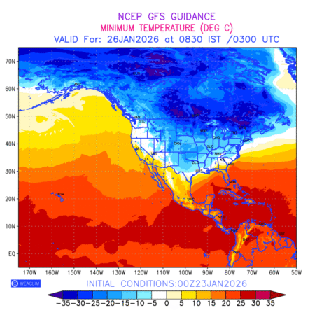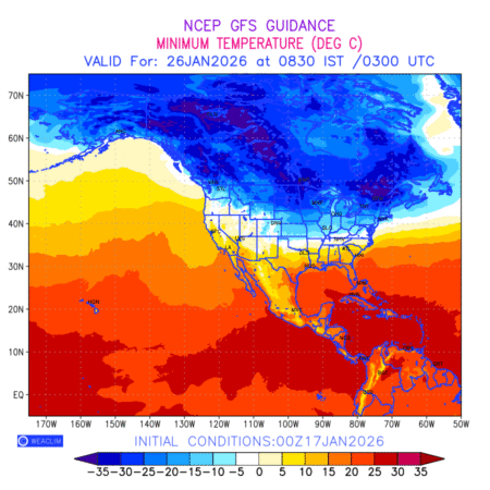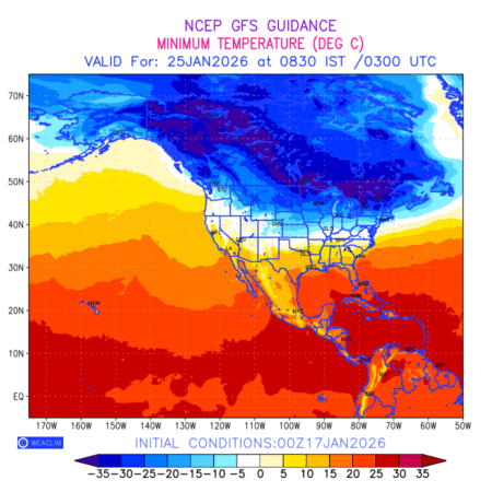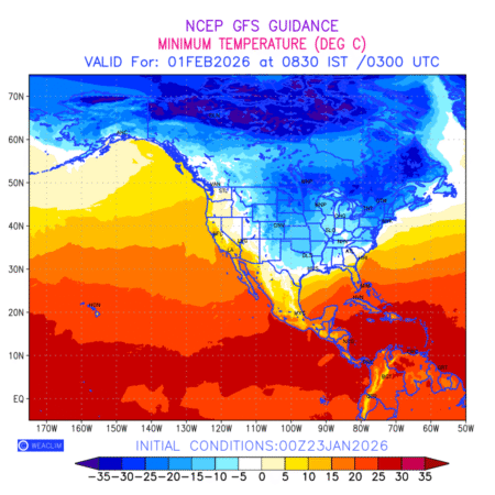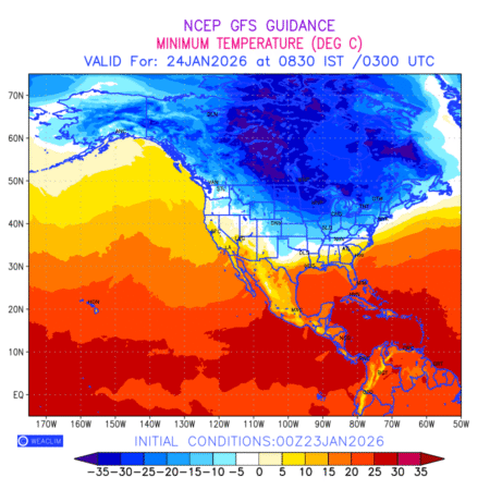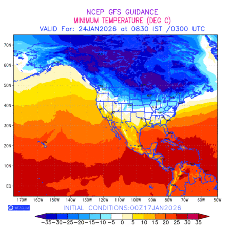 Minimum Temperature for North America depicts the highest temperatures at 2m above the ground surface between 0300 UTC of the previous date to 0300 UTC of the required date. This is an important variable for weather forecasting, as it determines the conditions at the Earth’s surface during the coldest part of the date, affecting human activities, agriculture, and the environment. 2m Temperature data can be used for a variety of applications, such as predicting the onset of cold spells, forecasting temperature trends, and studying the impact of weather on various systems and processes.
