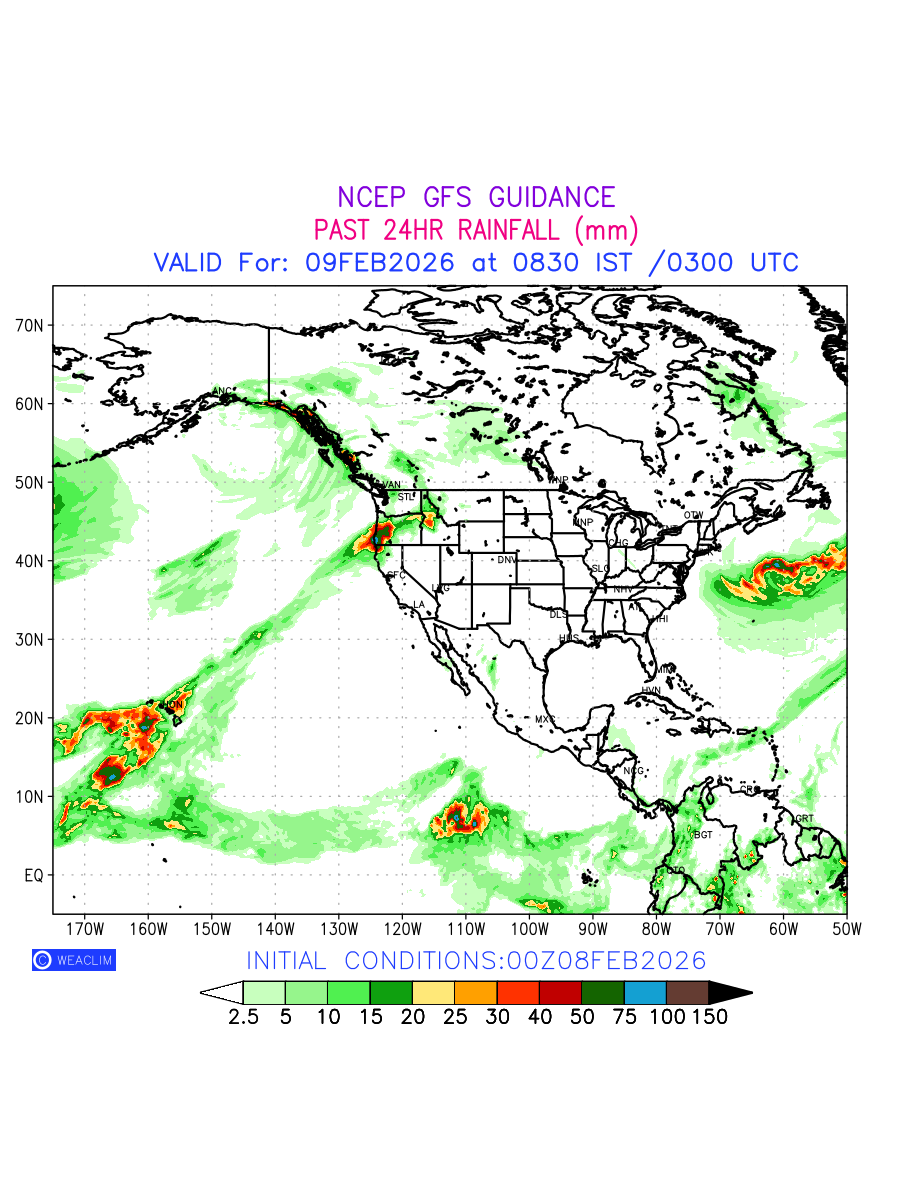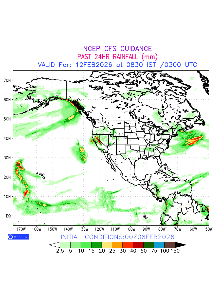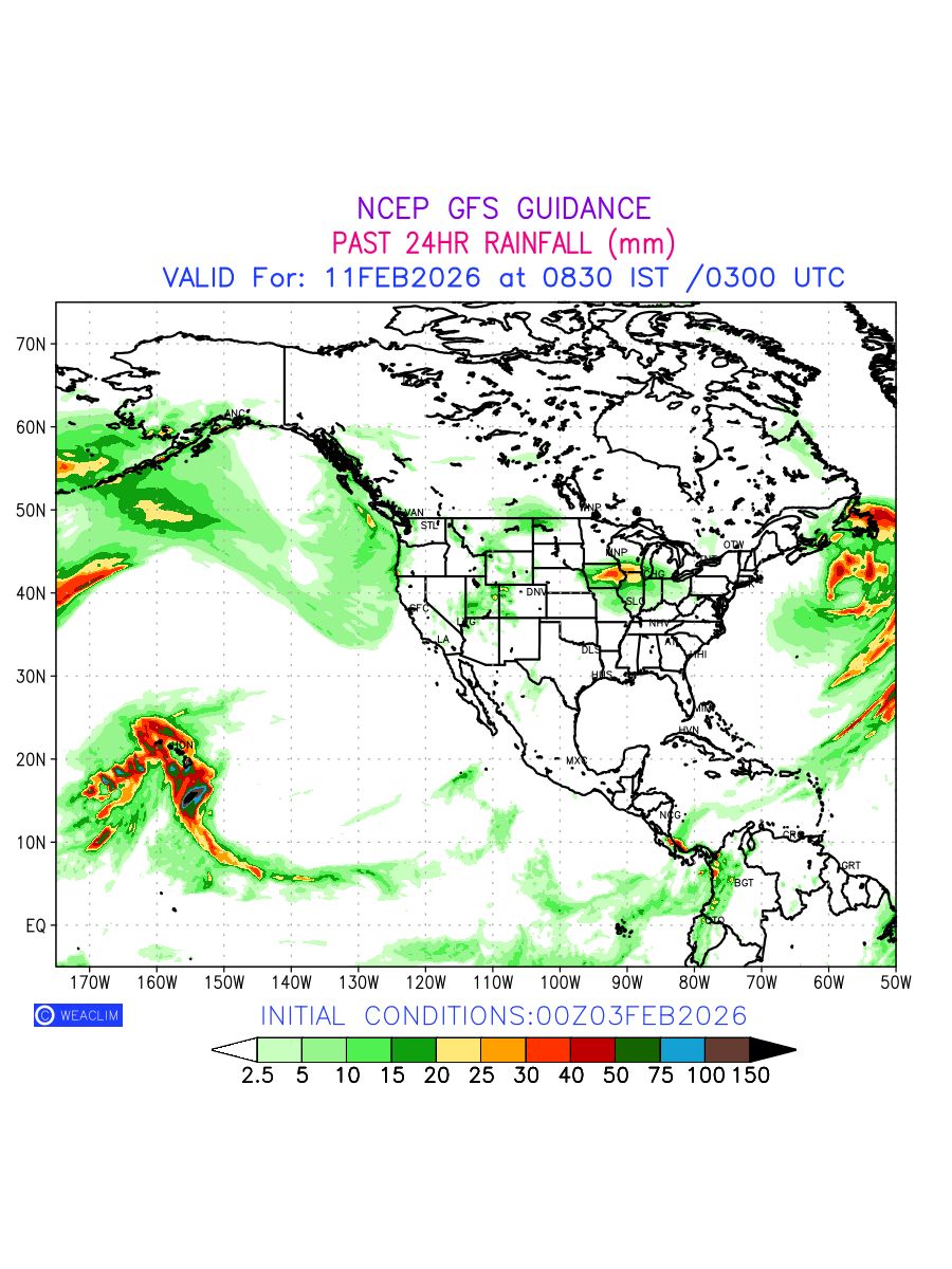 Rainfall forecast for 24 hours for North America is expected amount of precipitation in millimeters for a given area over a time period of 24 hours and valid from 0300 UTC (0830 IST) of the previous date to 0300 UTC of the required date. This prediction enables the users to plan/review their tasks that are affected by rainfall related severe weather events that may lead to flooding, drought, snowfall and avalanche etc.