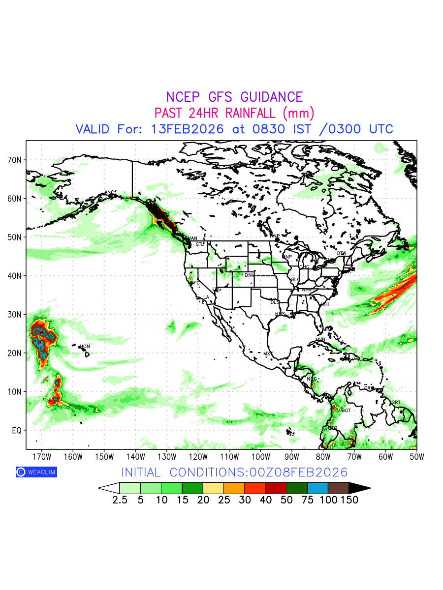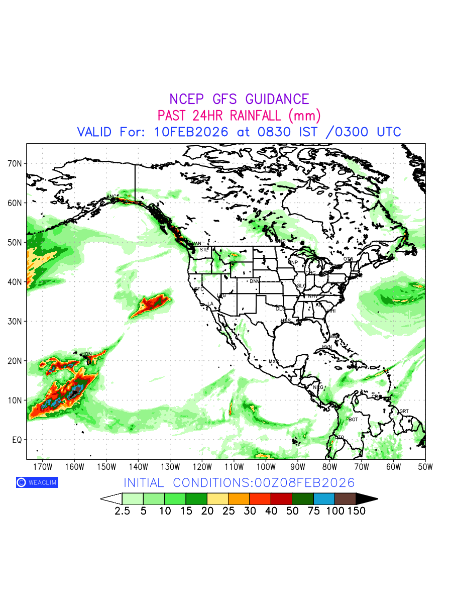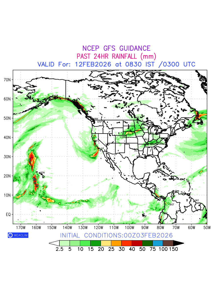 Rainfall forecast for 24 hours for North America is expected amount of precipitation in millimeters for a given area over a time period of 24 hours and valid from 0300 UTC (0830 IST) of the previous date to 0300 UTC of the required date. This prediction enables the users to plan/review their tasks that are affected by rainfall related severe weather events that may lead to flooding, drought, snowfall and avalanche etc.