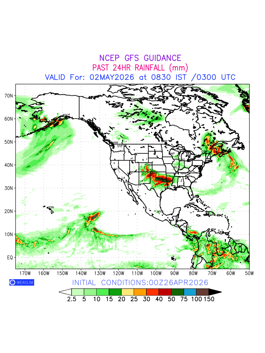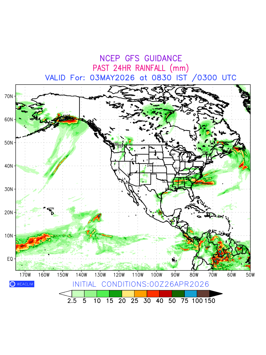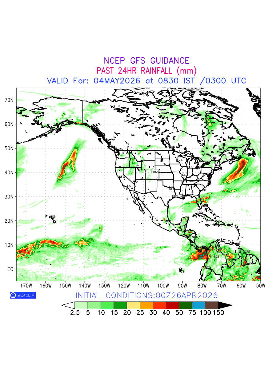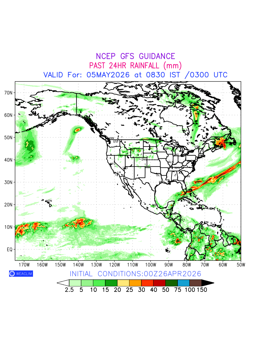 Rainfall forecast for 24 hours for North America is expected amount of precipitation in millimeters for a given area over a time period of 24 hours and valid from 0300 UTC (0830 IST) of the previous date to 0300 UTC of the required date. This prediction enables the users to plan/review their tasks that are affected by rainfall related severe weather events that may lead to flooding, drought, snowfall and avalanche etc.