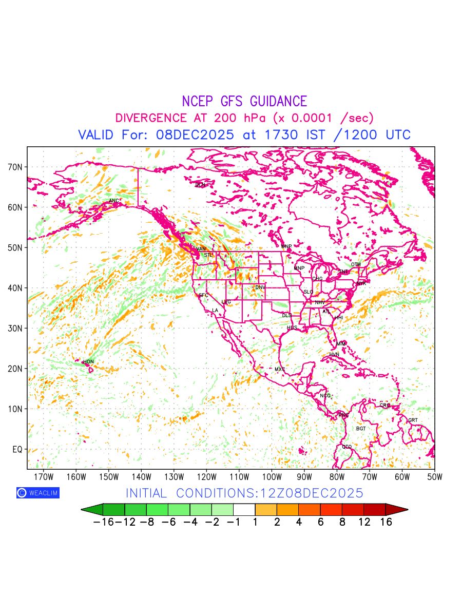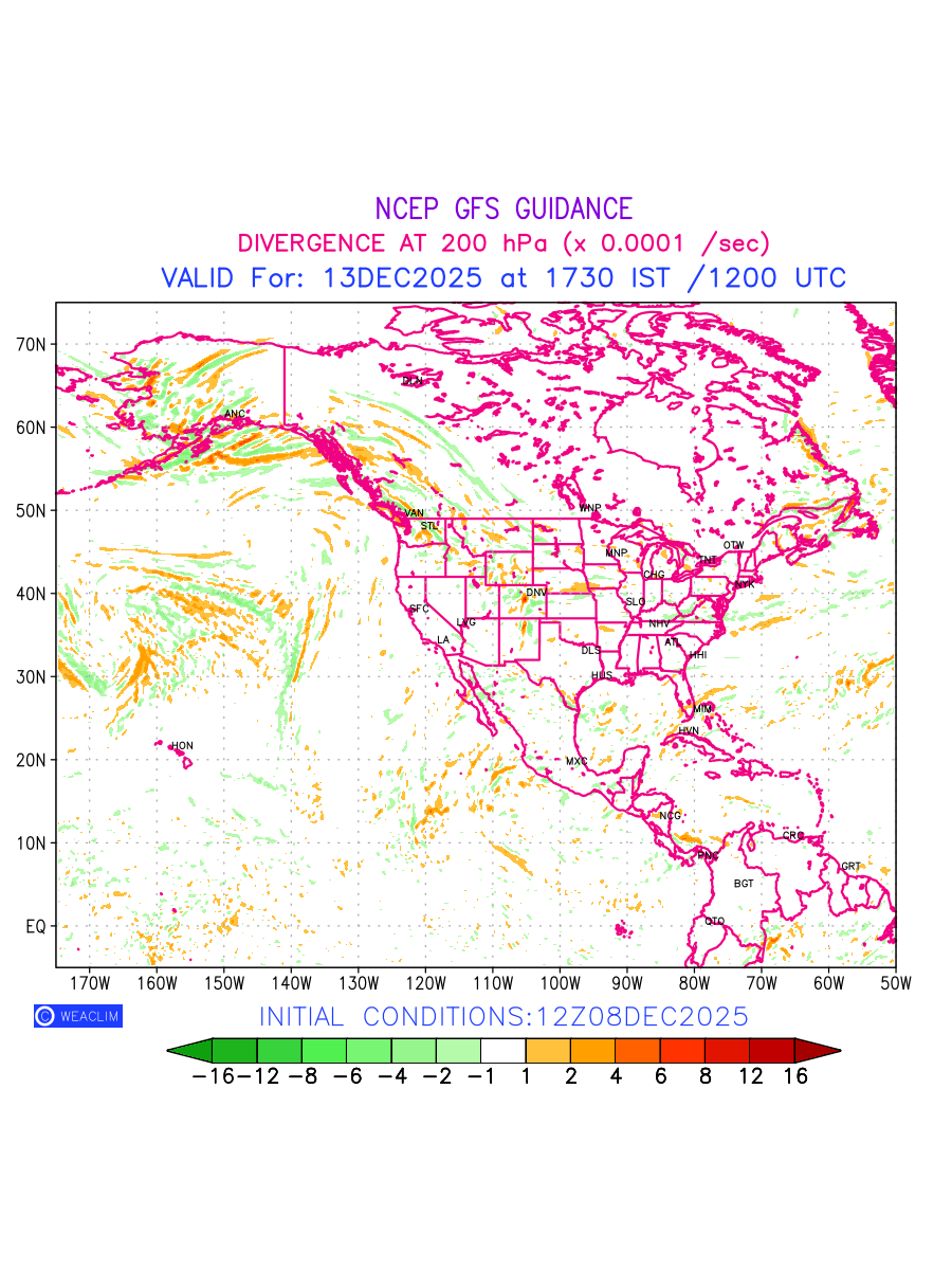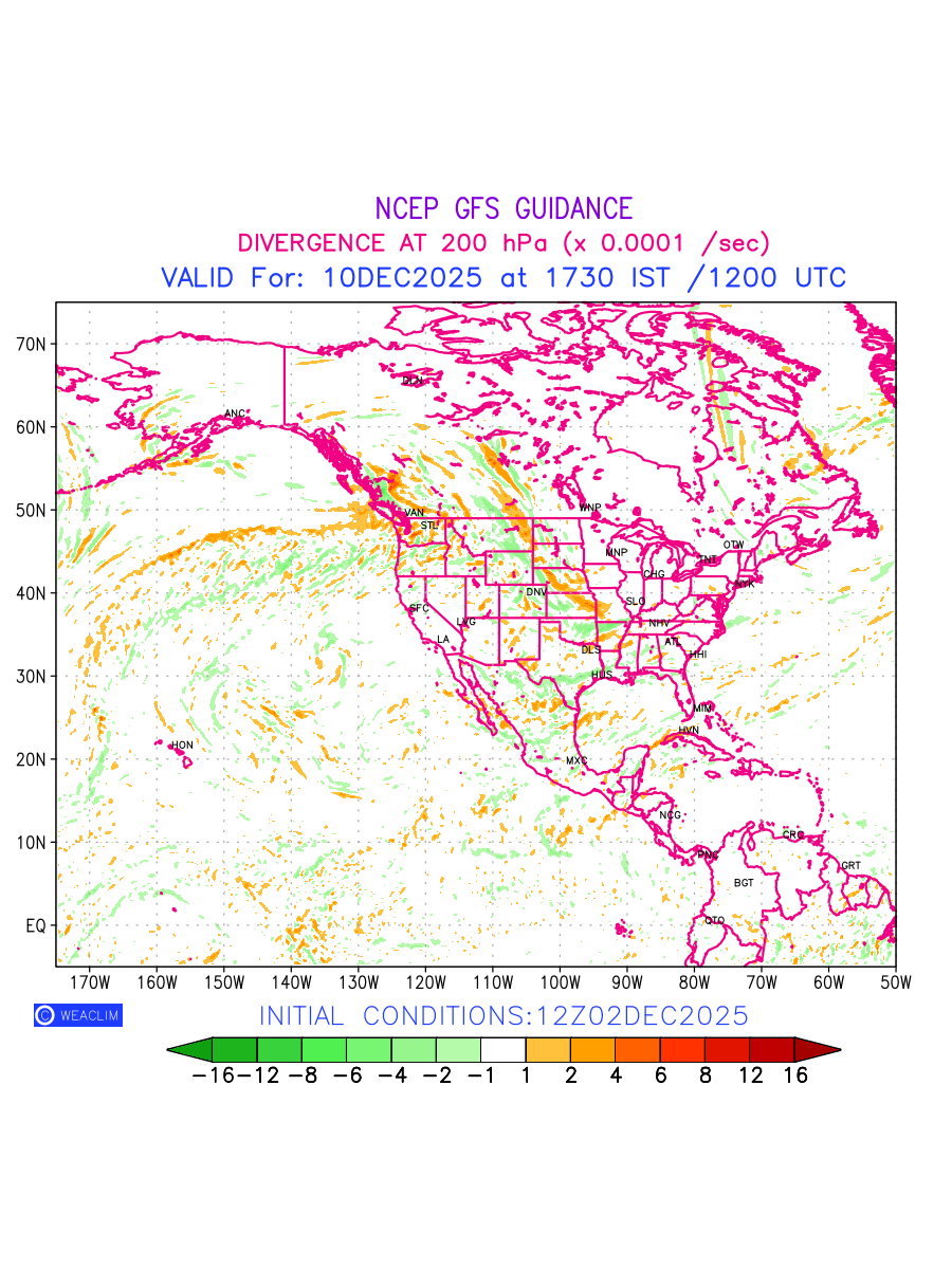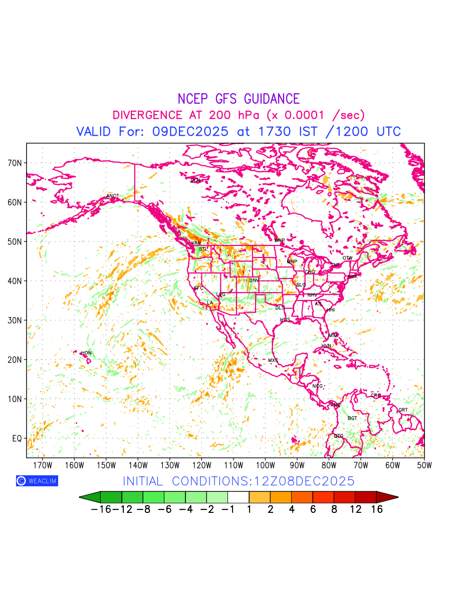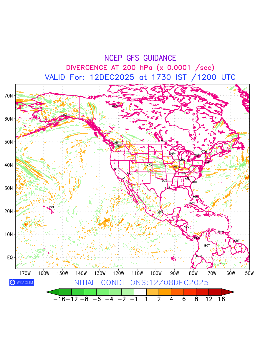 Upper Level Divergence at the 24th hour for North America is the graphical representation that depict the magnitude and pattern of horizontal rotation (or the vorticity) of atmosphere around a vertical axis or the vorticity at 200 hPa (12.0km). In northern hemisphere, it is displayed in warm colors such as red and yellow indicating positive vorticity (cyclonic rotation), and cool colors such as blue and green indicating negative vorticity(anticyclonic rotation). It can be associated with weather systems such as troughs, ridges, and jet streams.