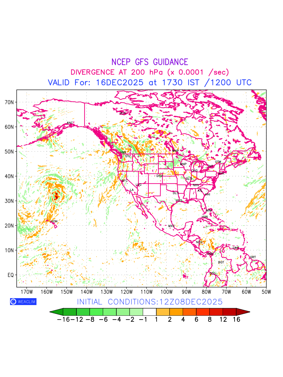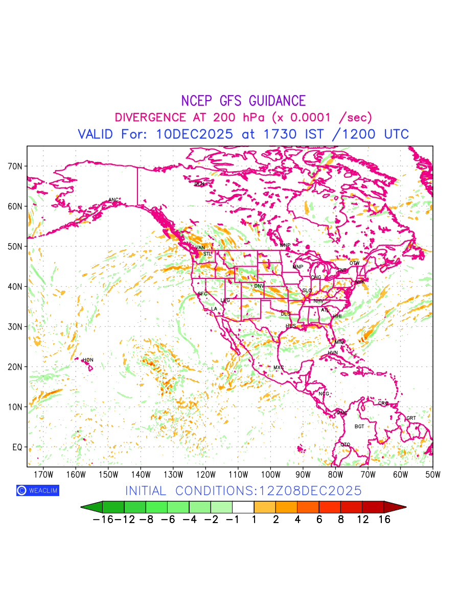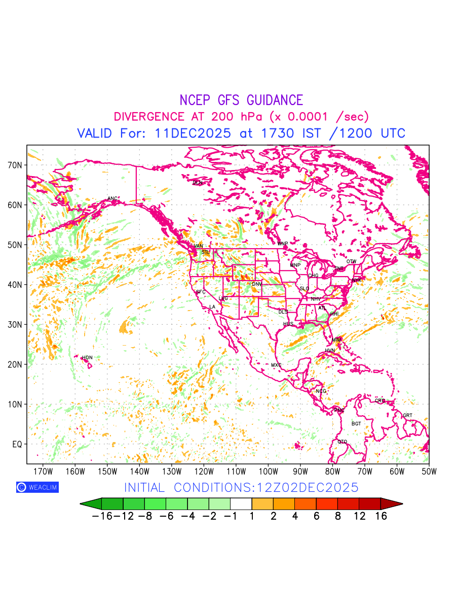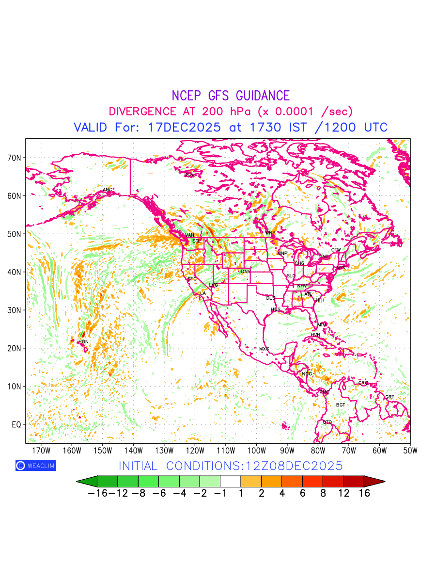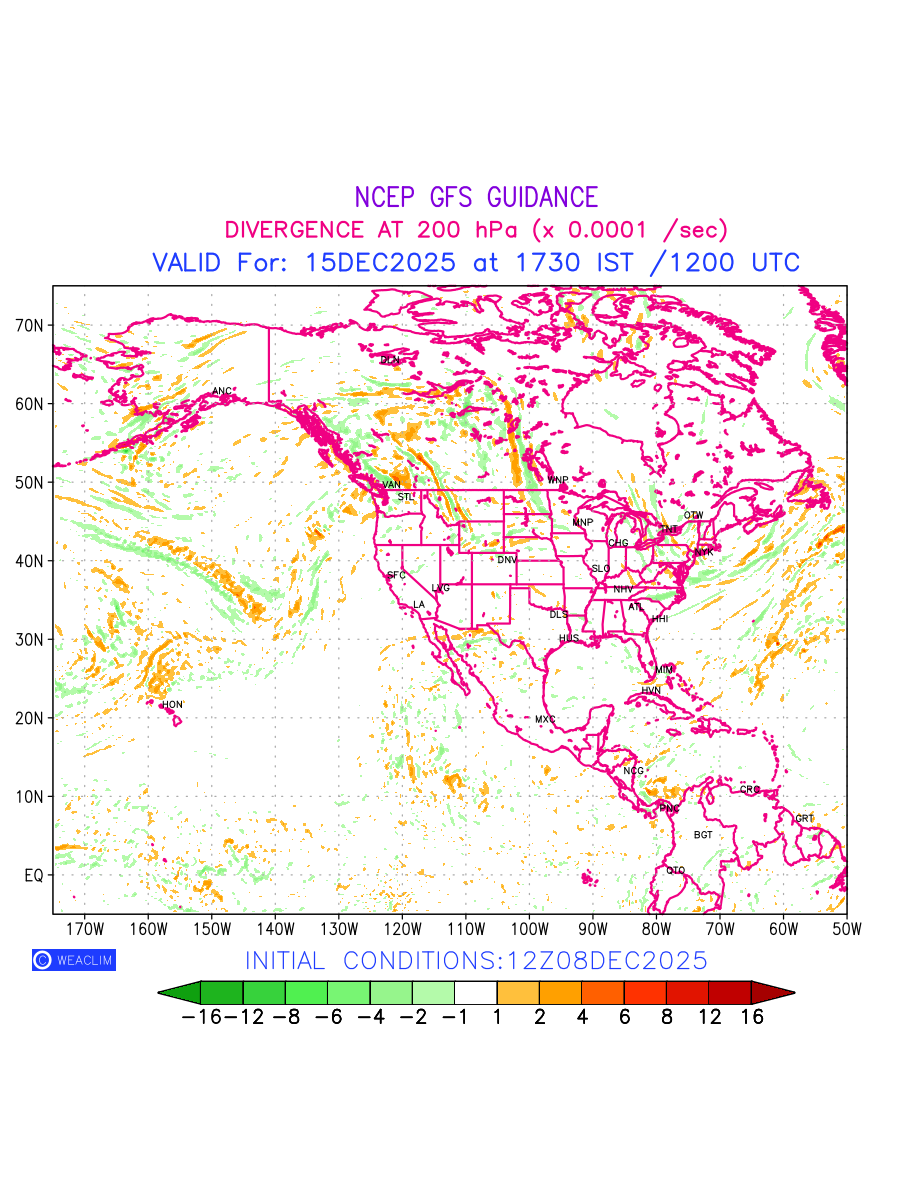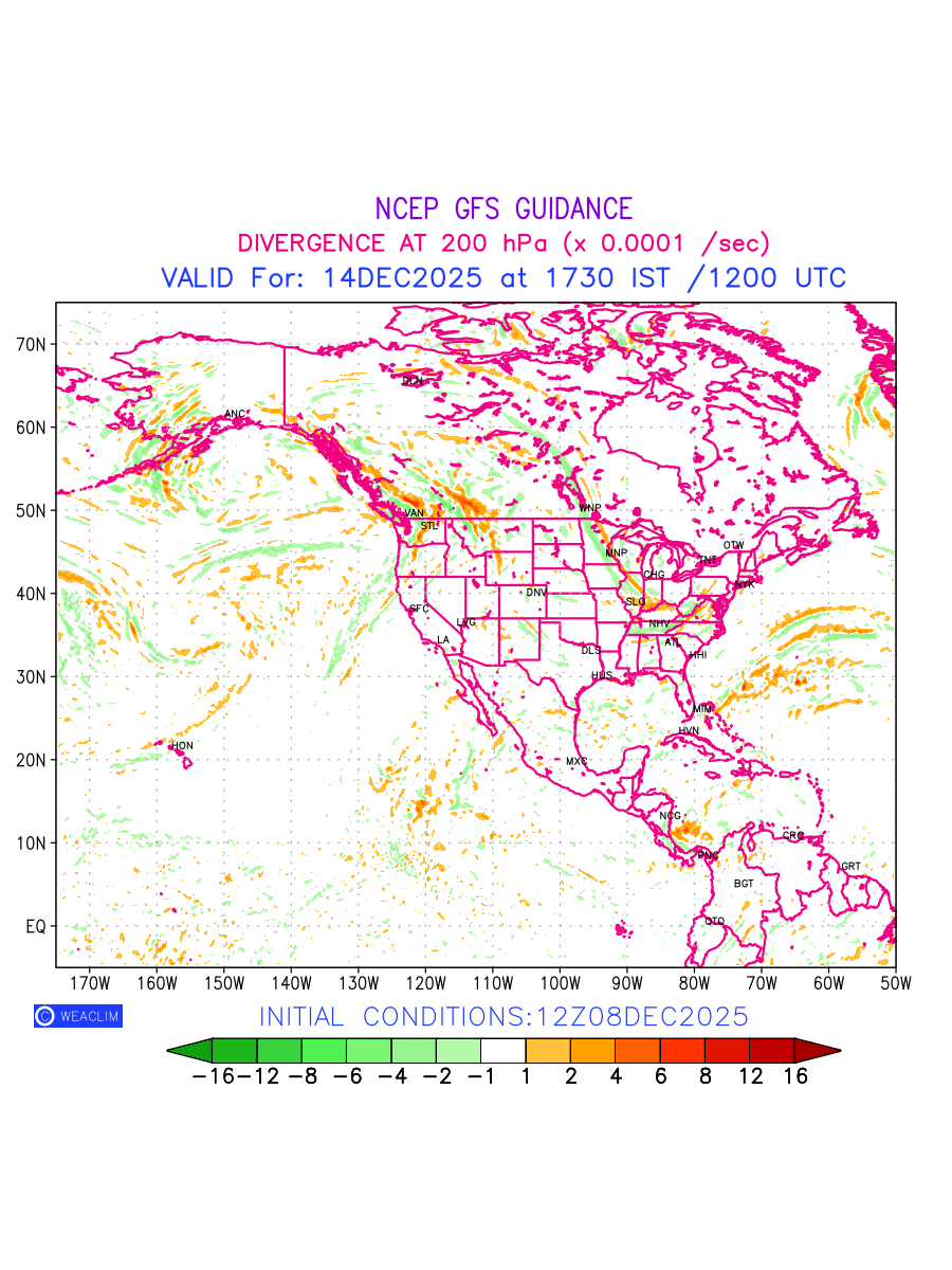 Upper Level Divergence at the 24th hour for North America is the graphical representation that depict the magnitude and pattern of horizontal rotation (or the vorticity) of atmosphere around a vertical axis or the vorticity at 200 hPa (12.0km). In northern hemisphere, it is displayed in warm colors such as red and yellow indicating positive vorticity (cyclonic rotation), and cool colors such as blue and green indicating negative vorticity(anticyclonic rotation). It can be associated with weather systems such as troughs, ridges, and jet streams.