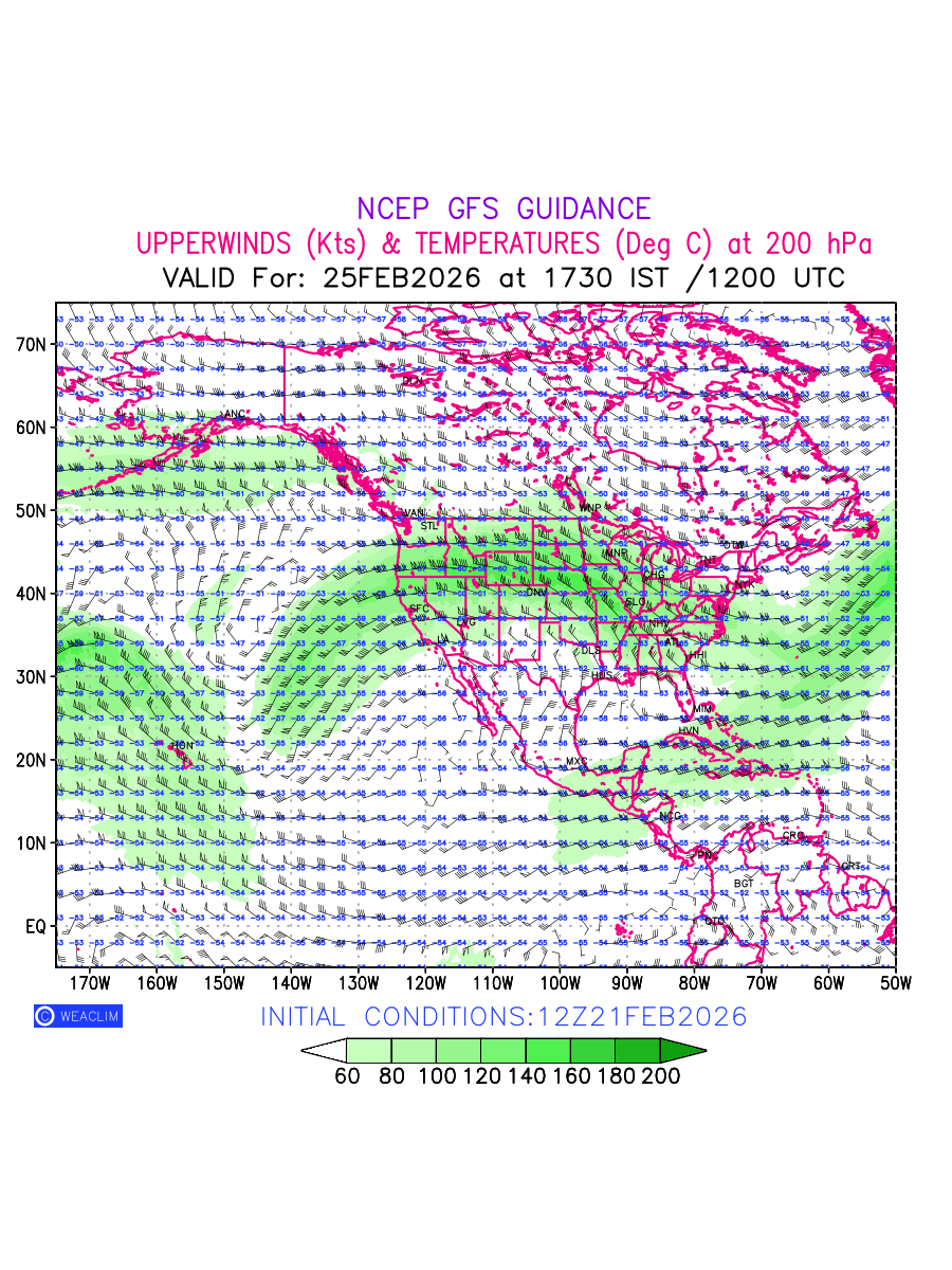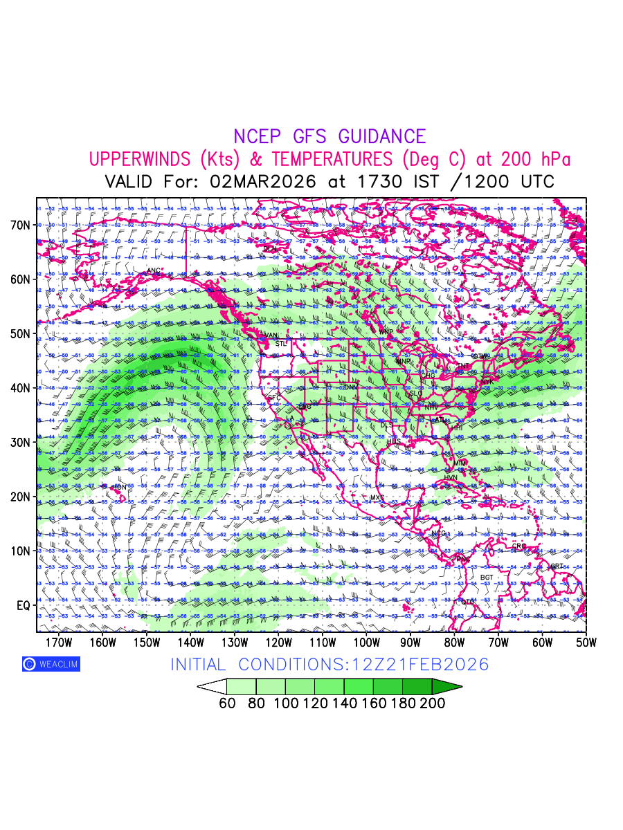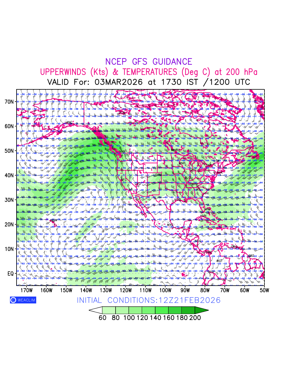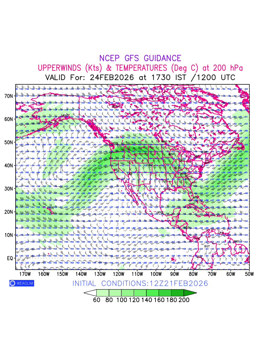 Winds at 200 hPa at the 24th hour for North America refers to the predicted wind direction and speed at a pressure level of 200 hPa, which is located in the upper troposphere (approximately 12 Km or 7.5 Miles above the Earths surface). The winds are presented knots (kt), and the direction is given in degrees from true north. ‘JetStreams’ are marked in shades of green for winds with magnitude of more than 60 kt is a narrow band of high-speed winds that can influence weather patterns over large areas. Along with the wind speed (kt) and direction , upper air temperatures (Deg C) are also shown at the grid points over the North American Region at 200 hPa level for the next ten days.