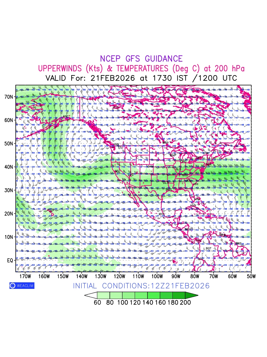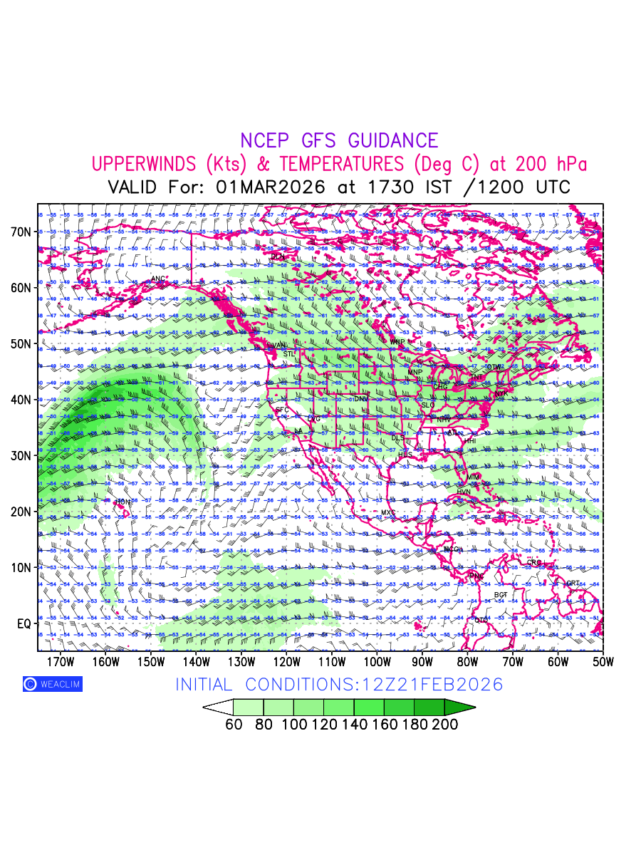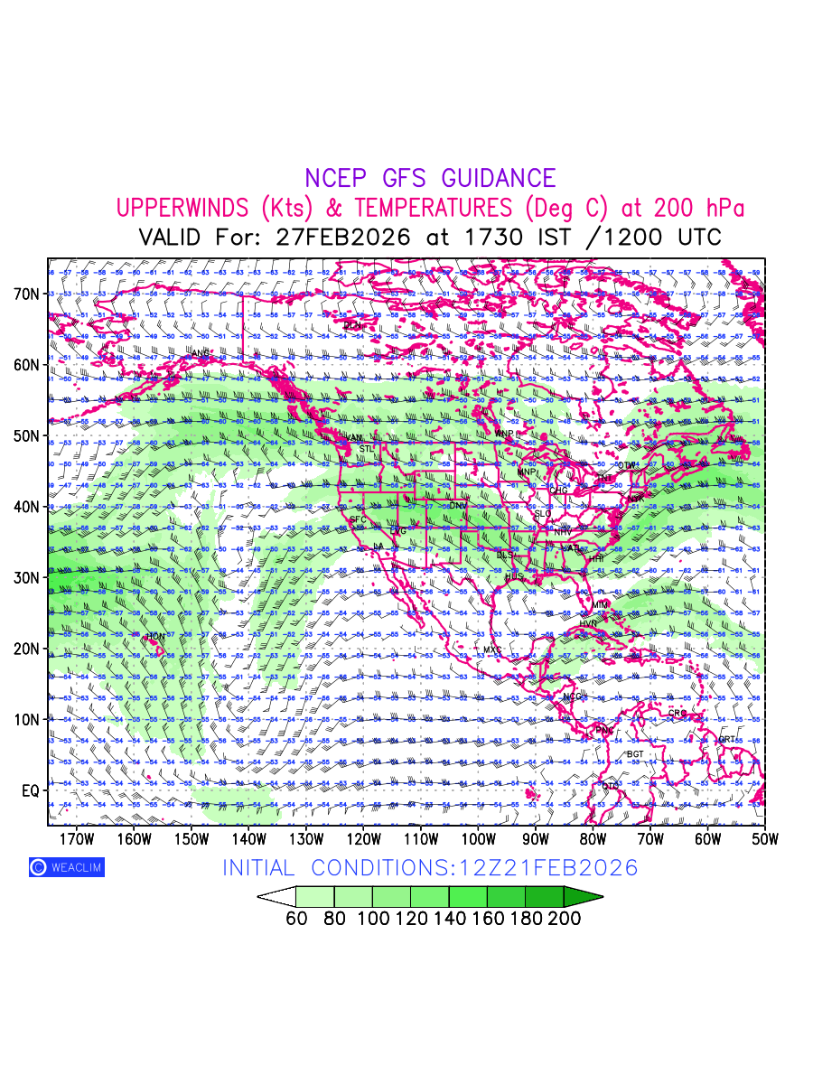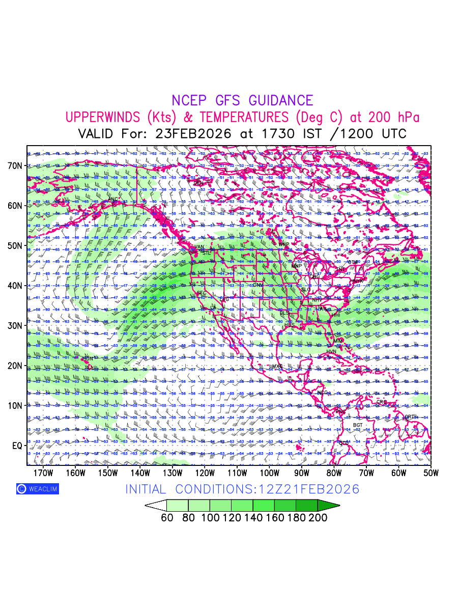 Winds at 200 hPa at the 24th hour for North America refers to the predicted wind direction and speed at a pressure level of 200 hPa, which is located in the upper troposphere (approximately 12 Km or 7.5 Miles above the Earths surface). The winds are presented knots (kt), and the direction is given in degrees from true north. ‘JetStreams’ are marked in shades of green for winds with magnitude of more than 60 kt is a narrow band of high-speed winds that can influence weather patterns over large areas. Along with the wind speed (kt) and direction , upper air temperatures (Deg C) are also shown at the grid points over the North American Region at 200 hPa level for the next ten days.