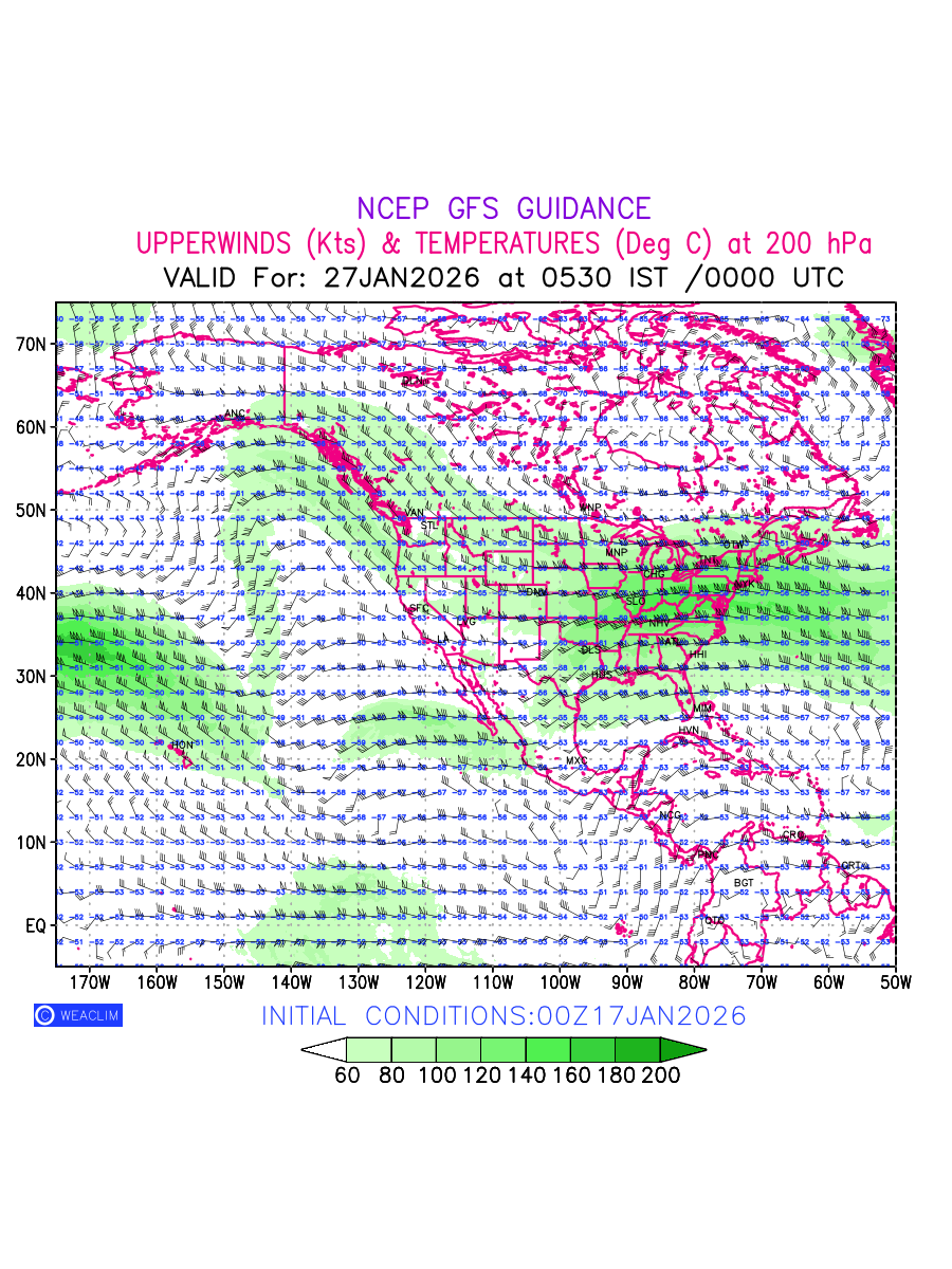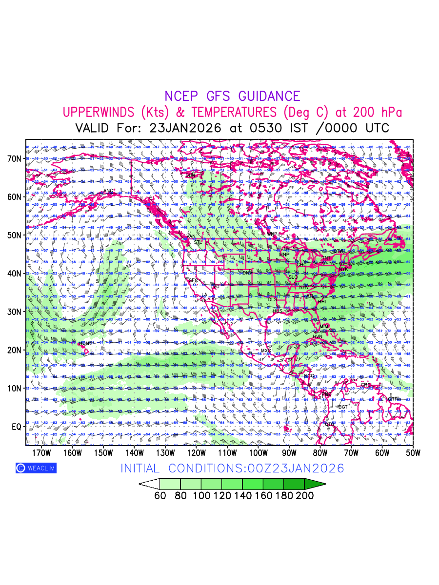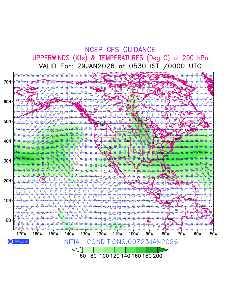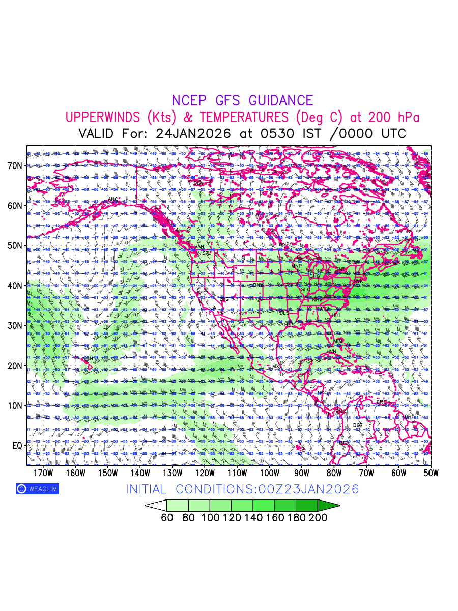 Winds at 200 hPa at the 24th hour for North America refers to the predicted wind direction and speed at a pressure level of 200 hPa, which is located in the upper troposphere (approximately 12 Km or 7.5 Miles above the Earths surface). The winds are presented knots (kt), and the direction is given in degrees from true north. ‘JetStreams’ are marked in shades of green for winds with magnitude of more than 60 kt is a narrow band of high-speed winds that can influence weather patterns over large areas. Along with the wind speed (kt) and direction , upper air temperatures (Deg C) are also shown at the grid points over the North American Region at 200 hPa level for the next ten days.