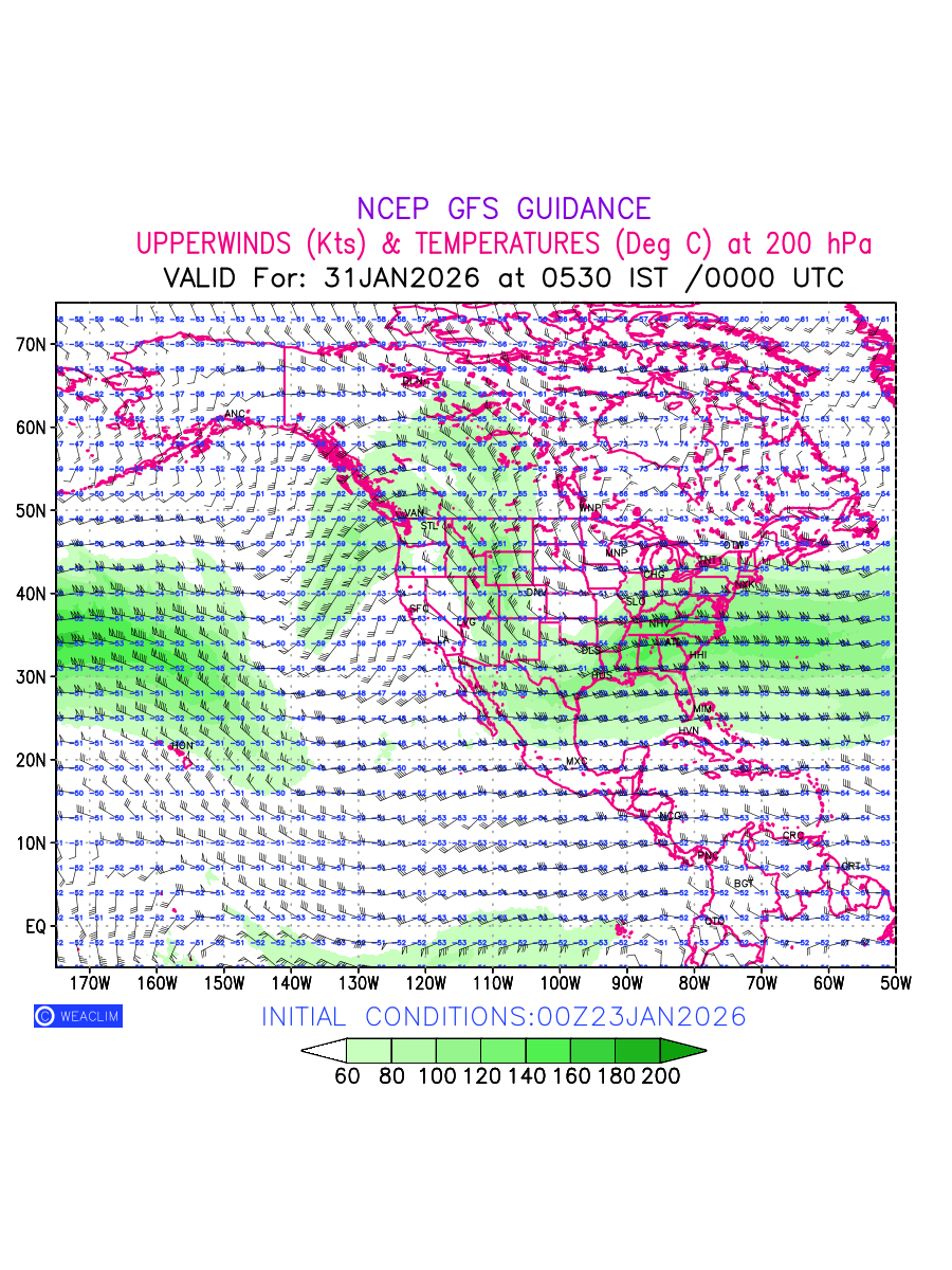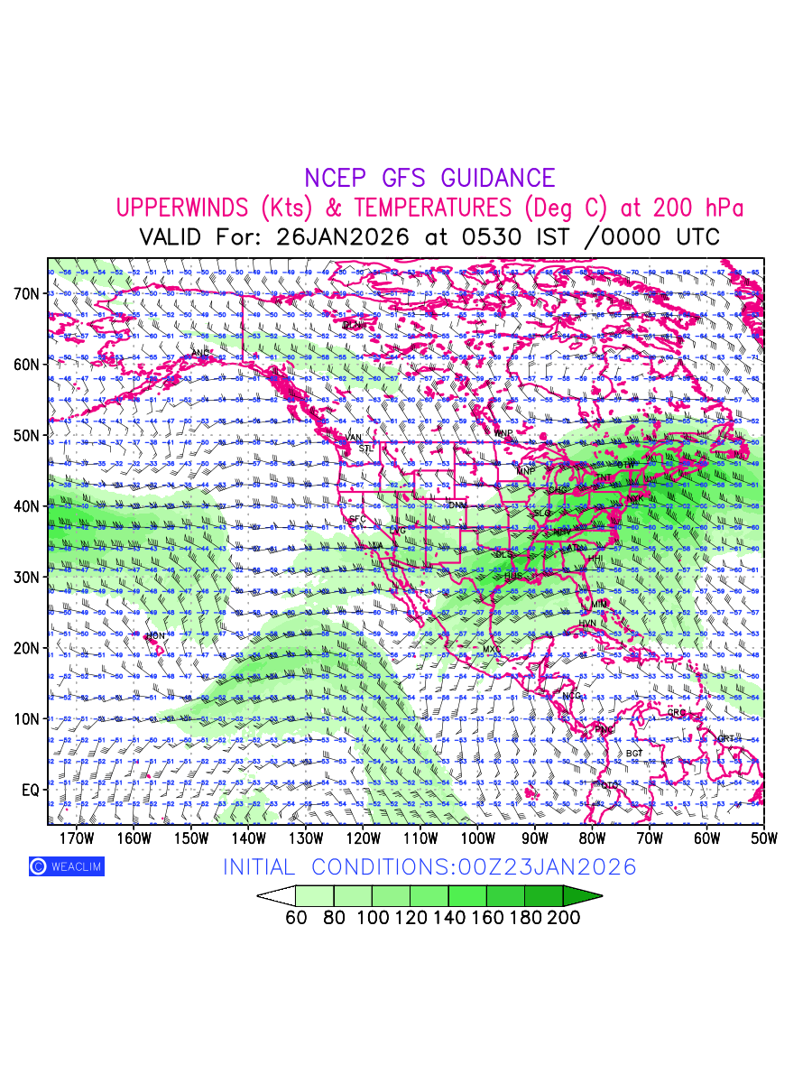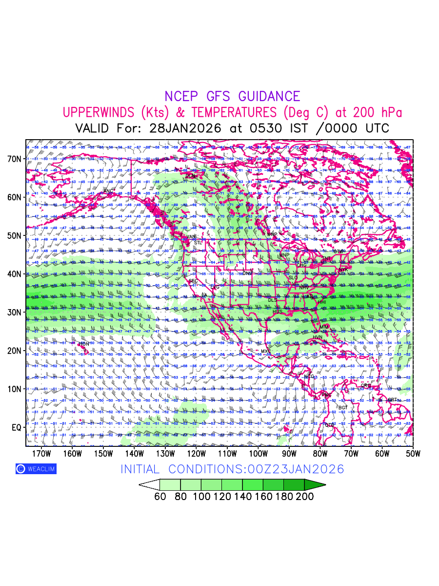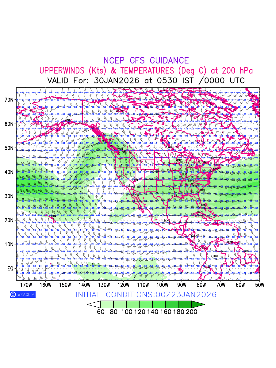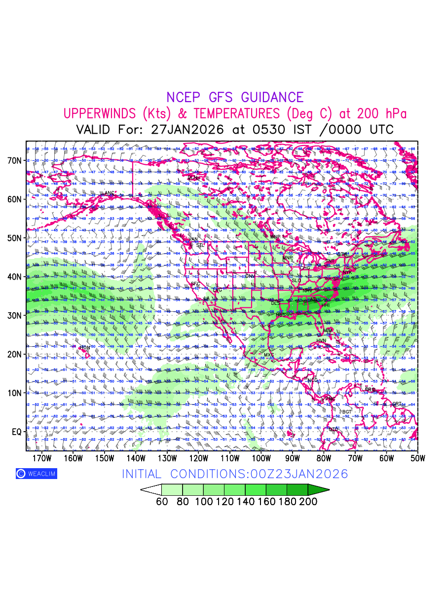 Winds at 200 hPa at the 24th hour for North America refers to the predicted wind direction and speed at a pressure level of 200 hPa, which is located in the upper troposphere (approximately 12 Km or 7.5 Miles above the Earths surface). The winds are presented knots (kt), and the direction is given in degrees from true north. ‘JetStreams’ are marked in shades of green for winds with magnitude of more than 60 kt is a narrow band of high-speed winds that can influence weather patterns over large areas. Along with the wind speed (kt) and direction , upper air temperatures (Deg C) are also shown at the grid points over the North American Region at 200 hPa level for the next ten days.