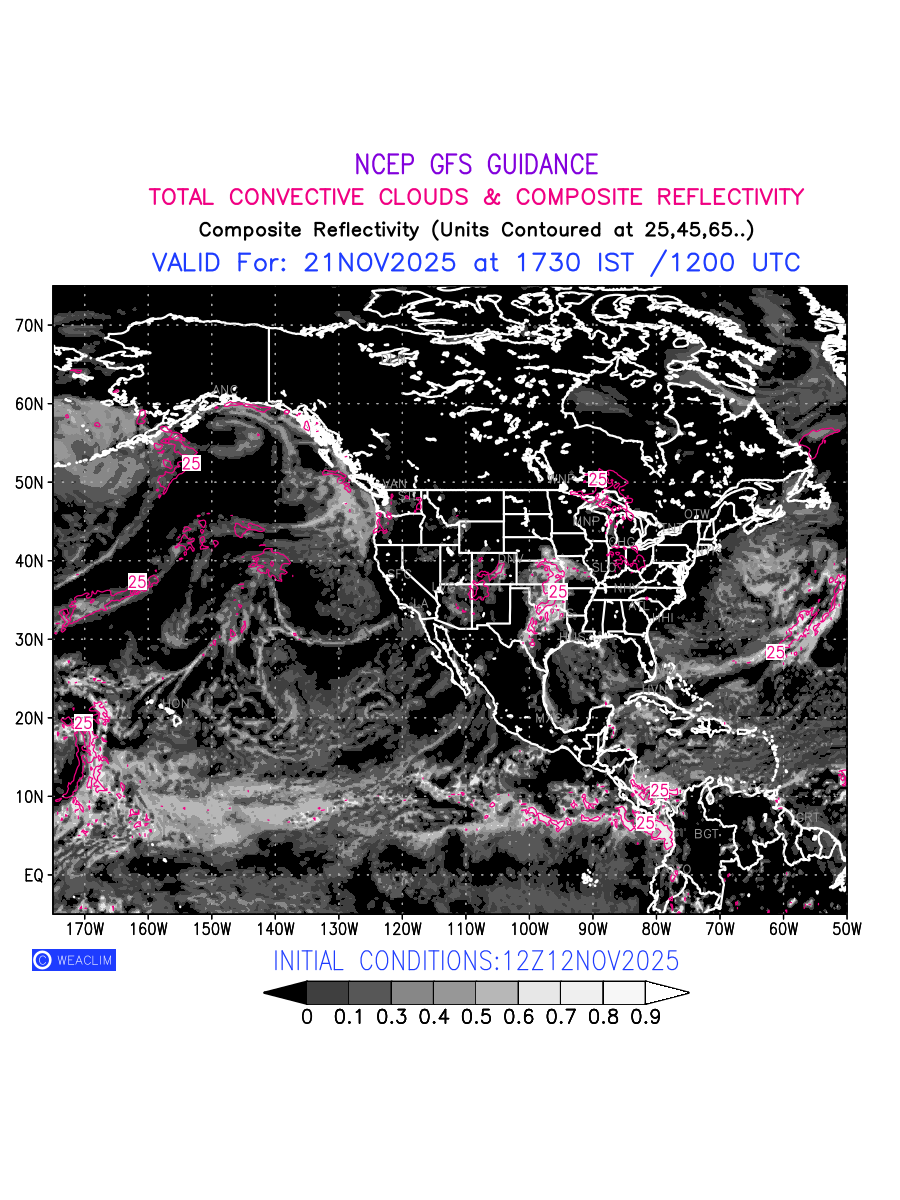 Convective clouds are formed by the vertical movement of air in the atmosphere and are associated with thunderstorms and other types of severe weather like intense rainfall, strong gusty winds etc. Shades from black to white on scale of 0 to 1 with whiter shade depicting more intensity of convection has been used in the depiction. Also shown is the Composite Reflectivity that takes the maximum reflectivity from each elevation angle of the Doppler Weather Radar and meshes it into one image. Advantage of this type of image is the ability to quickly assess the intensity of storms. Predicted pattern of Total Convective Clouds and percentage of the sky covered by them is shown here along with Composite Reflectivity over the North American Region for the next ten days.