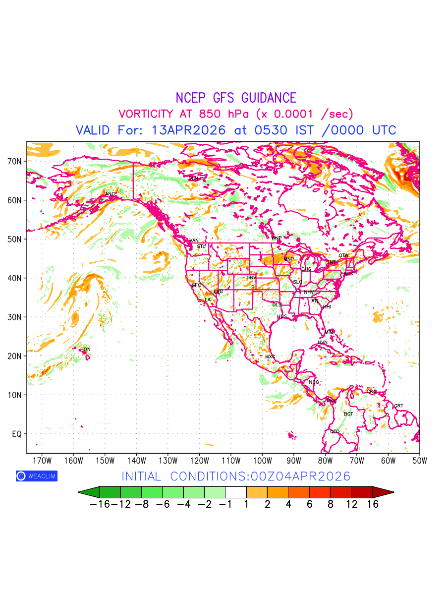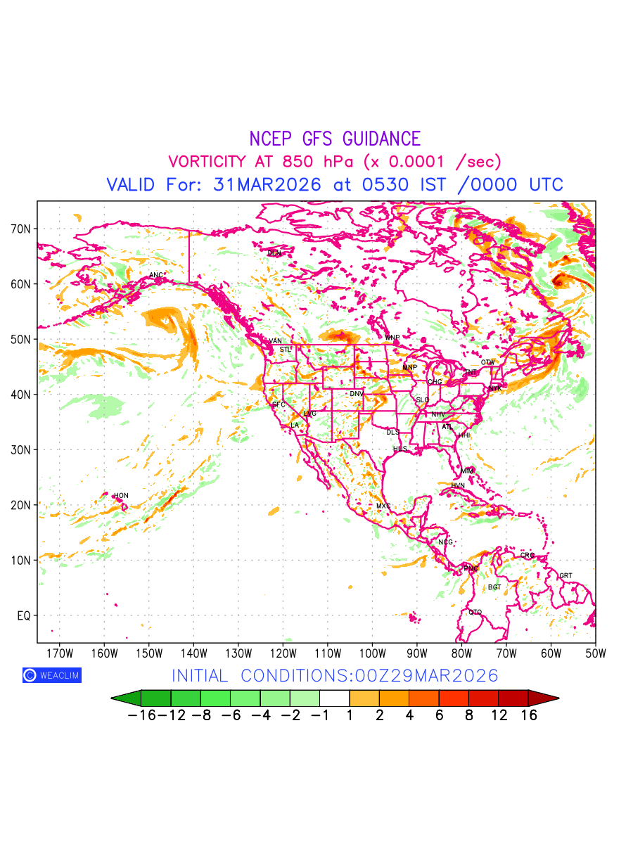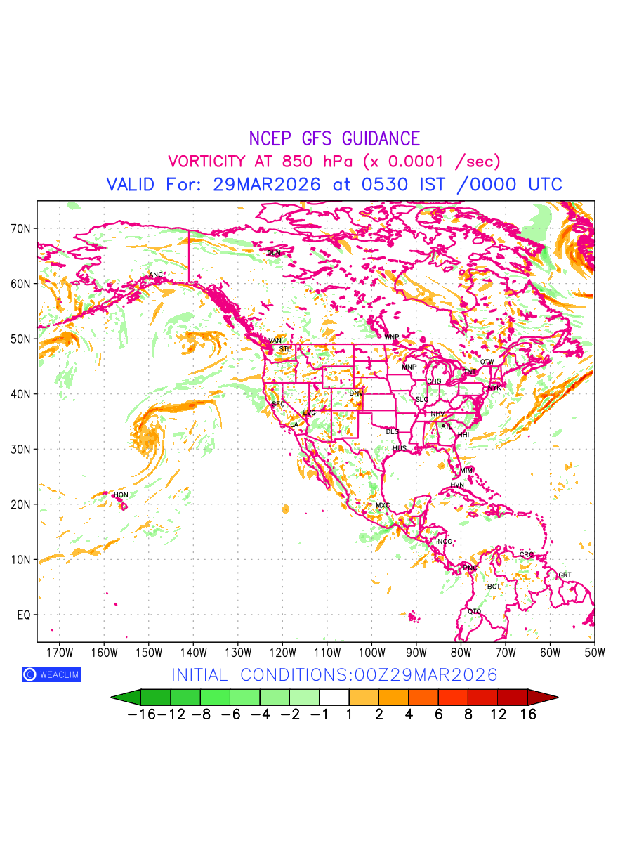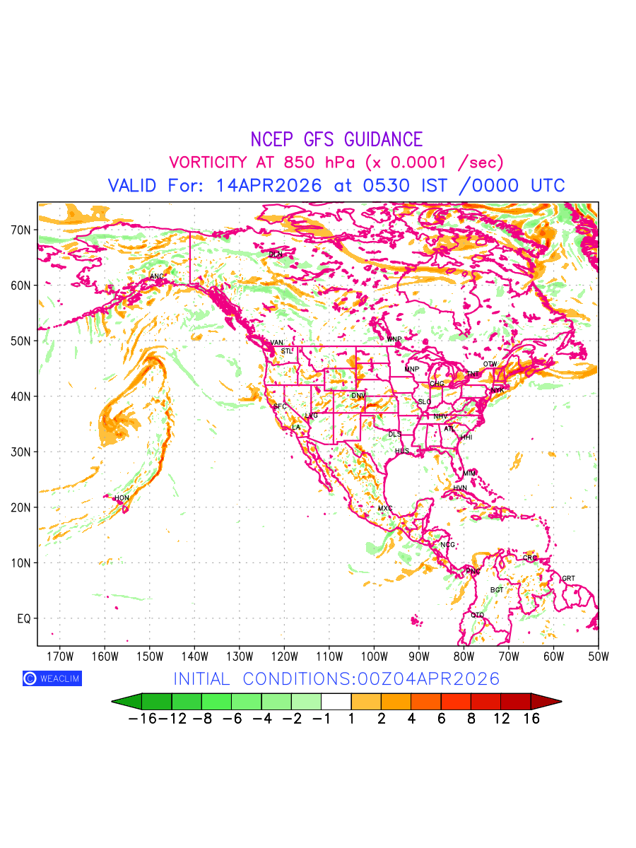Low Level Convergence at the 24th hour for North America is the graphical representation of the expected magnitude and pattern of horizontal rotation (or the vorticity) of atmosphere around a vertical axis or the vorticity at 850hPa (1.5km). In northern hemisphere it is typically displayed with warm colors ranging from shades of red (to yellow) indicating positive vorticity (cyclonic rotation), and cool colors shades of green (to blue) indicating negative vorticity (anticyclonic rotation). They are useful tools for identifying areas of high and low vorticity, associated with weather systems such as fronts, lows, and highs etc.