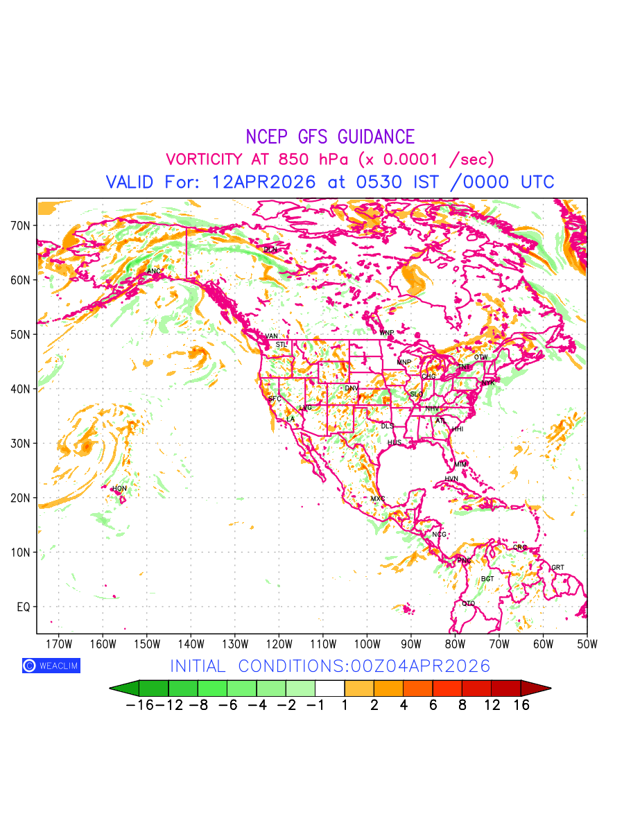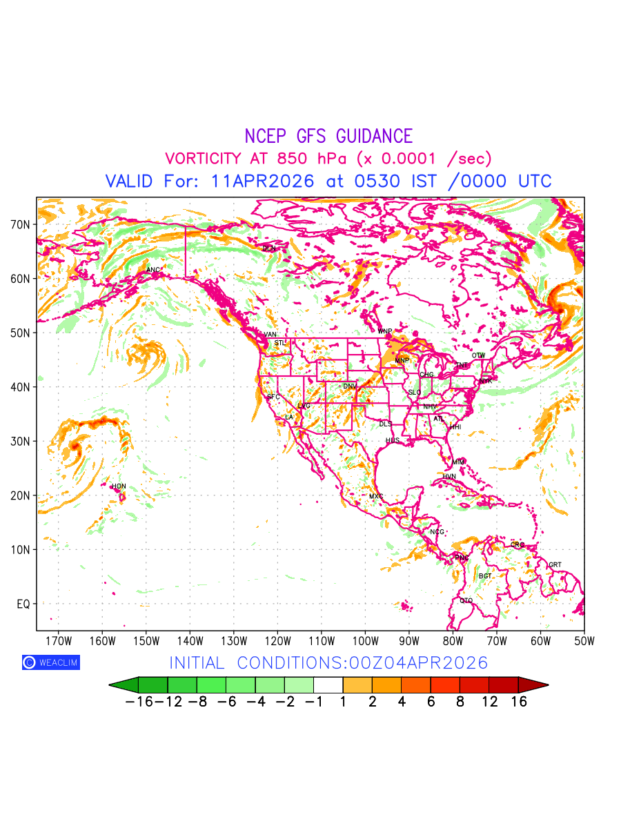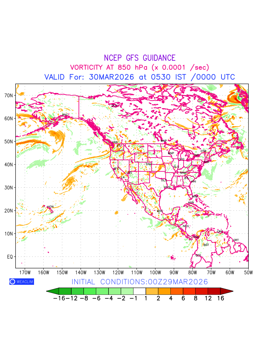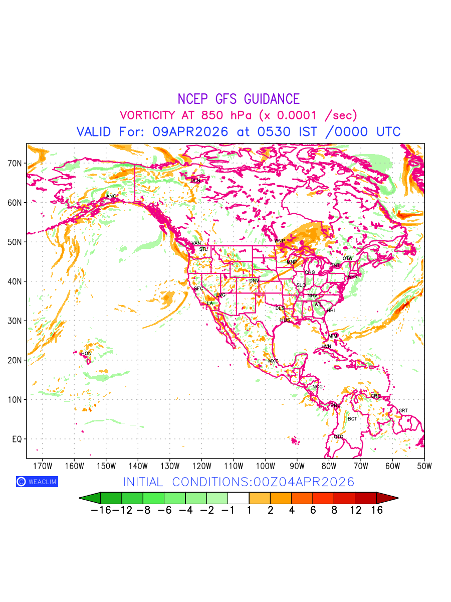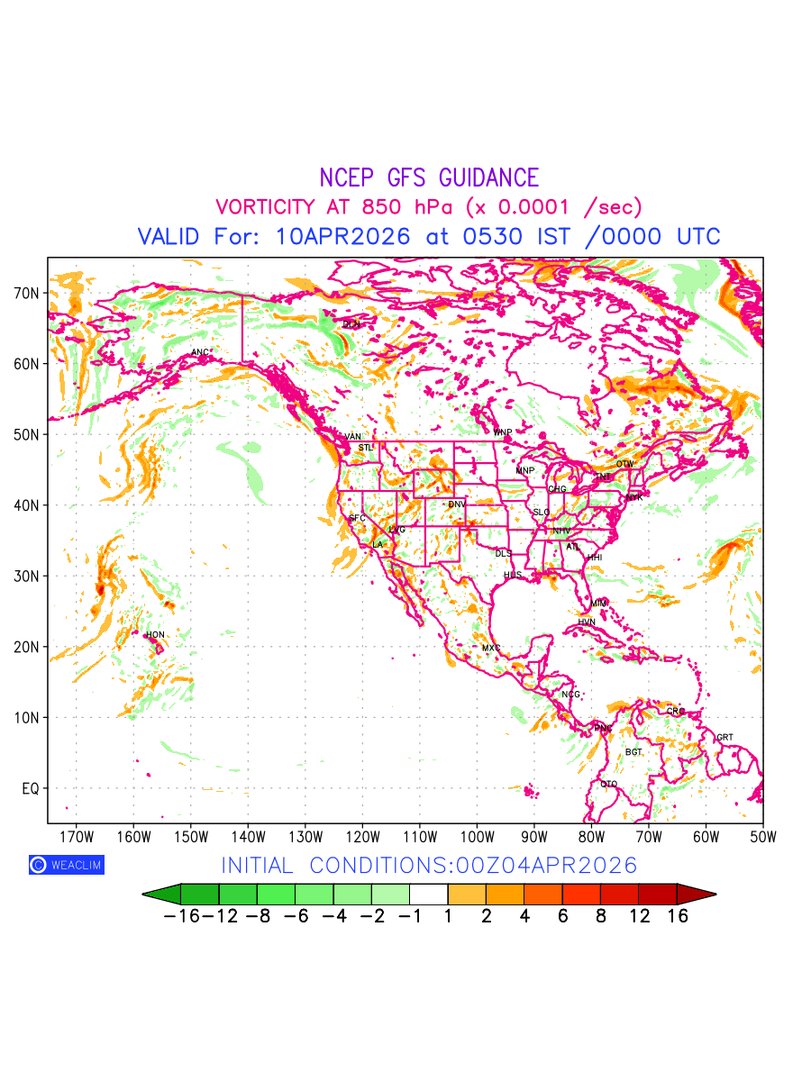 Low Level Convergence at the 24th hour for North America is the graphical representation of the expected magnitude and pattern of horizontal rotation (or the vorticity) of atmosphere around a vertical axis or the vorticity at 850hPa (1.5km). In northern hemisphere it is typically displayed with warm colors ranging from shades of red (to yellow) indicating positive vorticity (cyclonic rotation), and cool colors shades of green (to blue) indicating negative vorticity (anticyclonic rotation). They are useful tools for identifying areas of high and low vorticity, associated with weather systems such as fronts, lows, and highs etc.