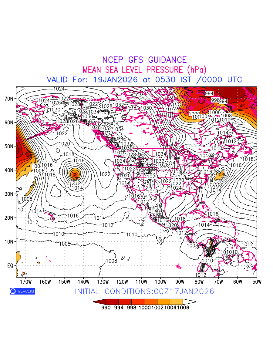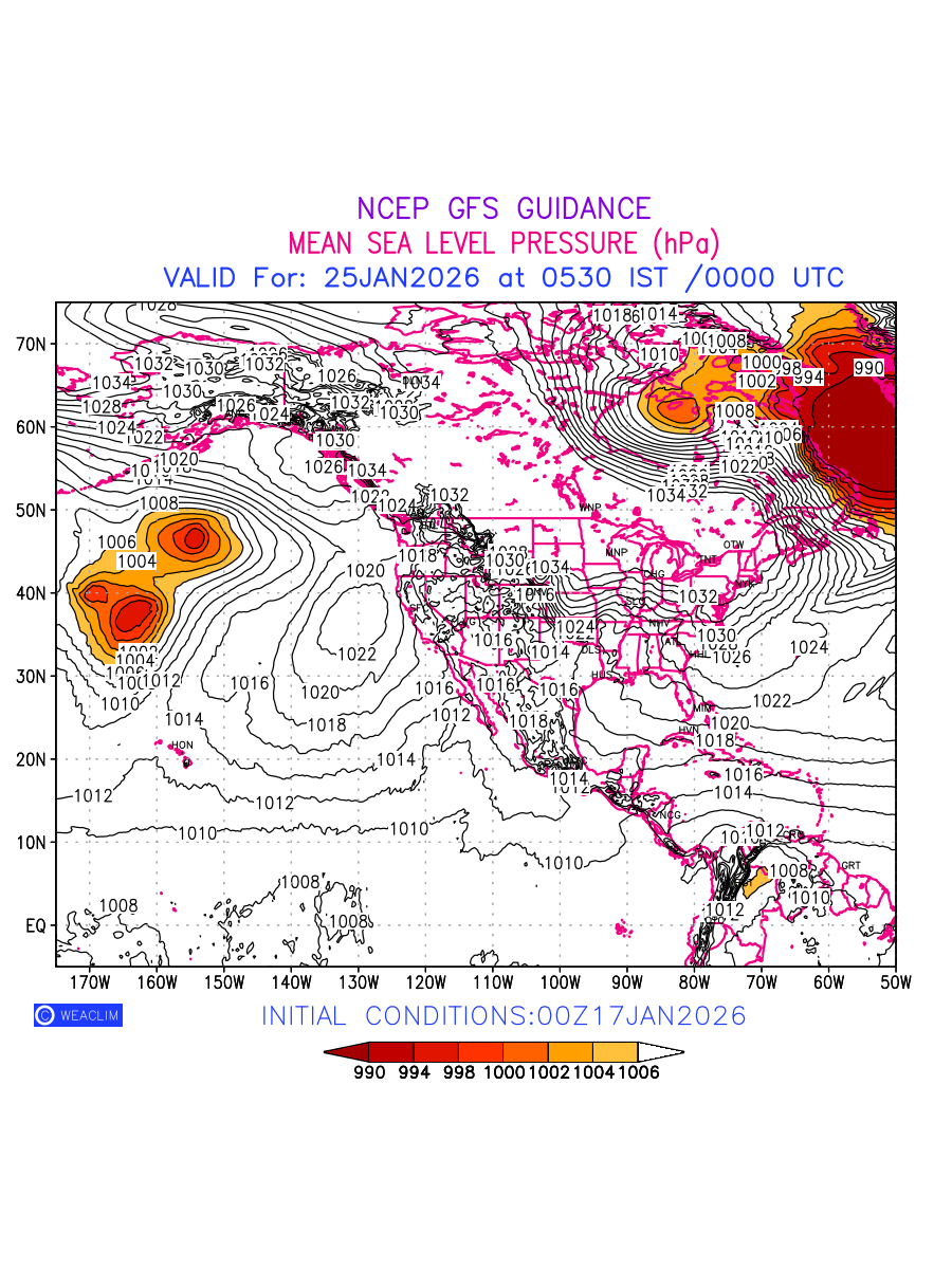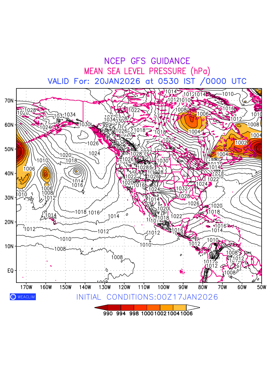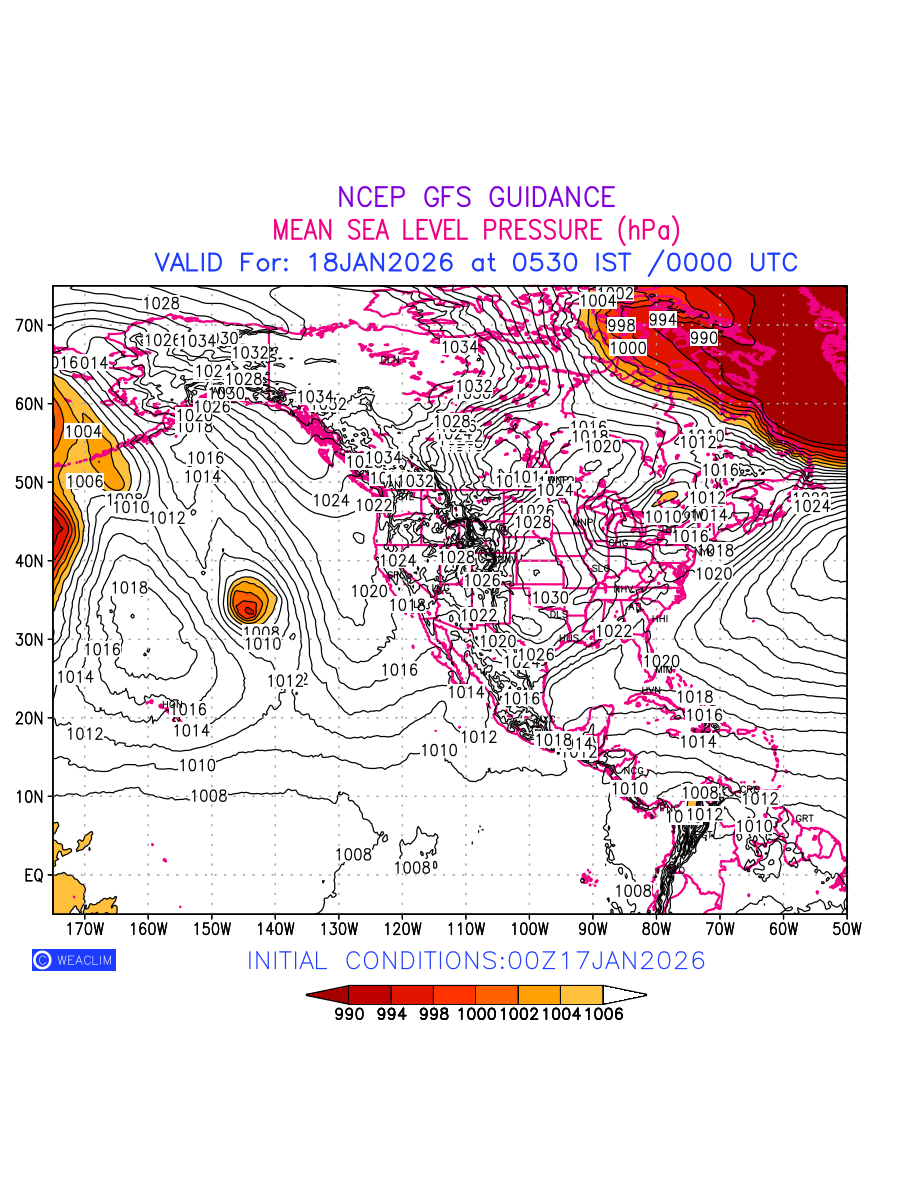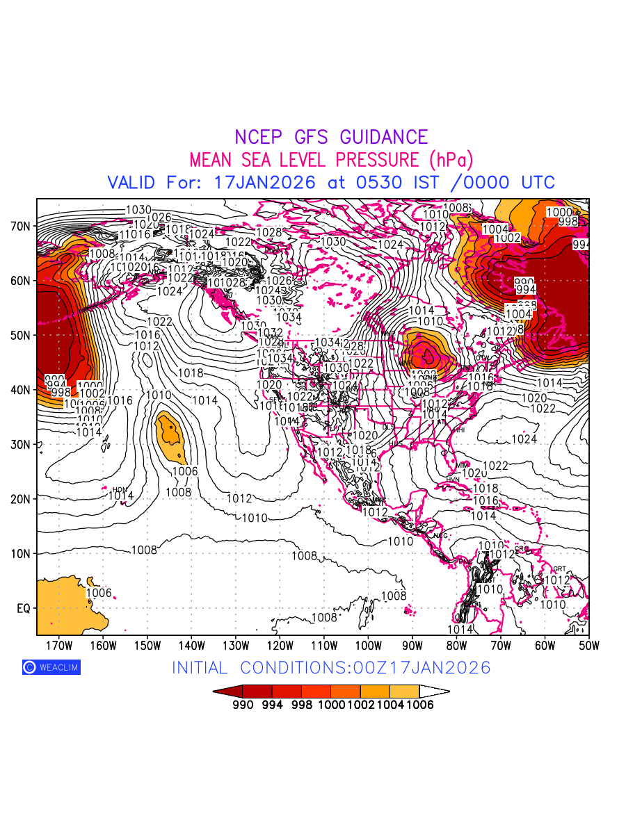 Mean Sea Level Pressure (MSLP) charts at the 24th hour for North America typically show a color-coded contour map of atmospheric pressure at sea level, with lines of equal pressure (isobars) indicating areas of high and low pressure over a geographic area. Meteorologists use these charts to identify areas of high and low pressure, which can give indications of storms, cold fronts, or warm fronts. The MSLP charts are also useful in identifying areas of convergence and divergence in the atmosphere, which can influence the formation or decay of weather systems.