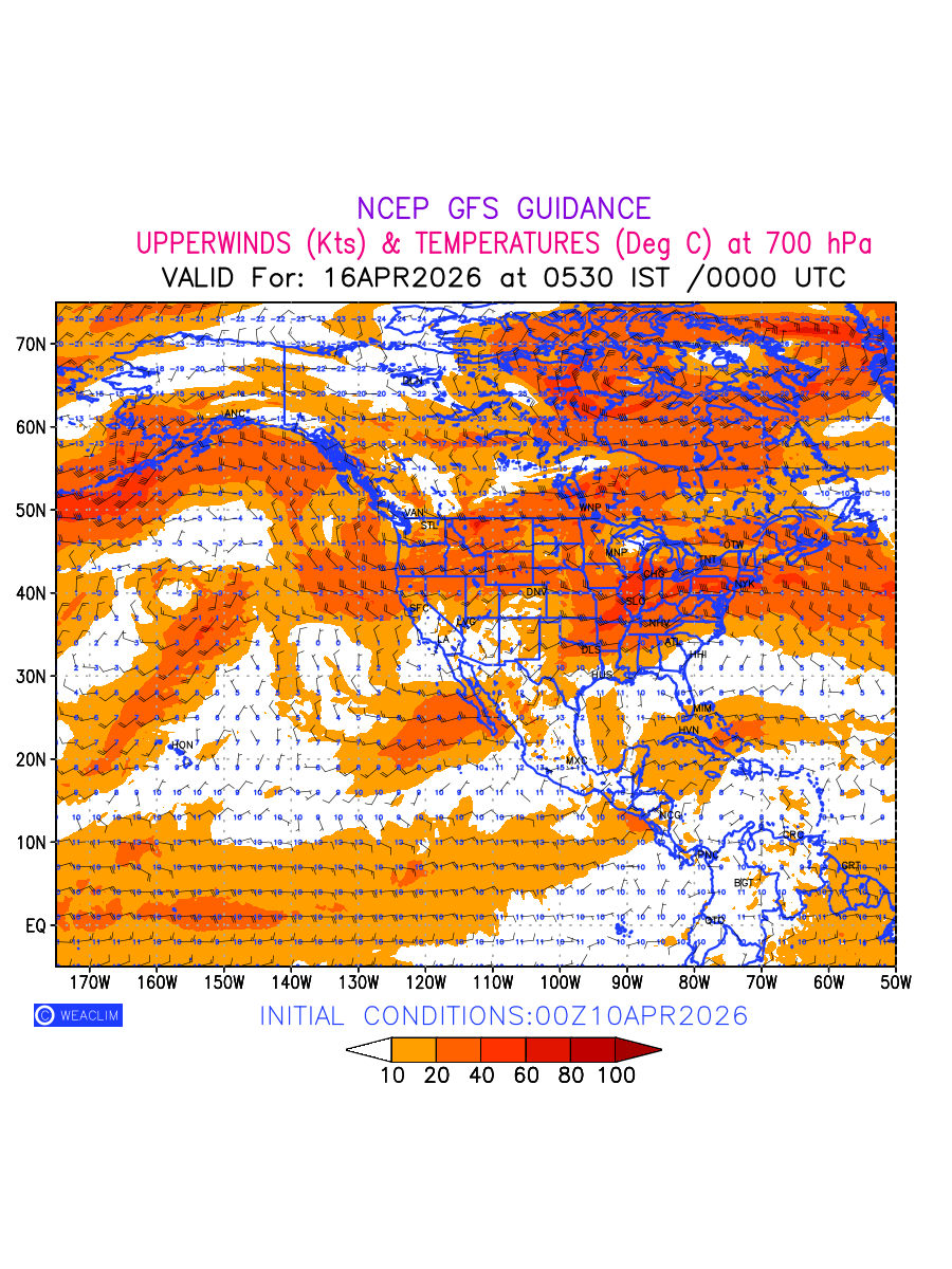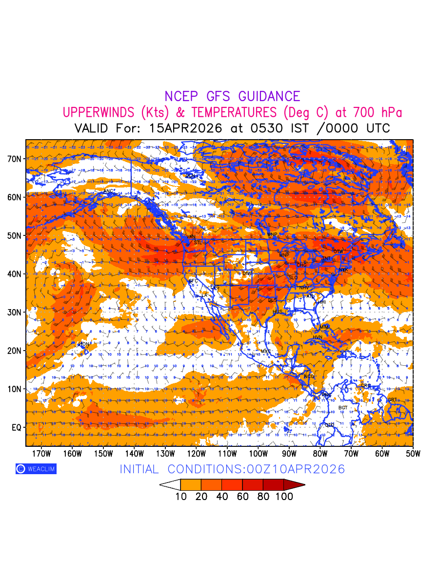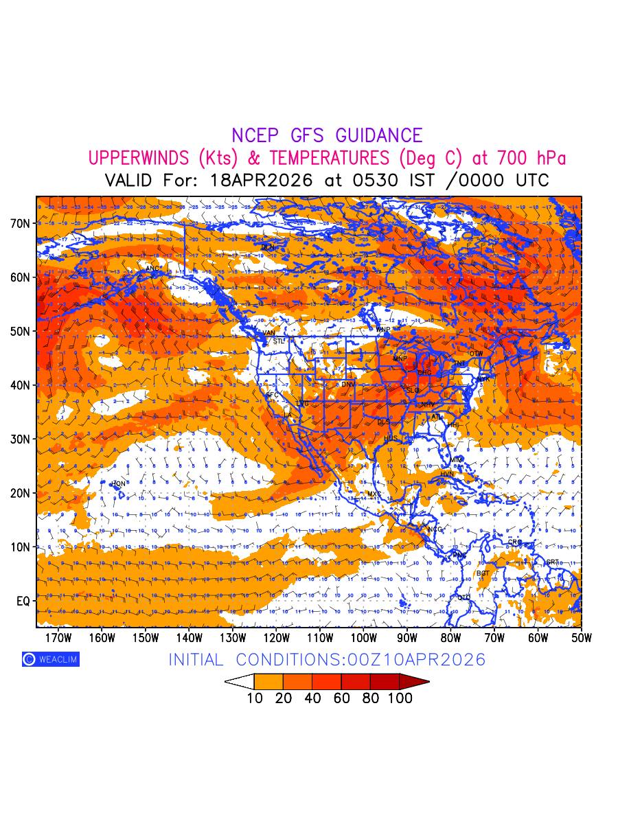 Winds at 700 hPa at the 24th hour for North America refers to the predicted wind direction and speed at a pressure level of 700 hPa, which is located in the middle troposphere (approximately 3,000 meters or 10,000 feet above the Earths surface). The winds are presented in knots (kt), and the direction is given in degrees from true north. Winds with magnitude of more than 20 kt are marked in shades of red. At this level, the wind speed and direction can influence the movement and development of weather systems such as storms, fronts, and high-pressure systems.The depiction also shows the temperature along with the wind barb on the grid points at 700 hPa. Along with the wind speed (kt) and direction, upper air temperatures (Deg C) are also shown at the grid points over the North American Region at 700 hPa level for the next ten days.