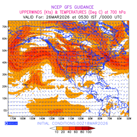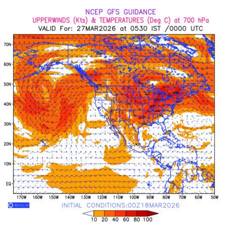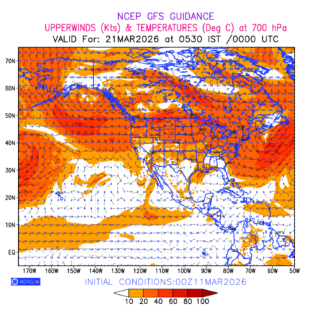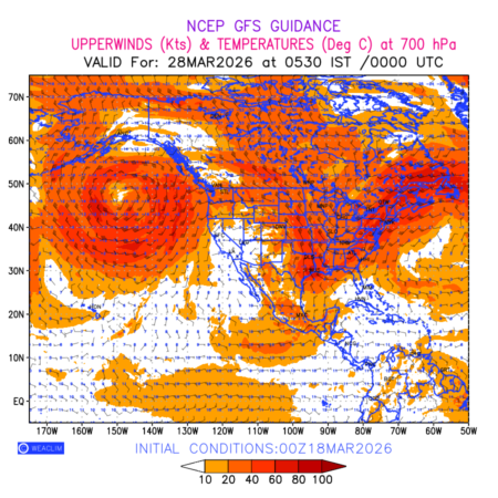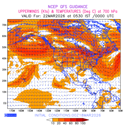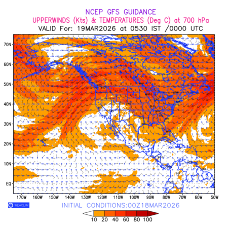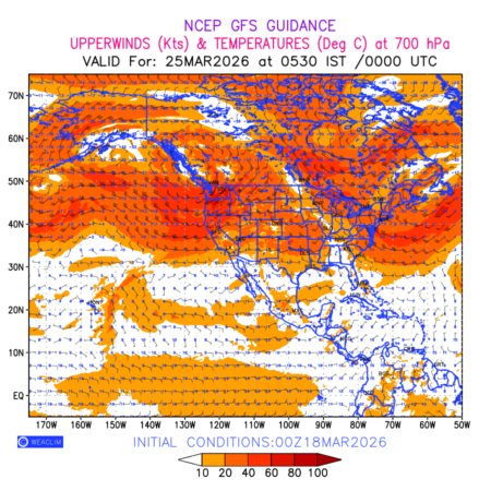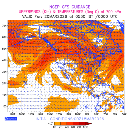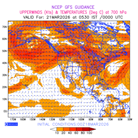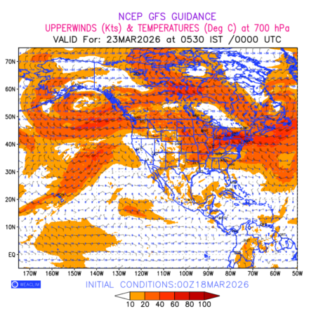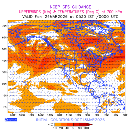 Winds at 700 hPa at the 24th hour for North America refers to the predicted wind direction and speed at a pressure level of 700 hPa, which is located in the middle troposphere (approximately 3,000 meters or 10,000 feet above the Earths surface). The winds are presented in knots (kt), and the direction is given in degrees from true north. Winds with magnitude of more than 20 kt are marked in shades of red. At this level, the wind speed and direction can influence the movement and development of weather systems such as storms, fronts, and high-pressure systems.The depiction also shows the temperature along with the wind barb on the grid points at 700 hPa. Along with the wind speed (kt) and direction, upper air temperatures (Deg C) are also shown at the grid points over the North American Region at 700 hPa level for the next ten days.