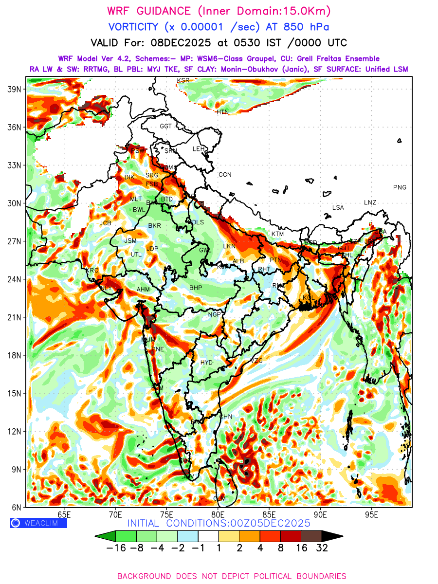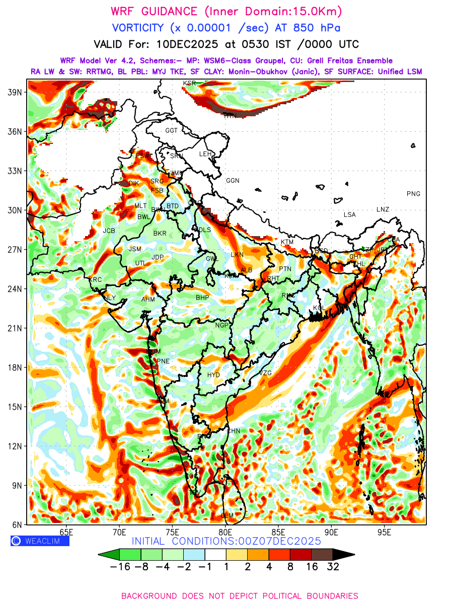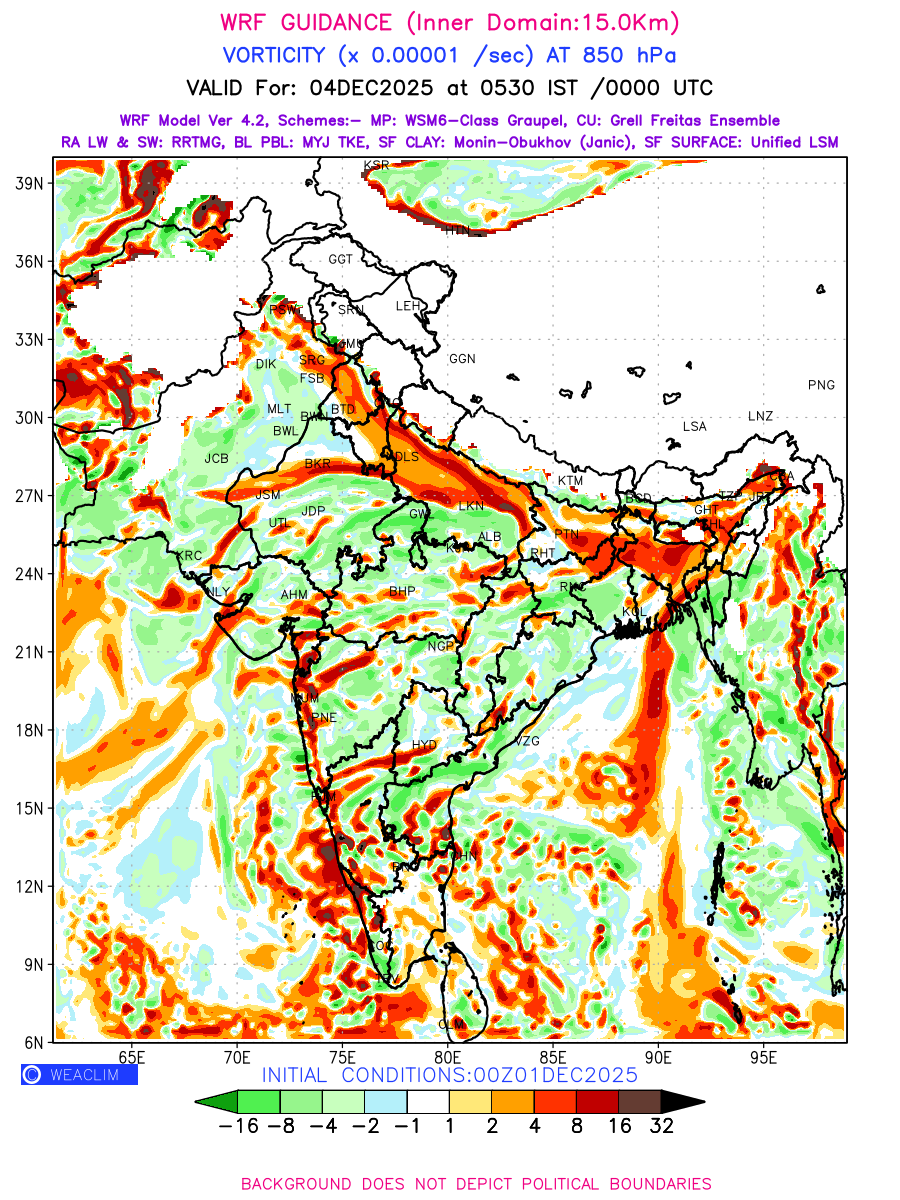 Low Level Convergence at the 24 th hour generated using WRF Ver 4.2 at a resolution of 15 Km for India is the graphical representation of the expected magnitude and pattern of horizontal rotation (or the vorticity) of atmosphere around a vertical axis or the vorticity at 850 hPa (1.5km). It is typically displayed with warm colors ranging from shades of red (to yellow) indicating positive vorticity (cyclonic rotation), and cool colors shades of green (to blue) indicating negative vorticity (anticyclonic rotation). They are useful in identifying areas of high and low vorticity, associated with weather systems such as fronts, lows, and highs etc.