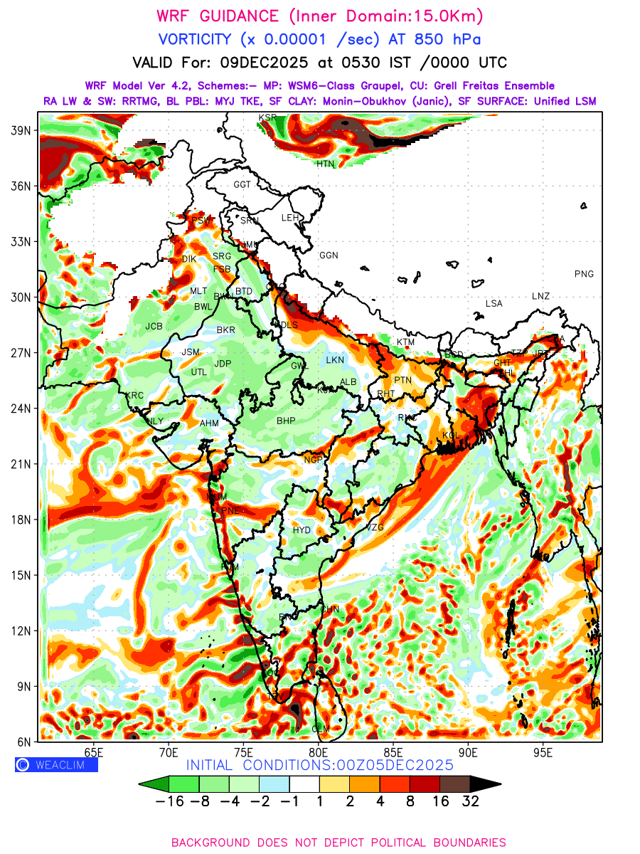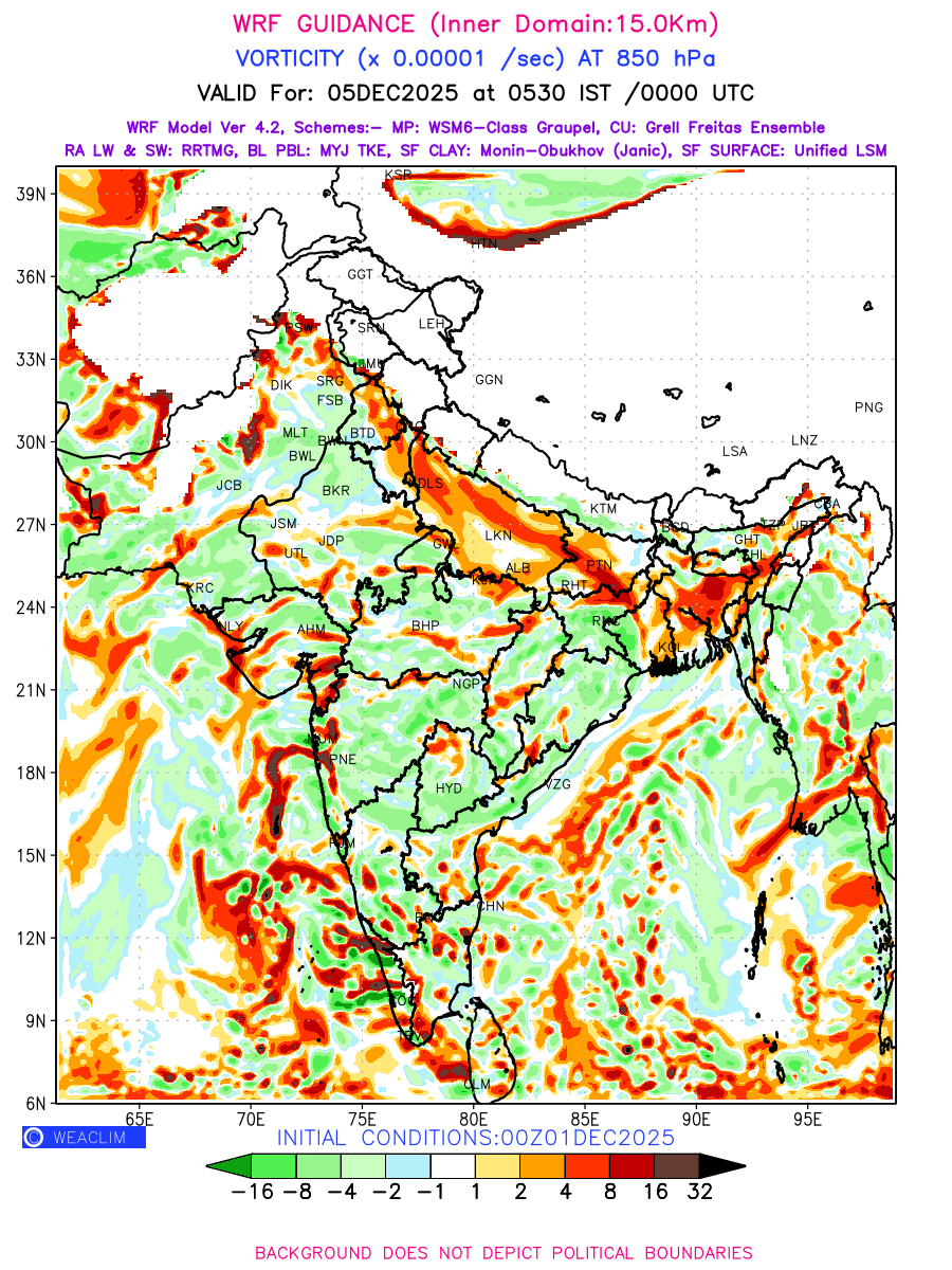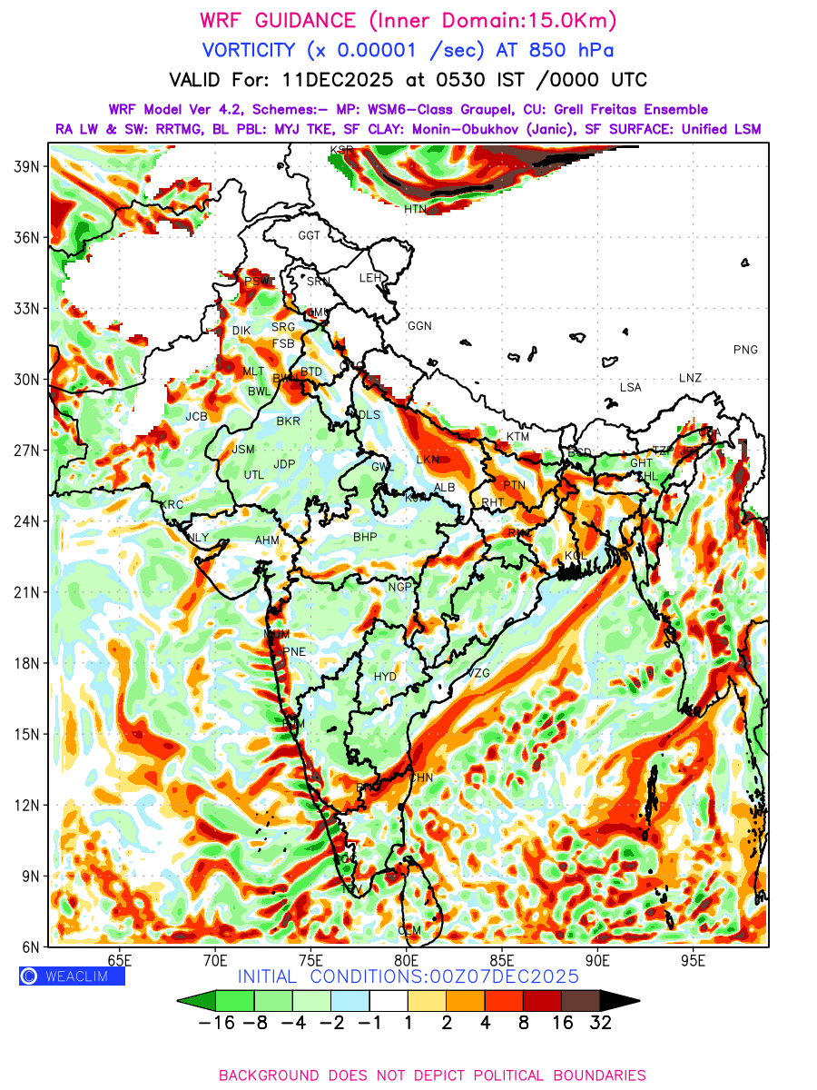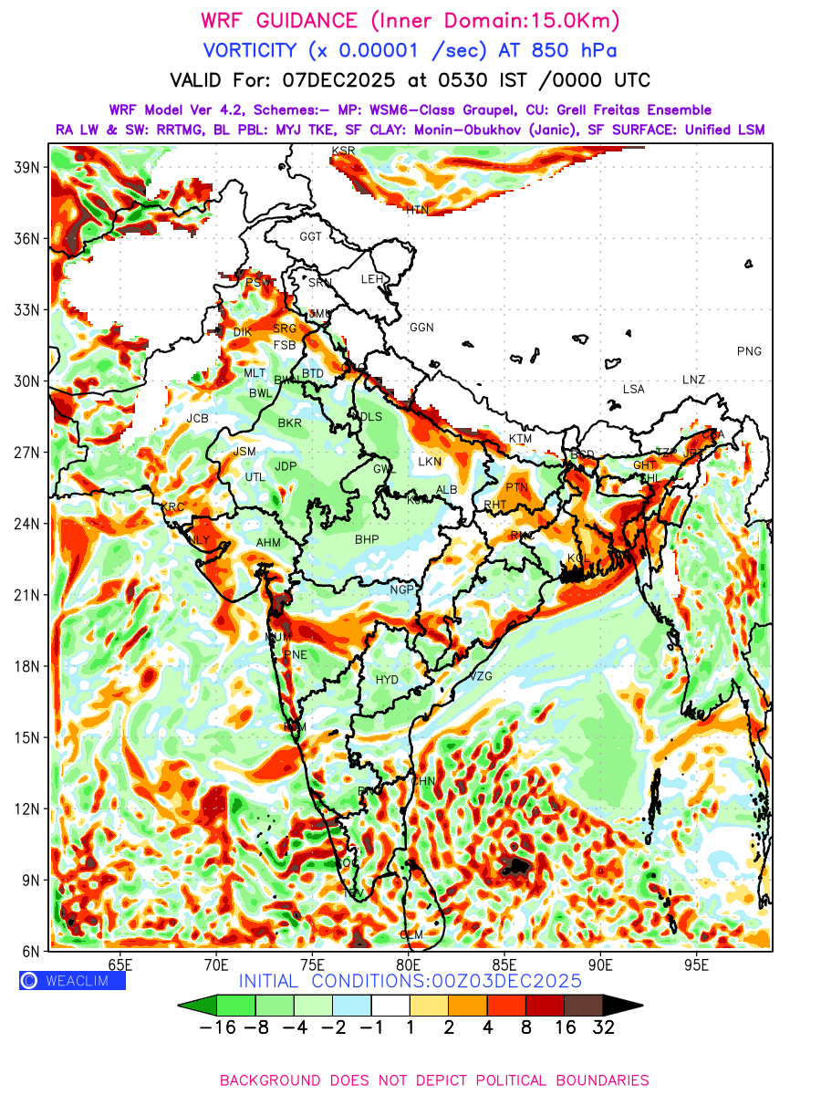 Low Level Convergence at the 24 th hour generated using WRF Ver 4.2 at a resolution of 15 Km for India is the graphical representation of the expected magnitude and pattern of horizontal rotation (or the vorticity) of atmosphere around a vertical axis or the vorticity at 850 hPa (1.5km). It is typically displayed with warm colors ranging from shades of red (to yellow) indicating positive vorticity (cyclonic rotation), and cool colors shades of green (to blue) indicating negative vorticity (anticyclonic rotation). They are useful in identifying areas of high and low vorticity, associated with weather systems such as fronts, lows, and highs etc.